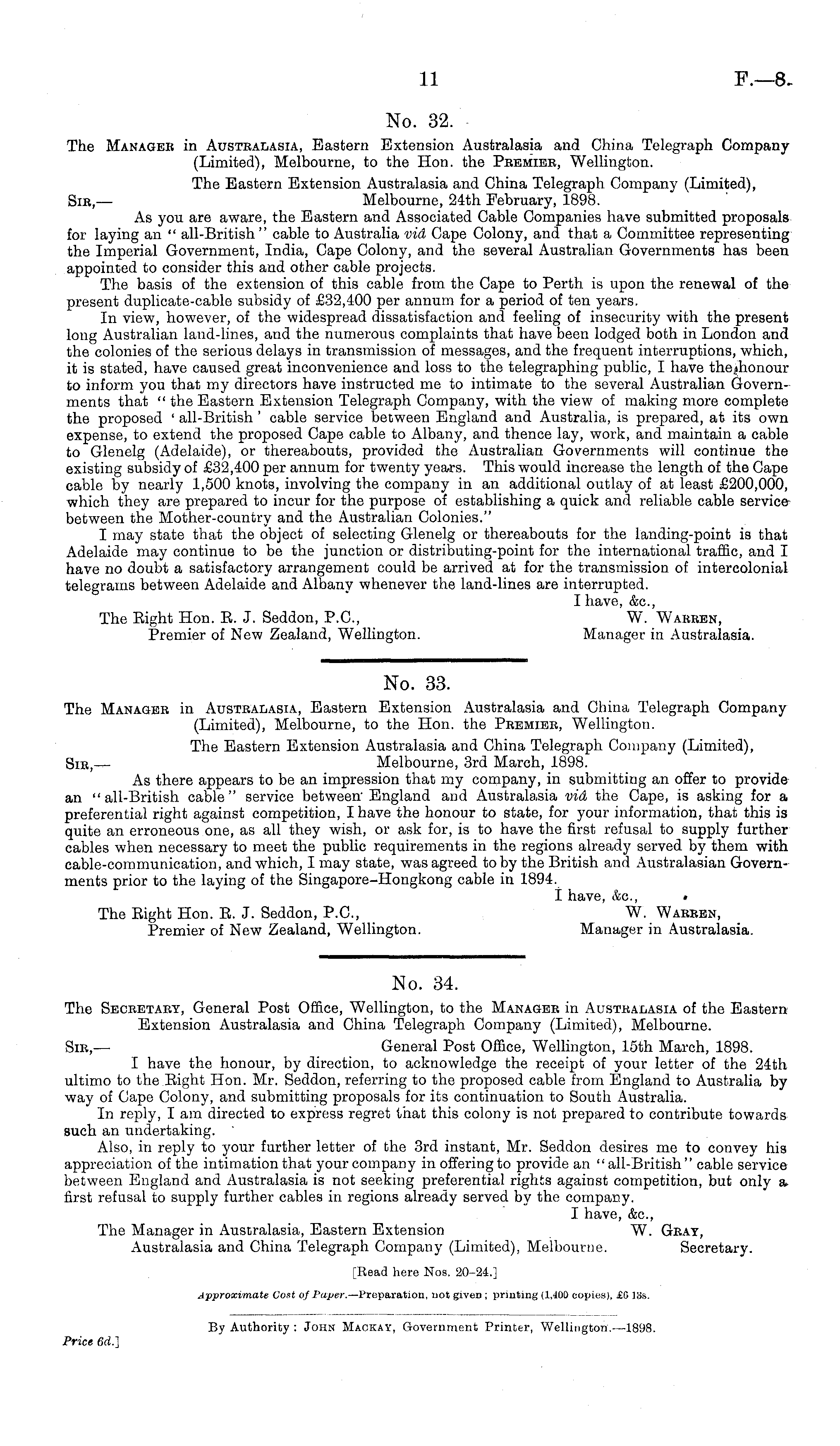 No. 33. The Manager in Australasia, Eastern Extension Australasia and China Telegraph Company (Limited), Melbourne, to the Hon. the Premier, Wellington. The Eastern Extension Australasia and China Telegraph Company (Limited), Sir,— Melbourne, 3rd March, 1898. As there appears to be an impression that my company, in submitting an offer to provide an "all-British cable" service between England and Australasia vid the Cape, is asking for a preferential right against competition, I have the honour to state, for your information, that this is quite an erroneous one, as all they wish, or ask for, is to have the first refusal to supply further cables when necessary to meet the public requirements in the regions already served by them with cable-communication, and which, I may state, was agreed to by the British and Australasian Governments prior to the laying of the Singapore-Hongkong cable in 1894. I have, &c, • The Right Hon. R. J. Seddon, P. 0., W. Warren, Premier of New Zealand, Wellington. Manager in Australasia.