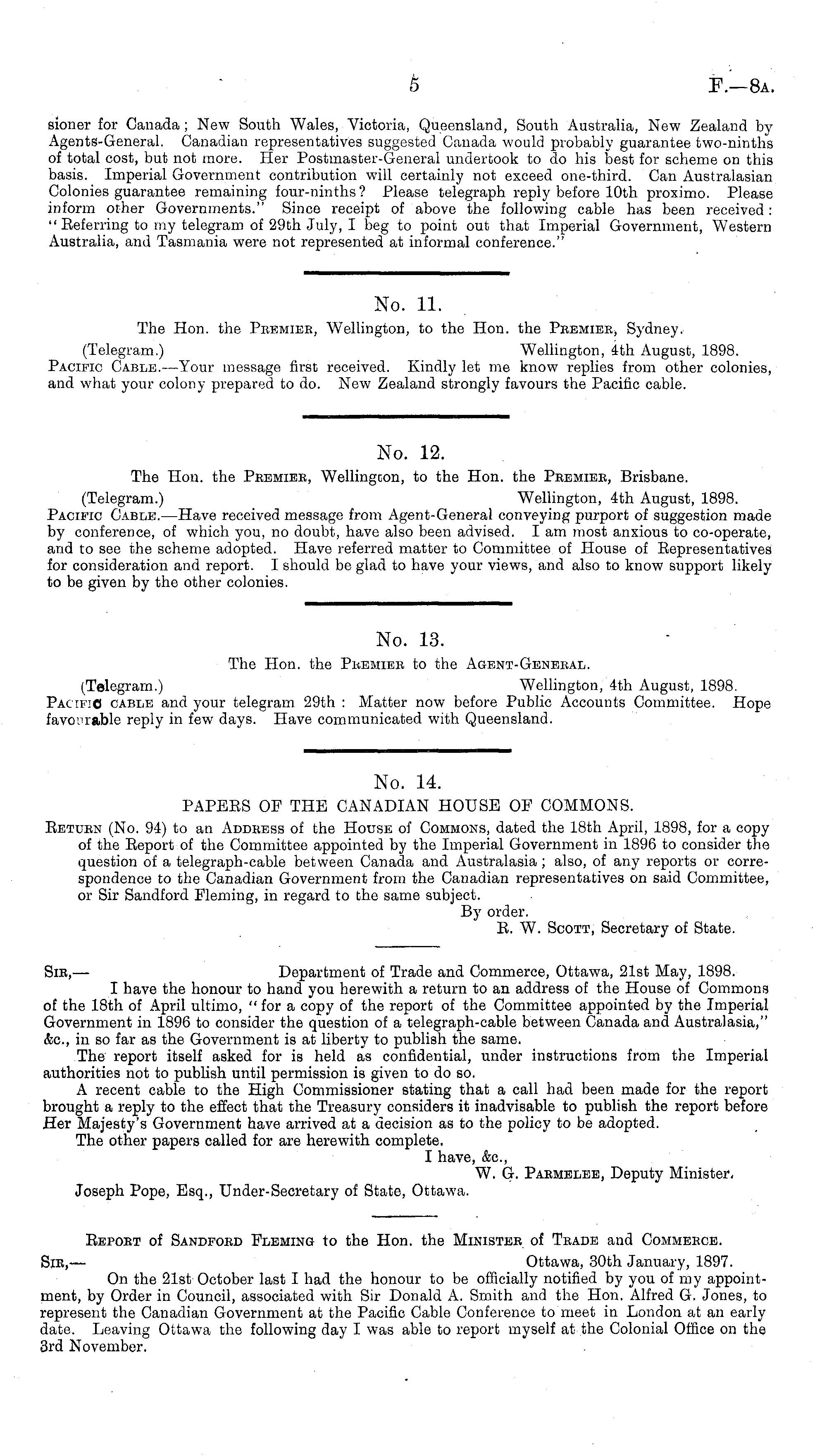 No. 13. The Hon. the Premier to the Agent-General. (Telegram.) Wellington, 4th August, 1898. Pacific cable and your telegram 29th : Matter now before Public Accounts Committee. Hope favourable reply in few days. Have communicated with Queensland.