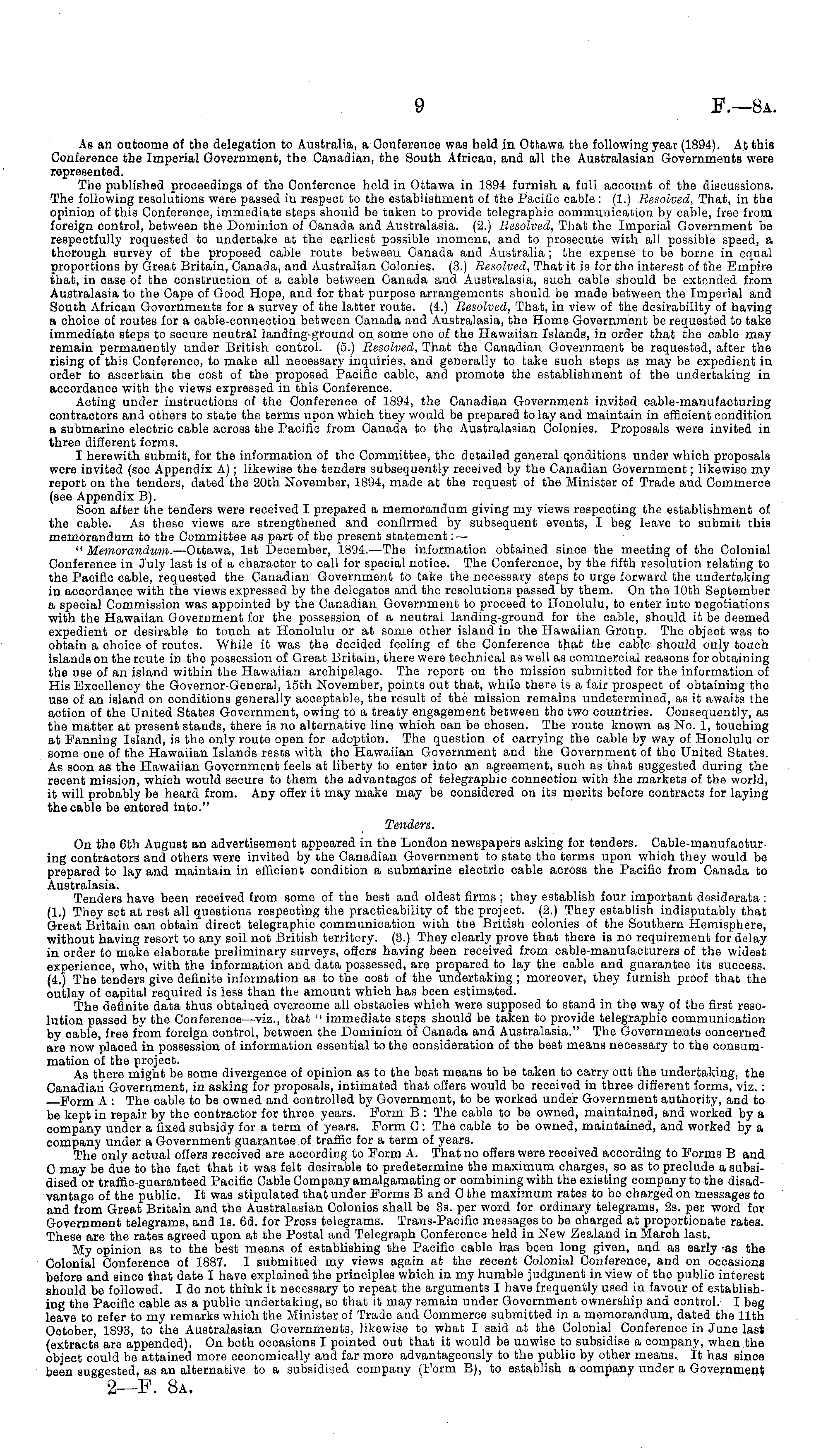 As an outcome of the delegation to Australia, a Conference was held in Ottawa the following year (1894). At this Conference the Imperial Government, the Canadian, the South African, and all the Australasian Governments were represented. The published proceedings of the Conference held in Ottawa in 1894 furnish a full account of the discussions. The following resolutions were passed in respect to the establishment of the Pacific cable : (1.) Resolved, That, in the opinion of this Conference, immediate stops should be taken to provide telegraphic communication by cable, free from foreign control, between the Dominion of Canada and Australasia. (2.) Resolved, That the Imperial Government be respectfully requested to undertake at the earliest possible moment, and to prosecute with all possible speed, a thorough survey of the proposed cable route between Canada and Australia ; the expense to be borne in equal proportions by Great Britain, Canada, and Australian Colonies. (3.) Resolved, That it is for the interest of the Empire that, in case of the construction of a cable between Canada and Australasia, such cable should be extended from Australasia to the Cape of Good Hope, and for that purpose arrangements should be made between the Imperial and South African Governments for a survey of the latter route. (4.) Resolved, That, in view of the desirability of having a choice of routes for a cable-connection between Canada and Australasia, the Home Government be requested to take immediate steps to secure neutral landing-ground on some one of the Hawaiian Islands, in order that the cable may remain permanently under British control. (5.) Resolved, That the Canadian Government be requested, after the rising of this Conference, to make all necessary inquiries, and generally to take such steps as may be expedient in order to ascertain the cost of the proposed Pacific cable, and promote the establishment of the undertaking in accordance with the views expressed in this Conference. Acting under instructions of the Conference of 1894, the Canadian Government invited cable-manufacturing contractors and others to state the terms upon which they would be prepared to lay and maintain in efficient condition a submarine electric cable across the Pacific from Canada to the Australasian Colonies. Proposals were invited in three different forms. I herewith submit, for the information of the Committee, the detailed general conditions under which proposals were invited (see Appendix A); likewise the tenders subsequently received by the Canadian Government; likewise my report on the tenders, dated the 20th November, 1894, made at the request of the Minister of Trade and Commerce (see Appendix B). Soon after the tenders were received I prepared a memorandum giving my views respecting the establishment of the cable. As these views are strengthened and confirmed by subsequent events, I beg leave to submit this memorandum to the Committee as part of the present statement: — " Memorandum. —Ottawa, Ist December, 1894.—The information obtained since the meeting of the Colonial Conference in July last is of a character to call for special notice. The Conference, by the fifth resolution relating to the Pacific cable, requested the Canadian Government to take the necessary steps to urge forward the undertaking in accordance with the views expressed by the delegates and the resolutions passed by them. On the 10th September a special Commission was appointed by the Canadian Government to proceed to Honolulu, to enter into negotiations with the Hawaiian Government for the possession of a neutral landing-ground for the cable, should it be deemed expedient or desirable to touch at Honolulu or at some other island in the Hawaiian Group. The object was to obtain a choice of routes. While it was the decided feeling of the Conference that the cable should only touch islands on the route in the possession of Great Britain, there were technical as well as commercial reasons for obtaining the use of an island within the Hawaiian archipelago. The report on the mission submitted for the information of His Excellency the Governor-General, 15th November, points out that, while there is a fair prospect of obtaining the use of an island on conditions generally acceptable, the result of the mission remains undetermined, as it awaits the action of the United States Government, owing to a treaty engagement between the two countries. Consequently, as the matter at present stands, there is no alternative line which can be chosen. The route known as No. 1, touching at Panning Island, is the only route open for adoption. The question of carrying the cable by way of Honolulu or some one of the Hawaiian Islands rests with the Hawaiian Government and the Government of the United States. As soon as the Hawaiian Government feels at liberty to enter into an agreement, such as that suggested during the recent mission, which would secure to them the advantages of telegraphic connection with the markets of the world, it will probably be heard from. Any offer it may make may be considered on its merits before contracts for laying the cable be entered into." Tenders. On the 6th August an advertisement appeared in the London newspapers asking for tenders. Cable-manufactur-ing contractors and others were invited by the Canadian Government to state the terms upon which they would be prepared to lay and maintain in efficient condition a submarine electric cable across the Pacific from Canada to Australasia. Tenders have been received from some of the best and oldest firms ; they establish four important desiderata : (1.) They set at rest all questions respecting the practicability of the project. (2.) They establish indisputably that Great Britain can obtain direct telegraphic communication with the British colonies of the Southern Hemisphere, without having resort to any soil not British territory. (3.) They clearly prove that there is no requirement for d