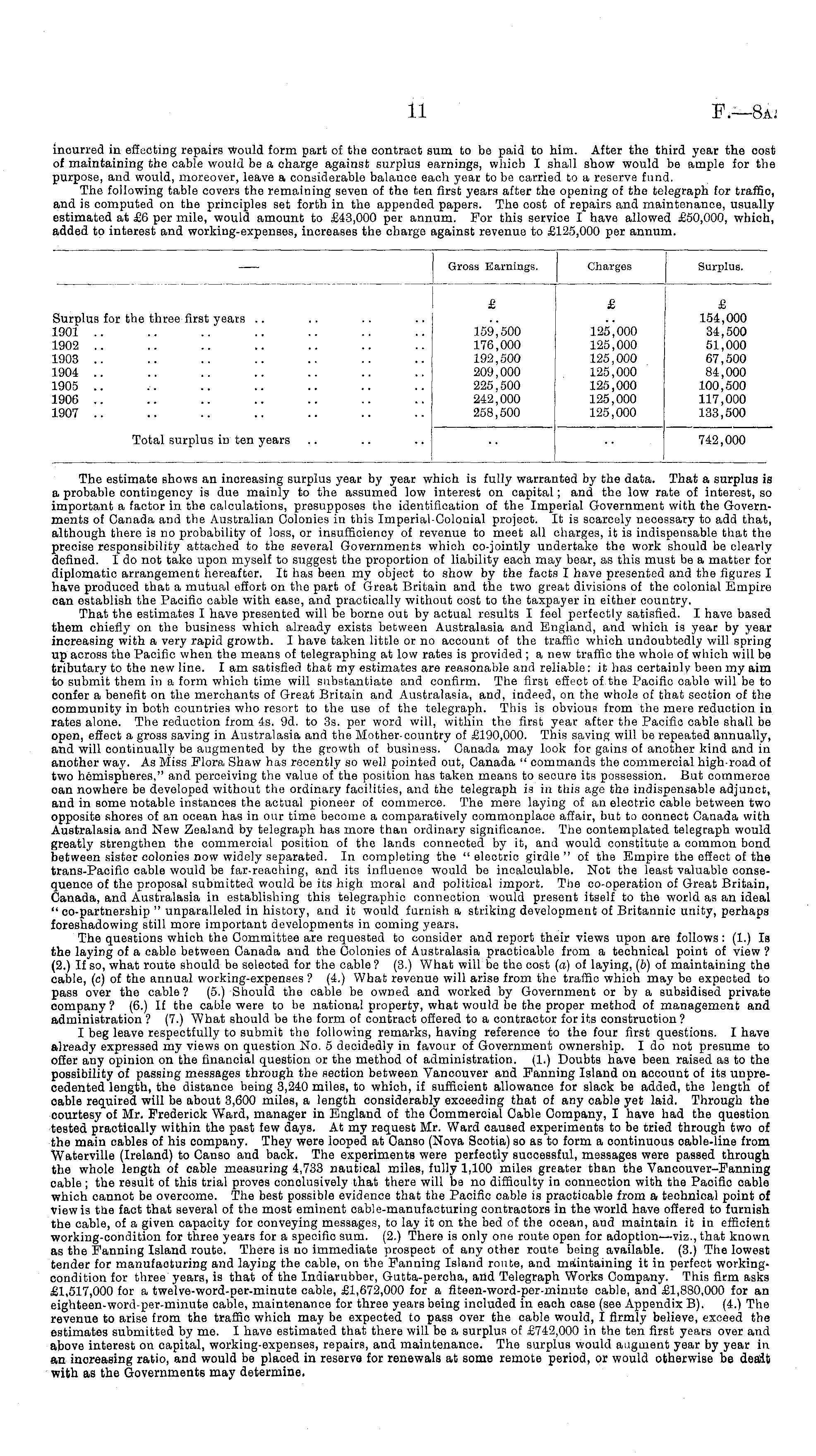 The estimate shows an increasing surplus year by year which is fully warranted by the data. That a surplus is a probable contingency is due mainly to the assumed low interest on capital; and the low rate of interest, so important a factor in the calculations, presupposes the identification of the Imperial Government with the Governments of Canada and the Australian Colonies in this Imperial-Colonial project. It is scarcely necessary to add that, although there is no probability of loss, or insufficiency of revenue to meet all charges, it is indispensable that the precise responsibility attached to the several Governments which co-jointly undertake the work should be clearly defined. Ido not take upon myself to suggest the proportion of liability each may bear, as this must be a matter for diplomatic arrangement hereafter. It has been my object to show by the facts I have presented and the figures I have produced that a mutual effort on the part of Great Britain and the two great divisions of the colonial Empire can establish the Pacific cable with ease, and practically without cost to the taxpayer in either country. That the estimates I have presented will be borne out by actual results I feel perfectly satisfied. I have based them chiefly on the business which already exists between Australasia and England, and which is year by year increasing with a very rapid growth. I have taken little or no account of the traffic which undoubtedly will spring up across the Pacific when the means of telegraphing at low rates is provided ; a new traffic the whole of which will be tributary to the new line. lam satisfied that my estimates are reasonable and reliable: it has certainly been my aim to submit them in a form which time will substantiate and confirm. The first effect of the Pacific cable will be to confer a benefit on the merchants of Great Britain and Australasia, and, indeed, on the whole of that section of the community in both countries who resort to the use of the telegraph. This is obvious from the mere reduction in rates alone. The reduction from 4s. 9d. to 3s. per word will, within the first year after the Pacific cable shall be open, effect a gross saving in Australasia and the Mother-country of £190,000. This saving will be repeated annually, and will continually be augmented by the growth of business. Canada may look for gains of another kind and in another way. As Miss Flora Shaw has recently so well pointed out, Canada " commands the commercial high-road of two hemispheres," and perceiving the value of the position has taken means to secure its possession. But commerce can nowhere be developed without the ordinary facilities, and the telegraph is in this age the indispensable adjunct, and in some notable instances the actual pioneer of commerce. The mere laying of an electric cable between two opposite shores of an ocean has in our time become a comparatively commonplace affair, but to connect Canada with Australasia and New Zealand by telegraph has more than ordinary significance. The contemplated telegraph would greatly strengthen the commercial position of the lands connected by it, and would constitute a common bond between sister colonies now widely separated. In completing the " electric girdle " of the Empire the effect of the trans-Pacific cable would be far-reaching, and its influence would be incalculable. Not the least valuable consequence of the proposal submitted would be its high moral and political import. The co-operation of Great Britain, Canada, and Australasia in establishing this telegraphic connection would present itself to the world as an ideal " co-partnership " unparalleled in history, and it would furnish a striking development of Britannic unity, perhaps foreshadowing still more important developments in coming years. The questions which the Committee are requested to consider and report their views upon are follows: (1.) Is the laying of a cable between Canada and the Colonies of Australasia practicable from a technical point of view ? (2.) If so, what route should be selected for the cable? (3.) What will be the cost (a) of laying, (6) of maintaining the cable, (c) of the annual working-expenses ? (4.) What revenue will arise from the traffic which may be expected to pass over the cable ? (5.) Should the cable be owned and worked by Government or by a subsidised private company ? (6.) If the cable were to be national property, what would be the proper method of management and administration ? (7.) What should be the form of contract offered to a contractor for its construction? I beg leave respectfully to submit the following remarks, having reference to the four first questions. I have already expressed my views on question No. 5 decidedly in favour of Government ownership. I do not presume to offer any opinion on the financial question or the method of administration. (1.) Doubts have been raised as to the possibility of passing messages through the section between Vancouver and Panning Island on account of its unprecedented length, the distance being 3,240 miles, to which, if sufficient allowance for slack be added, the length of cable required will be about 3,600 miles, a length considerably exceeding that of any cable yet laid. Through the courtesy of Mr. Frederick Ward, manager in England of the Commercial Cable Company, I have had the question tested practioally within the past few days. At my request Mr. Ward caused experiments to be tried through two of the main cables of his company. They were looped at Canso (Nova Scotia) so as to form a continuous oable-line from Waterville (Ireland) to Canso and back. The experiments were perfectly successful, messages were passed through the whole length of cable measuring 4,733 nautical miles, fully 1,100 miles greater than the Vancouver-Fanning oable ; the result of this trial proves conclusively that there will be no difficulty in connection with the Pacifio cable which cannot be overcome. The best 