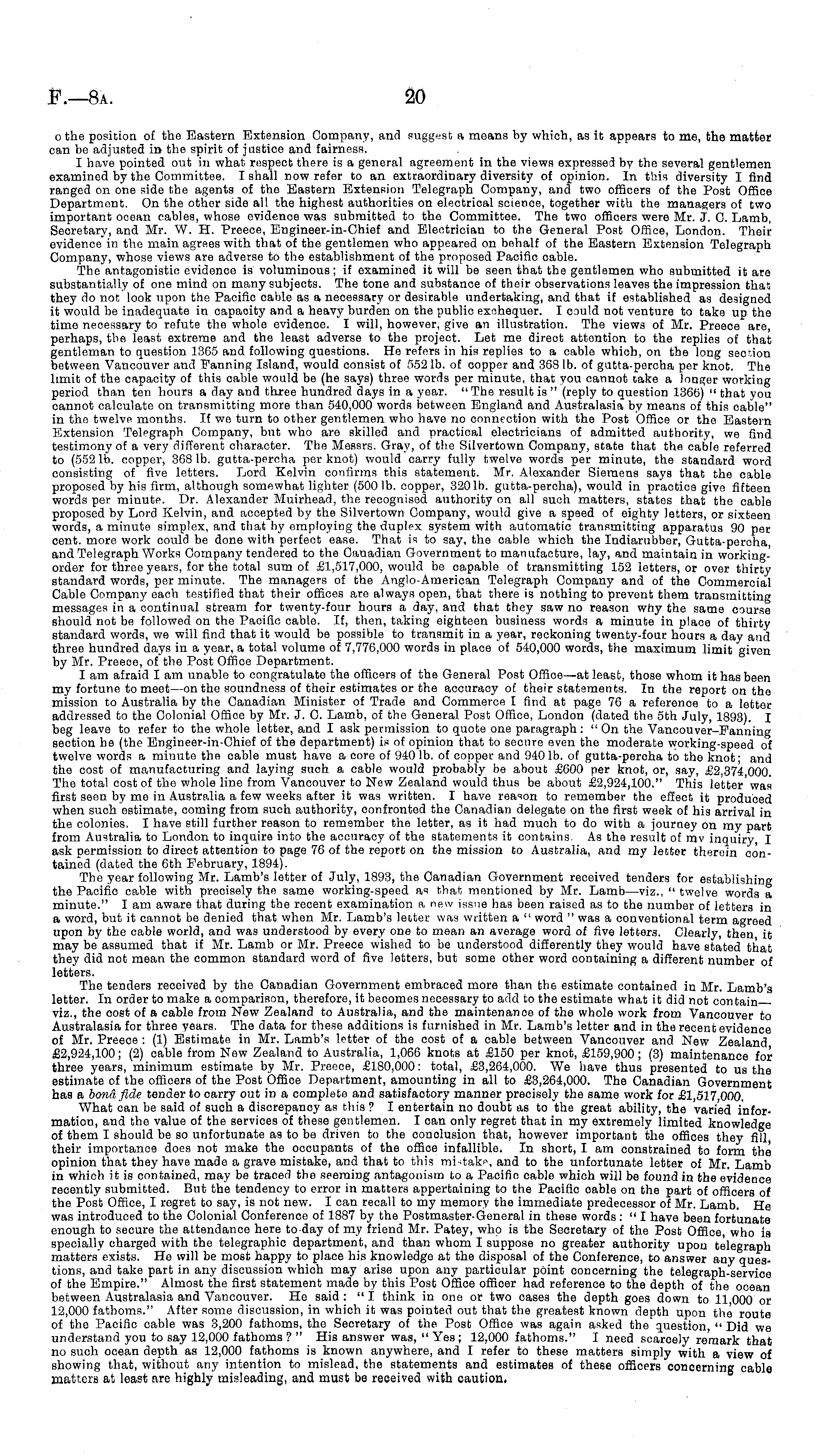 othe position of the Eastern Extension Company, and suggest a means by which, as it appears to me, the matter can be adjusted in the spirit of justice and fairness. I have pointed out in what respect there is a general agreement in the views expressed by the several gentlemen examined by the Committee. I shall now refer to an extraordinary diversity of opinion. In this diversity I find ranged on one side the agents of the Eastern Extension Telegraph Company, and two officers of the Post Office Department. On the other side all the highest authorities on electrical science, together with the managers of two important ocean cables, whose evidence was submitted to the Committee. The two officers were Mr. J. C. Lamb, Secretary, and Mr. W. H. Preece, Engineer-in-Chief and Electrician to the General Post Office, London. Their evidence in the main agrees with that of the gentlemen who appeared on behalf of the Eastern Extension Telegraph Company, whose views are adverse to the establishment of the proposed Pacific cable. The antagonistic evidence is voluminous; if examined it will be seen that the gentlemen who submitted it are substantially of one mind on many subjects. The tone and substance of their observations leaves the impression that they do not look upon the Pacific cable as a necessary or desirable undertaking, and that if established as designed it would be inadequate in capacity and a heavy burden on the public exchequer. I could not venture to take up the time necessary to refute the whole evidence. I will, however, give an illustration. The views of Mr. Preece are, perhaps, the least extreme and the least adverse to the project. Let me direct attention to the replies of that gentleman to question 1365 and following questions. He refers in his replies to a cable which, on the long sec'ion between Vancouver and Fanning Island, would consist of 552 lb. of copper and 368 lb. of gutta-percha per knot. The limit of the capacity of this cable would be (he says) three words per minute, that you cannot take a longer working period than ten hours a day and three hundred days in a year. " The result is " (reply to question 1366) " that you cannot calculate on transmitting more than 540,000 words between England and Australasia by means of this cable" in the twelve months. If we turn to other gentlemen who have no connection with the Post Office or the Eastern Extension Telegraph Company, but who are skilled and practical electricians of admitted authority, we find testimony of a very different character. The Messrs. Gray, of the Silvertown Company, state that the cable referred to (552 lb. copper, 368 lb. gutta-percha per knot) would carry fully twelve words per minute, the standard word consisting of five letters. Lord Kelvin confirms this statement. Mr. Alexander Siemens says that the cable proposed by his firm, although somewhat lighter (500 lb. copper, 3201b. gutta-percha), would in practice give fifteen words per minute. Dr. Alexander Muirhead, the recognised authority on all such matters, states that the cable proposed by Lord Kelvin, and accepted by the Silvertown Company, would give a speed of eighty letters, or sixteen words, a minute simplex, and that by employing the duplex system with automatic transmitting apparatus 90 per oent. more work could be done with perfect ease. That is to say, the cable which the Indiarubber, Gutta-percha, and Telegraph Works Company tendered to the Canadian Government to manufacture, lay, and maintain in workingorder for three years, for the total sum of £1,517,000, would be capable of transmitting 152 letters, or over thirty standard words, per minute. The managers of the Anglo-American Telegraph Company and of the Commercial Cable Company each testified that their offices are always open, that there is nothing to prevent them transmitting messages in a continual stream for twenty-four hours a day, and that they saw no reason why the same course should not be followed on the Pacific cable. If, then, taking eighteen business words a minute in place of thirty standard words, we will find that it would be possible to transmit in a year, reckoning twenty-four hours a day and three hundred days in a year, a total volume of 7,776,000 words in place of 540,000 words, the maximum limit given by Mr. Preece, of the Post Office Department. lam afraid lam unable to congratulate the officers of the General Post Office—at least, those whom it has been my fortune to meet—on the soundness of their estimates or the accuracy of their statements. In the report on the mission to Australia by the Canadian Minister of Trade and Commerce I find at page 76 a referenoe to a letter addressed to the Colonial Office by Mr. J. C. Lamb, of the General Post Office, London (dated the sth July, 1893). I beg leave to refer to the whole letter, and I ask permission to quote one paragraph: "On the Vancouver-Fanning section he (the Engineer-in-Chief of the department) is of opinion that to secure even the moderate wrorking-speed of twelve words a minute the oable must have a core of 9401b. of copper and 9401b. of gutta-percha to the knot; and the cost of manufacturing and laying such a cable would probably be about £600 per knot, or, say, £2,374,000. The total cost of the whole line from Vancouver to New Zealand would thus be about £2,924,100." This letter was first seen by me in Australia a few weeks after it was written. I have reason to remember the effect it produced when such estimate, coming from suoh authority, confronted the Canadian delegate on the first week of his arrival in the colonies. I have still further reason to remember the letter, as it had much to do with a journey on my part from Australia to London to inquire into the accuracy of the statements it contains. As the result of mv inquiry, I ask permission to direct attention to page 76 of the report on the mission to Australia, and my letter therein contained (dated the 6th February, 1894). The year following
