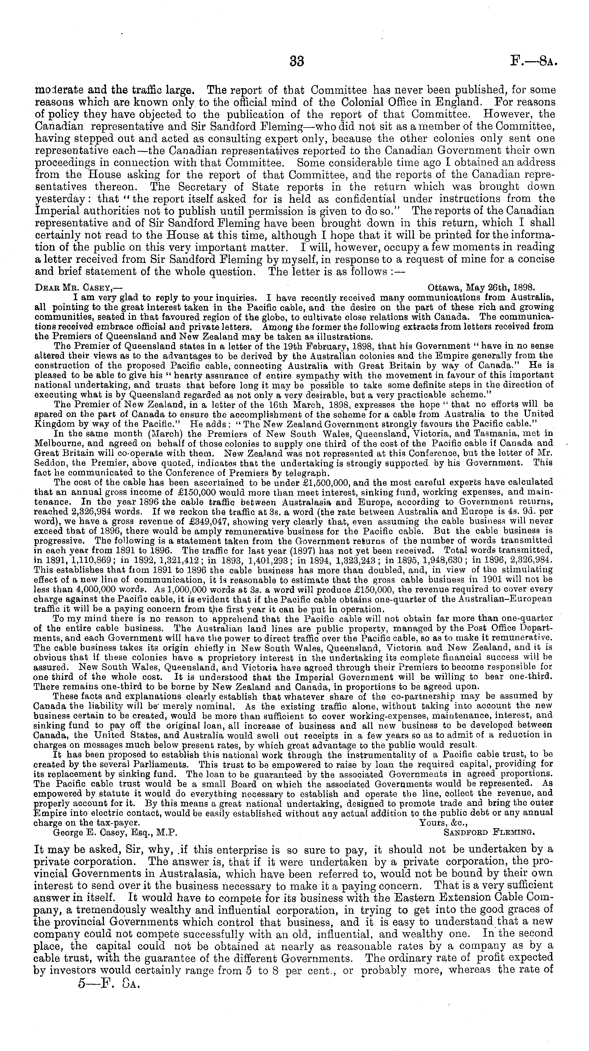 moderate and the traffic large. The report of that Committee has never been published, for some reasons which are known only to the official mind of the Colonial Office in England. For reasons of policy they have objected to the publication of the report of that Committee. However, the Canadian representative and Sir Sandford Fleming—who did not sit as a member of the Committee, having stepped out and acted as consulting expert only, because the other colonies only sent one representative each—the Canadian representatives reported to the Canadian Government their own proceedings in connection with that Committee. Some considerable time ago I obtained an address from the House asking for the report of that Committee, and the reports of the Canadian representatives thereon. The Secretary of State reports in the return which was brought down yesterday: that " the report itself asked for is held as confidential under instructions from the Imperial authorities not to publish until permission is given to do so." The reports of the Canadian representative and of Sir Sandford Fleming have been brought down in this return, which I shall certainly not read to the House at this time, although I hope that it will be printed for the information of the public on this very important matter. I will, however, occupy a few moments in reading a letter received from Sir Sandford Fleming by myself, in response to a request of mine for a concise and brief statement of the whole question. The letter is as follows : — Deab Mr. Casey,— Ottawa, May 26th, 1898. lam very glad to reply to your inquiries. I have recently received many communications from Australia, all pointing to the great interest taken in the Pacific cable, and the desire on the part of these rich and growing communities, seated in that favoured region of the globe, to cultivate close relations with Canada. The communications received embrace official and private letters. Among the former the following extracts from letters received from the Premiers of Queensland and New Zealand may be taken as illustrations. The Premier of Queensland states in a letter of the 19th February, 1898, that his Government " have in no sense altered their views as to the advantages to be derived by the Australian colonies and the Empire generally from the construction of the proposed Pacific cable, connecting Australia with Great Britain by way of Canada." He is pleased to be able to give his " hearty assurance of entire sympathy with the movement in favour of this important national undertaking, and trusts that before long it may be possible to take some definite steps in the direction of exeouting what is by Queensland regarded as not only a very desirable, but a very practicable scheme." The Premier of New Zealand, in a letter of the 16th March, 1898, expresses the hope " that no efforts will be spared on the part of Canada to ensure the accomplishment of the scheme for a cable from Australia to the United Kingdom by way of the Pacific." He adds : " The New Zealand Government strongly favours the Pacific cable." In the same month (March) the Premiers of New South Wales, Queensland, Victoria, and Tasmania, met in Melbourne, and agreed on behalf of those colonies to supply one third of the cost of the Pacific cable if Canada and Great Britain will co-operate with them. New Zealand was not represented at this Conference, but the letter of Mr. Seddon, the Premier, above quoted, indicates that the undertaking is strongly supported by his Government. This fact he communicated to the Conference of Premiers by telegraph. The oost of the cable has been ascertained to be under £1,500,000, and the most careful experts have calculated that an annual gross income of £150,000 would more than meet interest, sinking fund, working expenses, and maintenance. In the year 1896 the cable traffic between Australasia and Europe, according to Government returns, reached 2,326,984 words. If we reckon the traffic at 3s. a word (the rate between Australia and Europe is 4s. 9d. per word), we have a gross revenue of £349,047, showing very clearly that, even assuming the cable business will never exceed that of 1896, there would be amply remunerative business for the Pacific cable. But the cable business is progressive. The following is a statement taken from the Government returns of the number of words transmitted in each year from 1891 to 1896. The traffic for last year (1897) has not yet been received. Total words transmitted, in 1891, 1,110,869; in 1892, 1,321,412 ;in 1893, 1,401,298; in 1894, 1,323,243 ; in 1895, 1,948,630 ;in 1896, 2,326,984. This establishes that from 1891 to 1896 the cable business has more than doubled, and, in view of the stimulating effect of a new line of communication, it is reasonable to estimate that the gross cable business in 1901 will not be less than 4,000,000 words. As 1,000,000 words at 3s. a word will produce £150,000, the revenue required to cover every charge against the Pacifio cable, it is evident that if the Pacific cable obtains one-quarter of the Australian-European traffic it will be a paying concern from the first year it can be put in operation. To my mind there is no reason to apprehend that the Pacific cable will not obtain far more than one-quarter of the entire cable business. The Australian land lines are public property, managed by the Post Office Departments, and each Government will have the power to direct traffic over the Pacific cable, so as to make it remunerative. The cable business takes its origin chiefly in New South Wales, Queensland, Victoria and New Zealand, and it is obvious that if these colonies have a proprietory interest in the undertaking its complete financial success will be assured. New South Wales, Queensland, and Victoria have agreed through their Premiers to become responsible for one third of the whole cost. It is understood that the Imperial Government will be willing to bear one-third. There remains o