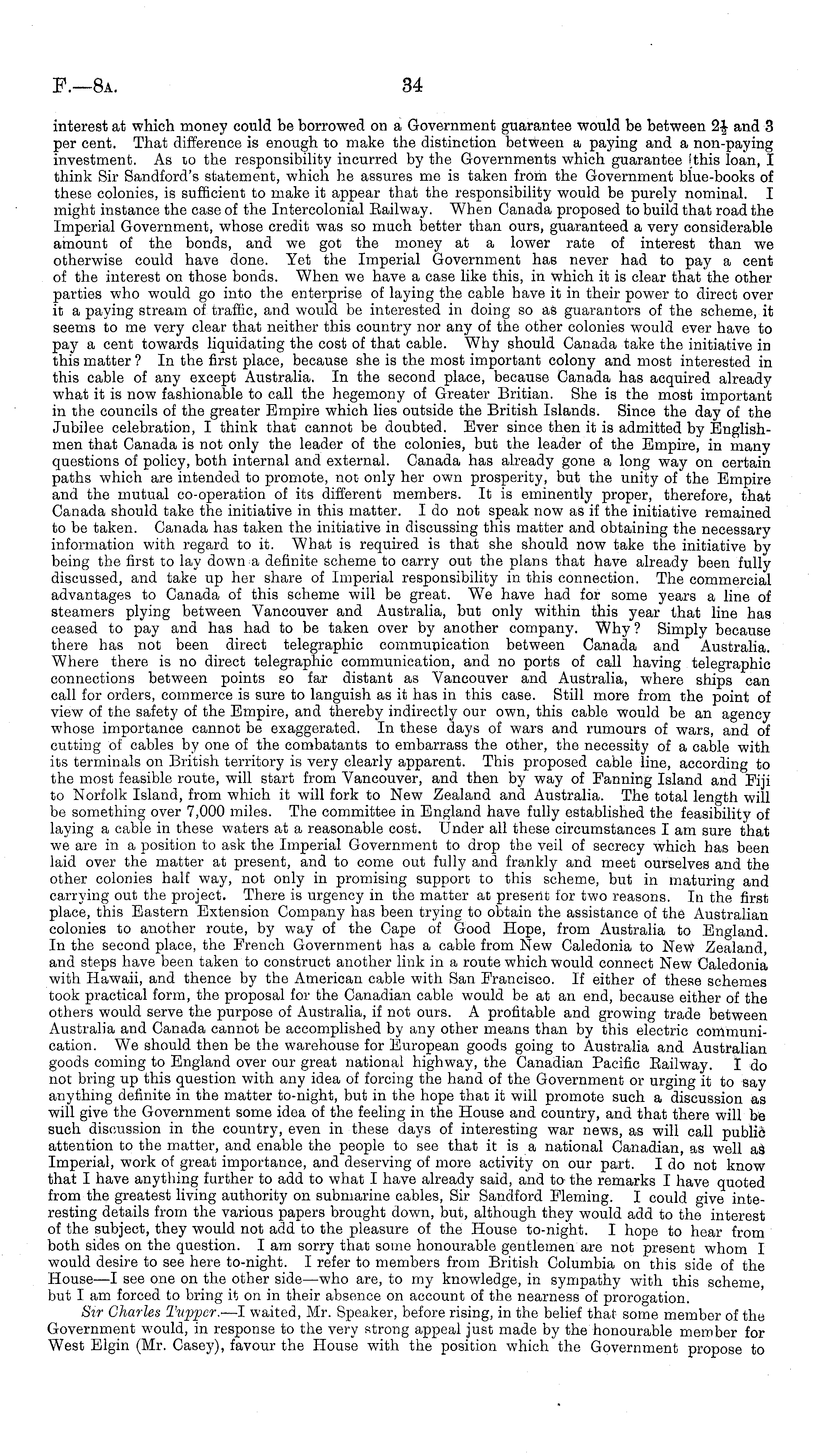 interest at which money could be borrowed on a Government guarantee would be between 2J and 3 per cent. That difference is enough to make the distinction between a paying and a non-paying investment. As to the responsibility incurred by the Governments which guarantee (this loan, I think Sir Sandford's statement, which he assures me is taken from the Government blue-books of these colonies, is sufficient to make it appear that the responsibility would be purely nominal. I might instance the case of the Intercolonial Railway. When Canada proposed to build that road the Imperial Government, whose credit was so much better than ours, guaranteed a very considerable amount of the bonds, and we got the money at a lower rate of interest than we otherwise could have done. Yet the Imperial Government has never had to pay a cent of the interest on those bonds. When we have a case like this, in which it is clear that the other parties who would go into the enterprise of laying the cable have it in their power to direct over it a paying stream of traffic, and would be interested in doing so as guarantors of the scheme, it seems to me very clear that neither this country nor any of the other colonies would ever have to pay a cent towards liquidating the cost of that cable. Why should Canada take the initiative in this matter ? In the first place, because she is the most important colony and most interested in this cable of any except Australia. In the second place, because Canada has acquired already what it is now fashionable to call the hegemony of Greater Britian. She is the most important in the councils of the greater Empire which lies outside the British Islands. Since the day of the Jubilee celebration, I think that cannot be doubted. Ever since then it is admitted by Englishmen that Canada is not only the leader of the colonies, but the leader of the Empire, in many questions of policy, both internal and external. Canada has already gone a long way on certain paths which are intended to promote, not only her own prosperity, but the unity of the Empire and the mutual co-operation of its different members. It is eminently proper, therefore, that Canada should take the initiative in this matter. Ido not speak now as if the initiative remained to be taken. Canada has taken the initiative in discussing this matter and obtaining the necessary information with regard to it. What is required is that she should now take the initiative by being the first to lay down a definite scheme to carry out the plans that have already been fully discussed, and take up her share of Imperial responsibility in this connection. The commercial advantages to Canada of this scheme will be great. W 7 e have had for some years a line of steamers plying between Vancouver and Australia, but only within this year that line has ceased to pay and has had to be taken over by another company. Why ? Simply because there has not been direct telegraphic communication between Canada and Australia. Where there is no direct telegraphic communication, and no ports of call having telegraphic connections between points so far distant as Vancouver and Australia, where ships can call for orders, commerce is sure to languish as it has in this case. Still more from the point of view of the safety of the Empire, and thereby indirectly our own, this cable would be an agency whose importance cannot be exaggerated. In these days of wars and rumours of wars, and of cutting of cables by one of the combatants to embarrass the other, the necessity of a cable with its terminals on British territory is very clearly apparent. This proposed cable line, according to the most feasible route, will start from Vancouver, and then by way of Fanning Island and Fiji to Norfolk Island, from which it will fork to New Zealand and Australia. The total length will be something over 7,000 miles. The committee in England have fully established the feasibility of laying a cable in these waters at a reasonable cost. Under all these circumstances lam sure that we are in a position to ask the Imperial Government to drop the veil of secrecy which has been laid over the matter at present, and to come out fully and frankly and meet ourselves and the other colonies half way, not only in promising support to this scheme, but in maturing and carrying out the project. There is urgency in the matter at present lor two reasons. In the first place, this Eastern Extension Company has been trying to obtain the assistance of the Australian colonies to another route, by way of the Cape of Good Hope, from Australia to England. In the second place, the French Government has a cable from New Caledonia to New Zealand and steps have been taken to construct another link in a route which would connect New Caledonia with Hawaii, and thence by the American cable with San Francisco. If either of these schemes took practical form, the proposal for the Canadian cable would be at an end, because either of the others would serve the purpose of Australia, if not ours. A profitable and growing trade between Australia and Canada cannot be accomplished by any other means than by this electric communication. We should then be the warehouse for European goods going to Australia and Australian goods coming to England over our great national highway, the Canadian Pacific Railway. Ido not bring up this question with any idea of forcing the hand of the Government or urging it to say anything definite in the matter to-night, but in the hope that it will promote such a discussion as will give the Government some idea of the feeling in the House and country, and that there will be such discussion in the country, even in these days of interesting war news, as will call public attention to the matter, and enable the people to see that it is a national Canadian, as well aS Imperial, work of great importance, and deserving of more activity on our part. Ido not know that I have anything further to add to what I have 