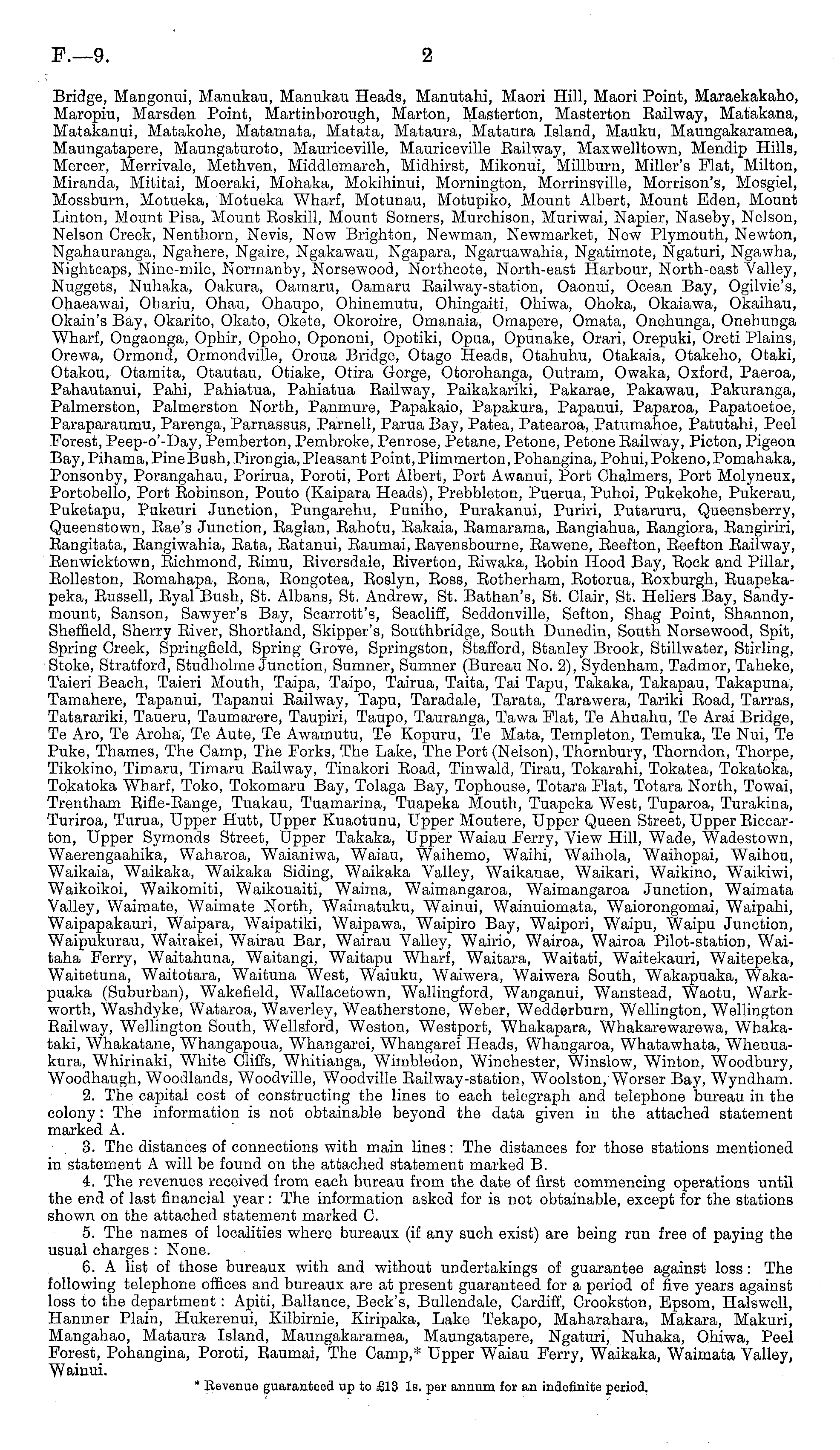 Bridge, Mangonui, Manukau, Manukau Heads, Manutahi, Maori Hill, Maori Point, Maraekakaho, Maropiu, Marsden Point, Martinborough, Marton, Masterton, Masterton Railway, Matakana, Matakanui, Matakohe, Matamata, Matata, Mataura, Mataura Island, Mauku, Maungakaramea, Maungatapere, Maungaturoto, Mauriceville, Mauriceville Railway, Maxwelltown, Mendip Hills, Mercer, Merrivale, Methven, Middlemarch, Midhirst, Mikonui, Millburn, Miller's Flat, Milton, Miranda, Mititai, Moeraki, Mohaka, Mokihinui, Mornington, Morrinsville, Morrison's, Mosgiel, Mossburn, Motueka, Motueka Wharf, Motunau, Motupiko, Mount Albert, Mount Eden, Mount Linton, Mount Pisa, Mount Roskill, Mount Somers, Murchison, Muriwai, Napier, Naseby, Nelson, Nelson Creek, Nenthorn, Nevis, New Brighton, Newman, Newmarket, New Plymouth, Newton, Ngahauranga, Ngahere, Ngaire, Ngakawau, Ngapara, Ngaruawahia, Ngatimote, Ngaturi, Ngawha, Nightcaps, Nine-mile, Normanby, Norsewood, Northcote, North-east Harbour, North-east Valley, Nuggets, Nuhaka, Oakura, Oamaru, Oamaru Railway-station, Oaonui, Ocean Bay, Ogilvie's, Ohaeawai, Ohariu, Ohau, Ohaupo, Ohinemutu, Ohingaiti, Ohiwa, Ohoka, Okaiawa, Okaihau, Okain's Bay, Okarito, Okato, Okete, Okoroire, Omanaia, Omapere, Omata, Onehunga, Onehunga Wharf, Ongaonga, Ophir, Opoho, Opononi, Opotiki, Opua, Opunake, Orari, Orepuki, Oreti Plains, Orewa, Ormond, Ormondville, Oroua Bridge, Otago Heads, Otahuhu, Otakaia, Otakeho, Otaki, Otakou, Otamita, Otautau, Otiake, Otira Gorge, Otorohanga, Outram, Owaka, Oxford, Paeroa, Pahautanui, Pahi, Pahiatua, Pahiatua Railway, Paikakariki, Pakarae, Pakawau, Pakuranga, Palmerston, Palmerston North, Panmure, Papakaio, Papakura, Papanui, Paparoa, Papatoetoe, Paraparaumu, Parenga, Parnassus, Parnell, Parua Bay, Patea, Patearoa, Patumahoe, Patutahi, Peel Forest, Peep-o'-Day, Pemberton, Pembroke, Penrose, Petane, Petone, Petone Railway, Picton, Pigeon Bay, Pihama, Pine Bush, Pirongia, Pleasant Point, Plimmerton, Pohangina, Pohui, Pokeno, Pomahaka, Ponsonby, Porangahau, Porirua, Poroti, Port Albert, Port Awanui, Port Chalmers, Port Molyneux, Portobello, Port Robinson, Pouto (Kaipara Heads), Prebbleton, Puerua, Puhoi, Pukekohe, Pukerau, Puketapu, Pukeuri Junction, Pungarehu, Puniho, Purakanui, Puriri, Putaruru, Queensberry, Queenstown, Rae's Junction, Raglan, Rahotu, Rakaia, Ramarama, Rangiahua, Rangiora, Rangiriri, Rangitata, Rangiwahia, Rata, Ratanui, Raumai, Ravensbourne, Rawene, Reefton, Reefton Railway, Renwicktown, Richmond, Rimu, Riversdale, Riverton, Riwaka, Robin Hood Bay, Rock and Pillar, Rolleston, Romahapa, Rona, Rongotea, Roslyn, Ross, Rotherham, Rotorua, Roxburgh, Ruapekapeka, Russell, Ryal Bush, St. Albans, St. Andrew, St. Bathan's, St. Clair, St. Heliers Bay, Sandymount, Sanson, Sawyer's Bay, Scarrott's, Seacliff, Seddonville, Sefton, Shag Point, Shannon, Sheffield, Sherry River, Shortland, Skipper's, Southbridge, South Dunedin, South Norsewood, Spit, Spring Creek, Springfield, Spring Grove, Springston, Stafford, Stanley Brook, Stillwater, Stirling, Stoke, Stratford, Studholme Junction, Sumner, Sumner (Bureau No. 2), Sydenham, Tadmor, Taheke, Taieri Beach, Taieri Mouth, Taipa, Taipo, Tairua, Taita, Tai Tapu, Takaka, Takapau, Takapuna, Tamahere, Tapanui, Tapanui Railway, Tapu, Taradale, Tarata, Tarawera, Tariki Road, Tarras, Tatarariki, Taueru, Taumarere, Taupiri, Taupo, Tauranga, Tawa Flat, Te Ahuahu, Te Arai Bridge, Te Aro, Te Aroha, Te Aute, Te Awamutu, Te Kopuru, Te Mata, Templeton, Temuka, Te Nui, Te Puke, Thames, The Camp, The Forks, The Lake, The Port (Nelson), Thornbury, Thorndon, Thorpe, Tikokino, Timaru, Timaru Railway, Tinakori Road, Tinwald, Tirau, Tokarahi, Tokatea, Tokatoka, Tokatoka Wharf, Toko, Tokomaru Bay, Tolaga Bay, Tophouse, Totara Flat, Totara North, Towai, Trentham Rifle-Range, Tuakau, Tuamarina, Tuapeka Mouth, Tuapeka West, Tuparoa, Turakina, Turiroa, Turua, Upper Hutt, Upper Kuaotunu, Upper Moutere, Upper Queen Street, Upper Riccarton, Upper Symonds Street, Upper Takaka, Upper Waiau Ferry, View Hill, Wade, Wadestown, Waerengaahika, Waharoa, Waianiwa, Waiau, Waihemo, Waihi, Waihola, Waihopai, Waihou, Waikaia, Waikaka, Waikaka Siding, Waikaka Valley, Waikanae, Waikari, Waikino, Waikiwi, Waikoikoi, Waikomiti, Waikouaiti, Waima, Waimangaroa, Waimangaroa Junction, Waimata Valley, Waimate, Waimate North, Waimatuku, Wainui, Wainuiomata, Waiorongomai, Waipahi, Waipapakauri, Waipara, Waipatiki, Waipawa, Waipiro Bay, Waipori, Waipu, Waipu Junction, Waipukurau, Wairakei, Wairau Bar, Wairau Valley, Wairio, Wairoa, Wairoa Pilot-station, Waitaha Ferry, Waitahuna, Waitangi, Waitapu Wharf, Waitara, Waitati, Waitekauri, Waitepeka, Waitetuna, Waitotara, Waituna West, Waiuku, Waiwera, Waiwera South, Wakapuaka, Wakapuaka (Suburban), Wakefield, Wallacetown, Wallingford, Wanganui, Wanstead, Waotu, Warkworth, Washdyke, Wataroa, Waverley, Weatherstone, Weber, Wedderburn, Wellington, Wellington Railway, Wellington South, Wellsford, Weston, Westport, Whakapara, Whakarewarewa, Whakataki, Whakatane, Whangapoua, Whangarei, Whangarei Heads, Whangaroa, Whatawhata, Whenuakura, Whirinaki, White Cliffs, Whitianga, Wimbledon, Winchester, Winslow, Winton, Woodbury, Woodhaugh, Woodlands, Woodville, Woodville Railway-station, Woolston, Worser Bay, Wyndham. 2. The capital cost of constructing the lines to each telegraph and telephone bureau in the colony: The information is not obtainable beyond the data given in the attached statement marked A. 3. The distances of connections with main lines: The distances for those stations mentioned in statement A will be found on the attached statement marked B. 4. The revenues received from each bureau from the date of first commencing operations until the end of last financial year: The information asked for is not obtainable, except for the stations shown on the attached statement marked C. 5. The names of localities where bureaux (if any such exist) are being run free of paying the usual charges : None. 6. A list of those bureaux with an