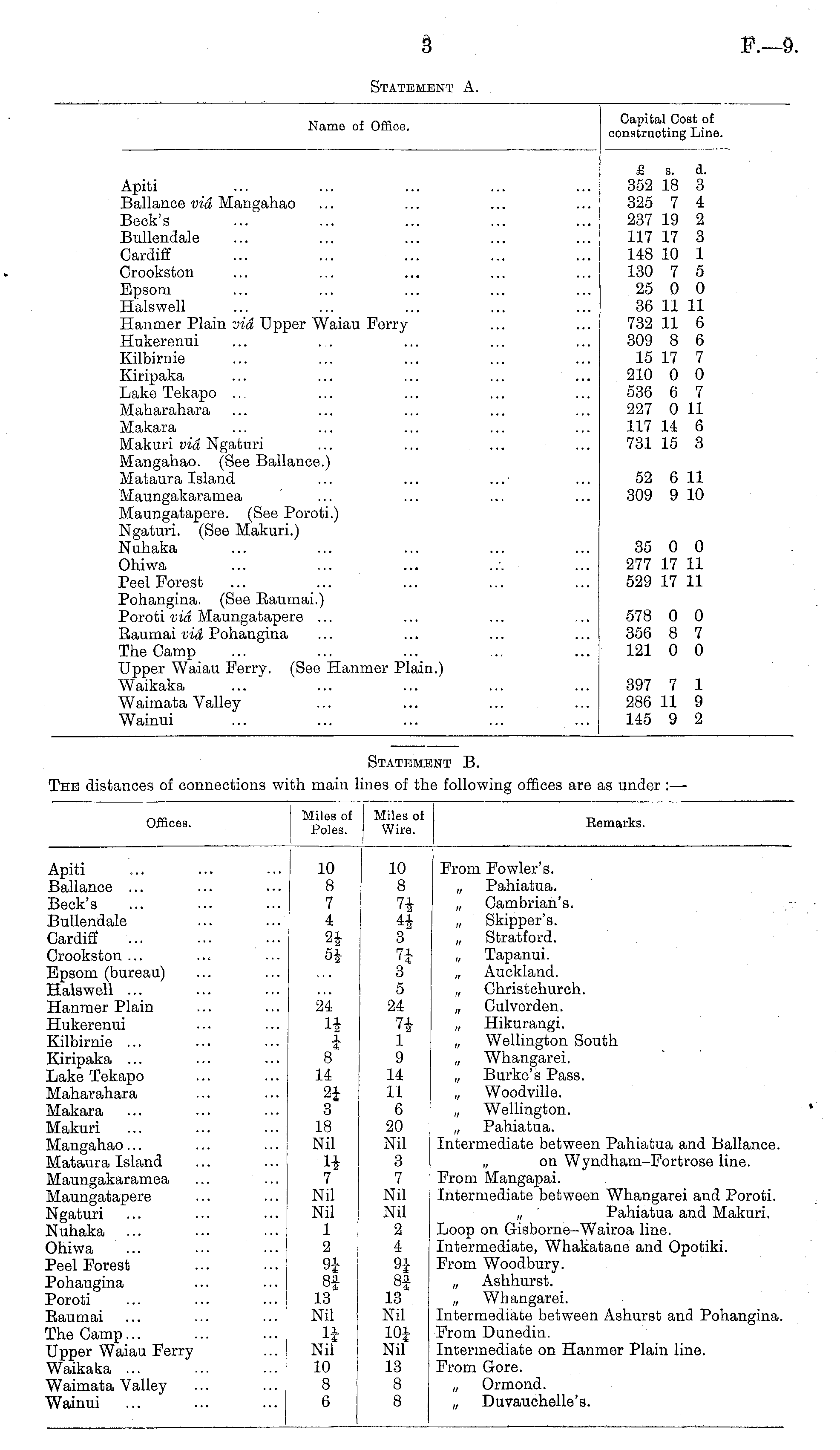 Name of Office. Capital Cost of constructing Line. Apiti Ballance via Mangahao Beck's Bullendale Cardiff Crookston Epsom Halswell Hanmer Plain via Upper Waiau Perry Hukerenui Kilbirnie Kiripaka Lake Tekapo ... Maharahara Makara Makuri via Ngaturi Mangahao. (See Ballance.) Mataura Island Maungakaramea Maungatapere. (See Poroti.) Ngaturi. (See Makuri.) Nuhaka Ohiwa Peel Forest Pohangina. (See Eaumai.) Poroti via Maungatapere ... Eaumai via Pohangina The Camp Upper Waiau Perry. (See Hanmer Plain.) Waikaka Waimata Valley Wainui £ s. d. 352 18 3 325 7 4 237 19 2 117 17 3 148 10 1 130 7 5 25 0 0 36 11 11 732 11 6 309 8 6 15 17 7 210 0 0 536 6 7 227 0 11 117 14 6 731 15 3 52 6 11 309 9 10 35 0 0 277 17 11 529 17 11 578 0 0 356 8 7 121 0 0 397 7 1 286 11 9 145 9 2