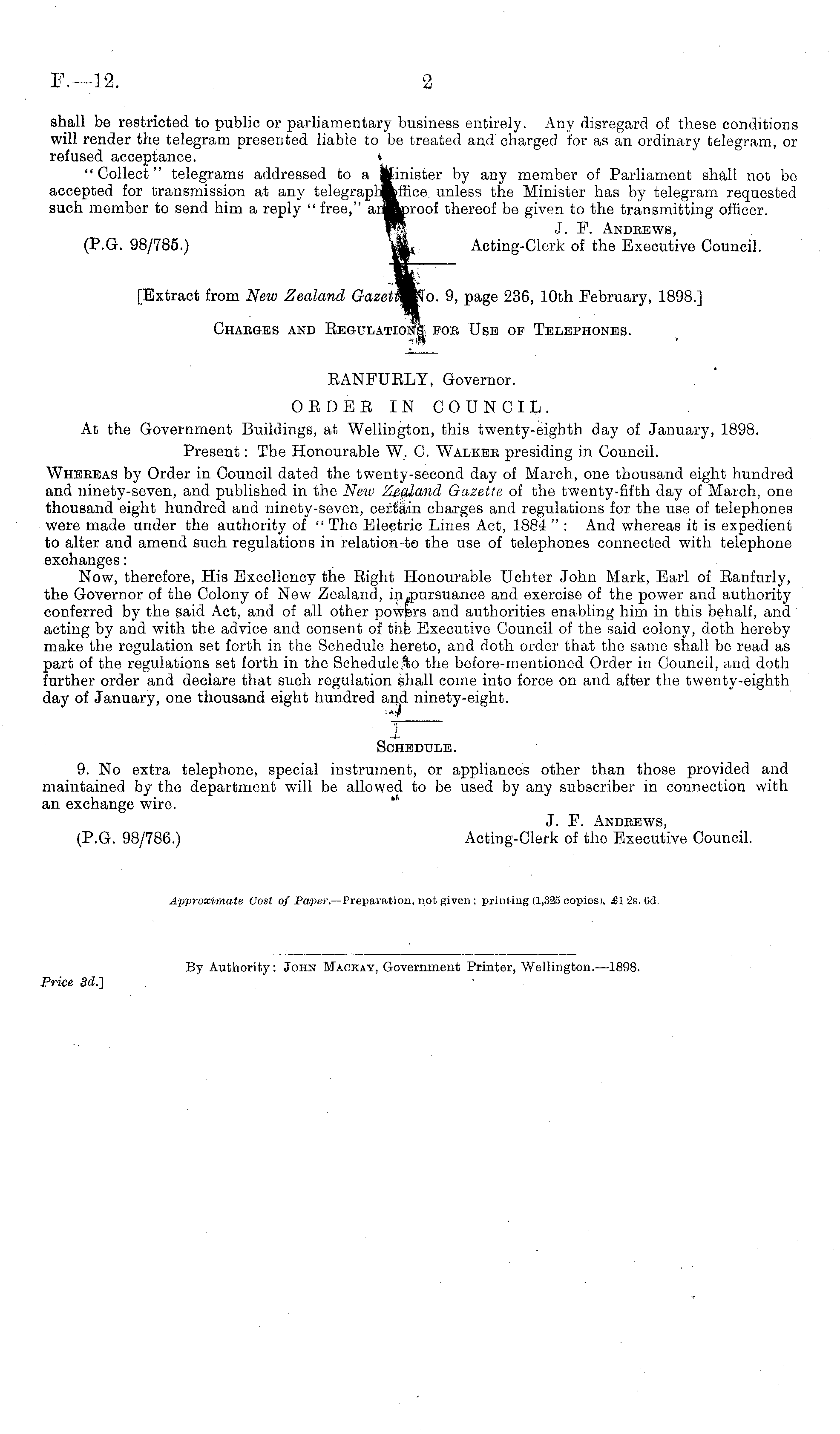 [Extract from New Zealand GazettWfo. 9, page 236, 10th February, 1898.] Chabges and Regulations foe Use of Telephones.