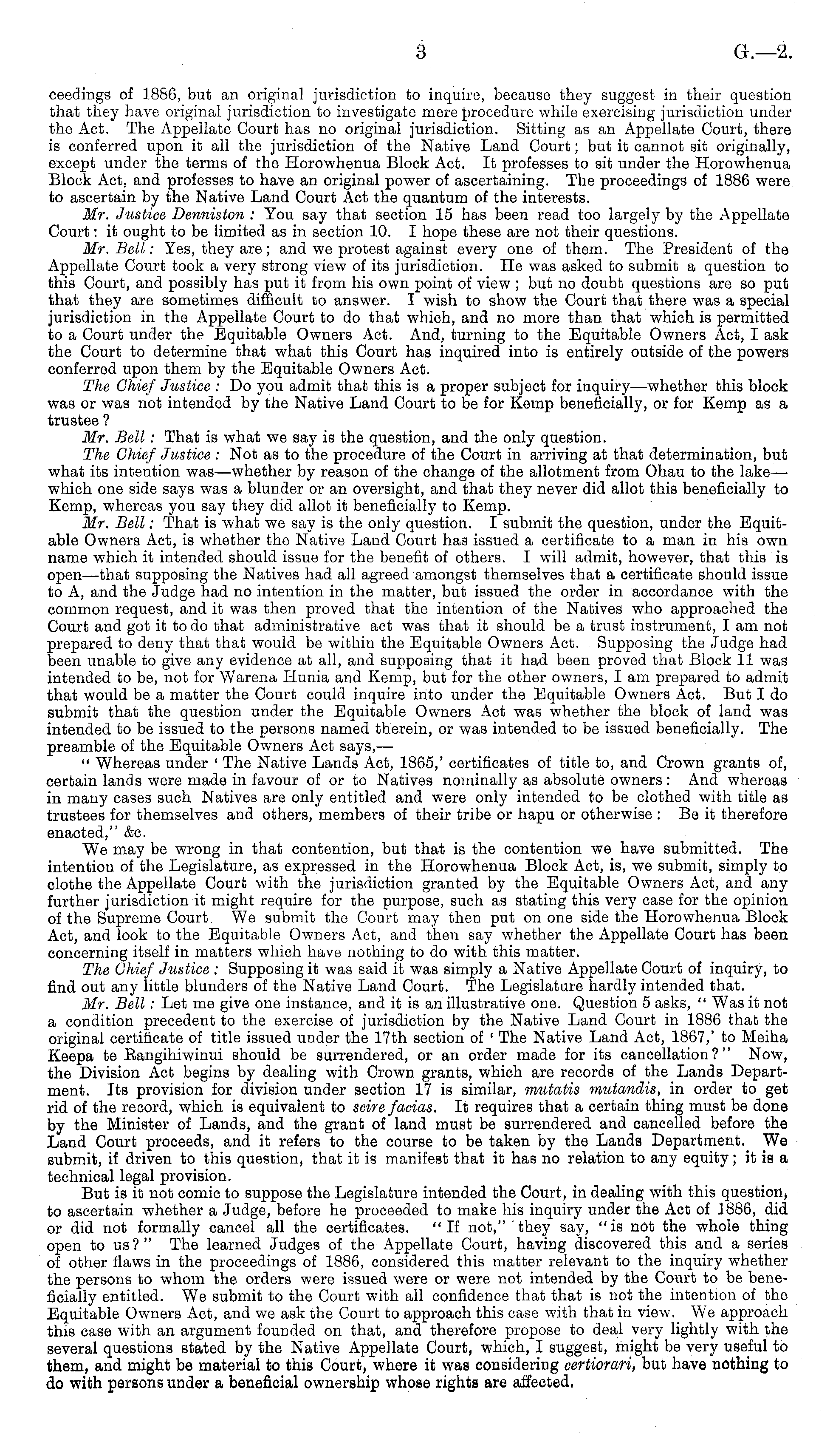 ceedings of 1886, but an original jurisdiction to inquire, because they suggest in their question that they have original jurisdiction to investigate mere procedure while exercising jurisdiction under the Act. The Appellate Court has no original jurisdiction. Sitting as an Appellate Court, there is conferred upon it all the jurisdiction of the Native Land Court; but it cannot sit originally, except under the terms of the Horowhenua Block Act. It professes to sit under the Horowhenua Block Act, and professes to have an original power of ascertaining. The proceedings of 1886 were to ascertain by the Native Land Court Act the quantum of the interests. Mr. Justice Denniston : You say that section 15 has been read too largely by the Appellate Court: it ought to be limited as in section 10. I hope these are not their questions. Mr. Bell: Yes, they are; and we protest against every one of them. The President of the Appellate Court took a very strong view of its jurisdiction. He was asked to submit a question to this Court, and possibly has put it from his own point of view ; but no doubt questions are so put that they are sometimes difficult to answer. I wish to show the Court that there was a special jurisdiction in the Appellate Court to do that which, and no more than that which is permitted to a Court under the Equitable Owners Act. And, turning to the Equitable Owners Act, I ask the Court to determine that what this Court has inquired into is entirely outside of the powers conferred upon them by the Equitable Owners Act. The Chief Justice : Do you admit that this is a proper subject for inquiry—whether this block was or was not intended by the Native Land Court to be for Kemp beneficially, or for Kemp as a trustee ? Mr. Bell: That is what we say is the question, and the only question. The Chief Justice : Not as to the procedure of the Court in arriving at that determination, but what its intention was—whether by reason of the change of the allotment from Ohau to the lake— which one side says was a blunder or an oversight, and that they never did allot this beneficially to Kemp, whereas you say they did allot it beneficially to Kemp. Mr. Bell: That is what we say is the only question. I submit the question, under the Equitable Owners Act, is whether the Native Land Court has issued a certificate to a man in his own name which it intended should issue for the benefit of others. I will admit, however, that this is open—that supposing the Natives had all agreed amongst themselves that a certificate should issue to A, and the Judge had no intention in the matter, but issued the order in accordance with the common request, and it was then proved that the intention of the Natives who approached the Court and got it to do that administrative act was that it should be a trust instrument, I am not prepared to deny that that would be within the Equitable Owners Act. Supposing the Judge had been unable to give any evidence at all, and supposing that it had been proved that Block 11 was intended to be, not for Warena Hunia and Kemp, but for the other owners, I am prepared to admit that would be a matter the Court could inquire into under the Equitable Owners Act. But Ido submit that the question under the Equitable Owners Act was whether the block of land was intended to be issued to the persons named therein, or was intended to be issued beneficially. The preamble of the Equitable Owners Act says, — " Whereas under ' The Native Lands Act, 1865,' certificates of title to, and Crown grants of, certain lands were made in favour of or to Natives nominally as absolute owners : And whereas in many cases such Natives are only entitled and were only intended to be clothed with title as trustees for themselves and others, members of their tribe or hapu or otherwise : Be it therefore enacted," &c. We may be wrong in that contention, but that is the contention we have submitted. The intention of the Legislature, as expressed in the Horowhenua Block Act, is, we submit, simply to clothe the Appellate Court with the jurisdiction granted by the Equitable Owners Act, and any further jurisdiction it might require for the purpose, such as stating this very case for the opinion of the Supreme Court We submit the Court may then put on one side the Horowhenua Block Act, and look to the Equitable Owners Act, and then say whether the Appellate Court has been concerning itself in matters which have nothing to do with this matter. The Chief Justice ; Supposing it was said it was simply a Native Appellate Court of inquiry, to find out any little blunders of the Native Land Court. The Legislature hardly intended that. Mr. Bell: Let me give one instance, and it is an illustrative one. Question 5 asks, " Was it not a condition precedent to the exercise of jurisdiction by the Native Land Court in 1886 that the original certificate of title issued under the 17th section of ' The Native Land Act, 1867,' to Meiha Keepa te Eangihiwinui should be surrendered, or an order made for its cancellation?" Now, the Division Act begins by dealing with Crown grants, which are records of the Lands Department. Its provision for division under section 17 is similar, mutatis mutandis, in order to get rid of the record, which is equivalent to scire facias. It requires that a certain thing must be done by the Minister of Lands, and the grant of land must be surrendered and cancelled before the Land Court proceeds, and it refers to the course to be taken by the Lands Department. We submit, if driven to this question, that it is manifest that it has no relation to any equity; it is a technical legal provision. But is it not comic to suppose the Legislature intended the Court, in dealing with this question, to ascertain whether a Judge, before he proceeded to make his inquiry under the Act of 1886, did or did not formally cancel all the certificates. "If not," "they say, "is not the whole thing open to us?" The learned Judges of the Appellate C