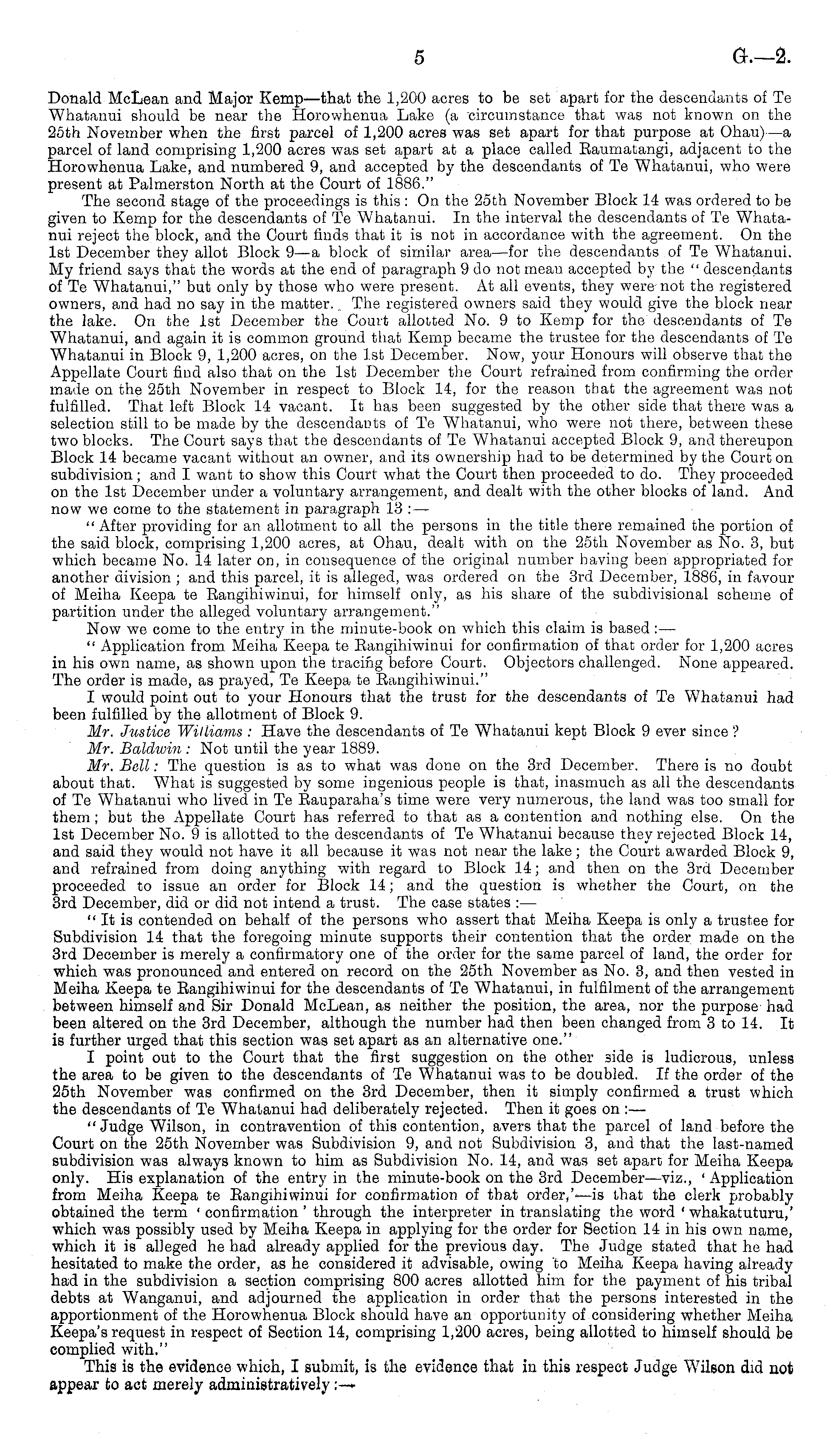 Donald McLean and Major Kemp—that the 1,200 acres to be set apart for the descendants of Te Whatanui should be near the Horowhenua Lake (a circumstance that was not known on the 25th November when the first parcel of 1,200 acres was set apart for that purpose at Ohau) —a parcel of land comprising 1,200 acres was set apart at a place called Eaumatangi, adjacent to the Horowhenua Lake, and numbered 9, and accepted by the descendants of Te Whatanui, who were present at Palmerston North at the Court of 1886." The second stage of the proceedings is this : On the 25th November Block 14 was ordered to be given to Kemp for the descendants of Te Whatanui. In the interval the descendants of Te Whatanui reject the block, and the Court finds that it is not in accordance with the agreement. On the Ist December they allot Block 9 —a block of similar area—for the descendants of Te Whatanui. My friend says that the words at the end of paragraph 9 do not mean accepted by the " descendants of Te Whatanui," but only by those who were present. At all events, they were not the registered owners, and had no say in the matter. The registered owners said they would give the block near the lake. On the Ist December the Court allotted No. 9 to Kemp for the descendants of Te Whatanui, and again it is common ground that Kemp became the trustee for the descendants of Te Whatanui in Block 9, 1,200 acres, on the Ist December. Now, your Honours will observe that the Appellate Court find also that on the Ist December the Court refrained from confirming the order made on the 25th November in respect to Block 14, for the reason that the agreement was not fulfilled. That left Block 14 vacant. It has been suggested by the other side that there was a selection still to be made by the descendants of Te Whatanui, who were not there, between these two blocks. The Court says that the descendants of Te Whatanui accepted Block 9, and thereupon Block 14 became vacant without an owner, and its ownership had to be determined by the Court on subdivision ; and I want to show this Court what the Court then proceeded to do. They proceeded on the Ist December under a voluntary arrangement, and dealt with the other blocks of land. And now we come to the statement in paragraph 13 : — " After providing for an allotment to all the persons in the title there remained the portion of the said block, comprising 1,200 acres, at Ohau, dealt wdth on the 25th November as No. 3, but which became No. 14 later on, in consequence of the original number having been appropriated for another division ; and this parcel, it is alleged, was ordered on the 3rd December, 1886, in favour of Meiha Keepa te Eangihiwinui, for himself only, as his share of the subdivisional scheme of partition under the alleged voluntary arrangement." Now we come to the entry in the minute-book on which this claim is based: — " Application from Meiha Keepa te Eangihiwinui for confirmation of that order for 1,200 acres in his own name, as shown upon the tracing before Court. Objectors challenged. None appeared. The order is made, as prayed, Te Keepa te Eangihiwinui." I would point out to your Honours that the trust for the descendants of Te Whatanui had been fulfilled by the allotment of Block 9. Mr. Justice Williams: Have the descendants of Te Whatanui kept Block 9 ever since ? Mr. Baldwin : Not until the year 1889. Mr. Bell: The question is as to what was done on the 3rd December. There is no doubt about that. What is suggested by some ingenious people is that, inasmuch as all the descendants of Te Whatanui who lived in Te Eauparaha's time were very numerous, the land was too small for them; but the Appellate Court has referred to that as a contention and nothing else. On the Ist December No. 9 is allotted to the descendants of Te Whatanui because they rejected Block 14, and said they would not have it all because it was not near the lake; the Court awarded Block 9, and refrained from doing anything with regard to Block 14; and then on the 3rd December proceeded to issue an order for Block 14; and the question is whether the Court, on the 3rd December, did or did not intend a trust. The case states : — " It is contended on behalf of the persons who assert that Meiha Keepa is only a trustee for Subdivision 14 that the foregoing minute supports their contention that the order made on the 3rd December is merely a confirmatory one of the order for the same parcel of land, the order for which was pronounced and entered on record on the 25th November as No. 3, and then vested in Meiha Keepa te Eangihiwinui for the descendants of Te Whatanui, in fulfilment of the arrangement between himself and Sir Donald McLean, as neither the position, the area, nor the purpose had been altered on the 3rd December, although the number had then been changed from 3to 14. It is further urged that this section was set apart as an alternative one." I point out to the Court that the first suggestion on the other side is ludicrous, unless the area to be given to the descendants of Te Whatanui was to be doubled. If the order of the 25th November was confirmed on the 3rd December, then it simply confirmed a trust which the descendants of Te Whatanui had deliberately rejected. Then it goes on : — "Judge Wilson, in contravention of this contention, avers that- the parcel of land before the Court on the 25th November was Subdivision 9, and not Subdivision 3, and that the last-named subdivision was always known to him as Subdivision No. 14, and was set apart for Meiha Keepa only. His explanation of the entry in the minute-book on the 3rd December—viz., ' Application from Meiha Keepa te Eangihiwinui for confirmation of that order,' —is that the clerk probably obtained the term 'confirmation' through the interpreter in translating the word ' whakatuturu,' which was possibly used by Meiha Keepa in applying for the order for Section 14 in his own name, which it is alleged he had already applied for th