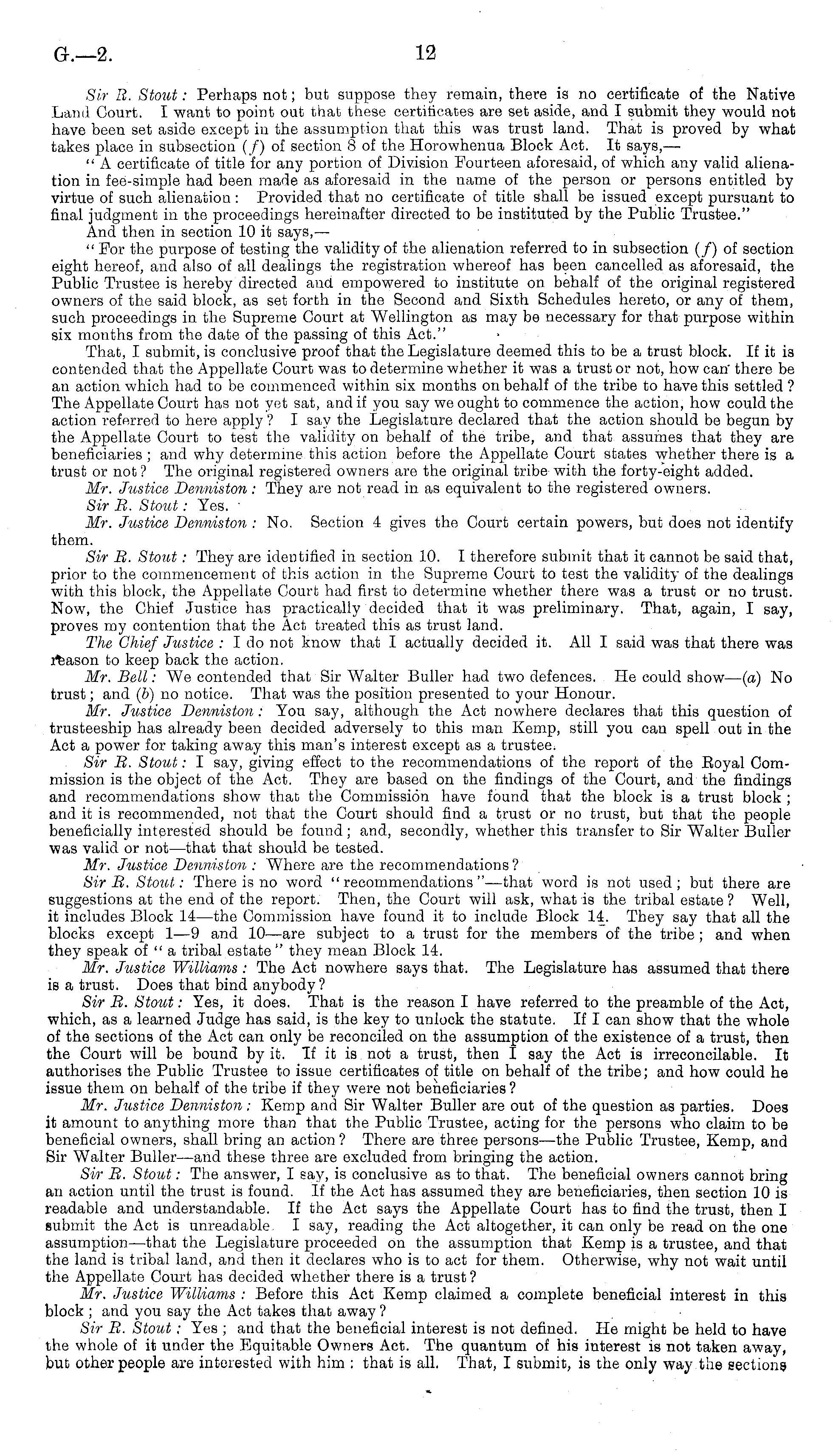 Sir R. Stout: Perhaps not; but suppose they remain, there is no certificate of the Native Land Court. I want to point out that these certificates are set aside, and I submit they would not have been set aside except in the assumption that this was trust land. That is proved by what takes place in subsection (/) of section Bof the Horowhenua Block Act. It says,—■ " A certificate of title for any portion of Division Fourteen aforesaid, of which any valid alienation in fee-simple had been made as aforesaid in the name of the person or persons entitled by virtue of such alienation : Provided that no certificate of title shall be issued except pursuant to final judgment in the proceedings hereinafter directed to be instituted by the Public Trustee." And then in section 10 it says,— " For the purpose of testing the validity of the alienation referred to in subsection (/) of section eight hereof, and also of all dealings the registration whereof has been cancelled as aforesaid, the Public Trustee is hereby directed and empowered to institute on behalf of the original registered owners of the said block, as set forth in the Second and Sixth Schedules hereto, or any of them, such proceedings in the Supreme Court at Wellington as may be necessary for that purpose within six months from the date of the passing of this Act." That, I submit, is conclusive proof that the Legislature deemed this to be a trust block. If it is contended that the Appellate Court was to determine whether it was a trust or not, how can' there be an action which had to be commenced within six months on behalf of the tribe to have this settled ? The Appellate Court has not yet sat, and if you say we ought to commence the action, how could the action referred to here apply ? I say the Legislature declared that the action should be begun by the Appellate Court to test the validity on behalf of the tribe, and that assumes that they are beneficiaries ; and why determine this action before the Appellate Court states whether there is a trust or not ? The original registered owners are the original tribe with the forty-eight added. Mr. Justice Denniston: They are not read in as equivalent to the registered owners. Sir R. Stout: Yes. ' Mr. Justice Denniston : No. Section 4 gives the Court certain powers, but does not identify them. Sir R. Stout: They are identified in section 10. I therefore submit that it cannot be said that, prior to the commencement of this action in the Supreme Court to test the validity of the dealings with this block, the Appellate Court had first to determine whether there was a trust or no trust. Now, the Chief Justice has practically decided that it was preliminary. That, again, I say, proves my contention that the Act treated this as trust land. The Chief Justice : Ido not know that I actually decided it. All I said was that there was reason to keep back the action. Mr. Bell: We contended that Sir Walter Buller had two defences. He could show— (a) No trust; and (b) no notice. That was the position presented to your Honour. Mr. Justice Denniston : You say, although the Act nowhere declares that this question of trusteeship has already been decided adversely to this man Kemp, still you can spell out in the Act a power for taking away this man's interest except as a trustee. Sir R. Stout .- I say, giving effect to the recommendations of the report of the Eoyal Commission is the object of the Act. They are based on the findings of the Court, and the findings and recommendations show that the Commission have found that the block is a trust block ; and it is recommended, not that the Court should find a trust or no trust, but that the people beneficially interested should be found; and, secondly, whether this transfer to Sir Walter Buller was valid or not —that that should be tested. Mr. Justice Denniston : Where are the recommendations ? Sir R. Stout: There is no word "recommendations"—that word is not used; but there are suggestions at the end of the report. Then, the Court will ask, what is the tribal estate ? Well, it includes Block 14—the Commission have found it to include Block 14. They say that all the blocks except I—9 and 10—are subject to a trust for the members of the tribe ; and when they speak of " a tribal estate " they mean Block 14. Mr. Justice Williams : The Act nowhere says that. The Legislature has assumed that there is a trust. Does that bind anybody ? Sir R. Stout: Yes, it does. That is the reason I have referred to the preamble of the Act, which, as a learned Judge has said, is the key to unlock the statute. If I can show that the whole of the sections of the Act can only be reconciled on the assumption of the existence of a trust, then the Court will be bound by it. If it is not a trust, then I say the Act is irreconcilable. It authorises the Public Trustee to issue certificates of title on behalf of the tribe; and how could he issue them on behalf of the tribe if they were not beneficiaries ? Mr. Justice Denniston: Kemp and Sir Walter Buller are out of the question as parties. Does it amount to anything more than that the Public Trustee, acting for the persons who claim to be beneficial owners, shall bring an action ? There are three persons—the Public Trustee, Kemp, and Sir Walter Buller—and these three are excluded from bringing the action. Sir R. Stout: The answer, I say, is conclusive as to that. The beneficial owners cannot bring an action until the trust is found. If the Act has assumed they are beneficiaries, then section 10 is readable and understandable. If the Act says the Appellate Court has to find the trust, then I submit the Act is unreadable I say, reading the Act altogether, it can only be read on the one assumption—that the Legislature proceeded on the assumption that Kemp is a trustee, and that the land is tribal land, and then it declares who is to act for them. Otherwise, why not wait until the Appellate Court has decided whether there is a trus