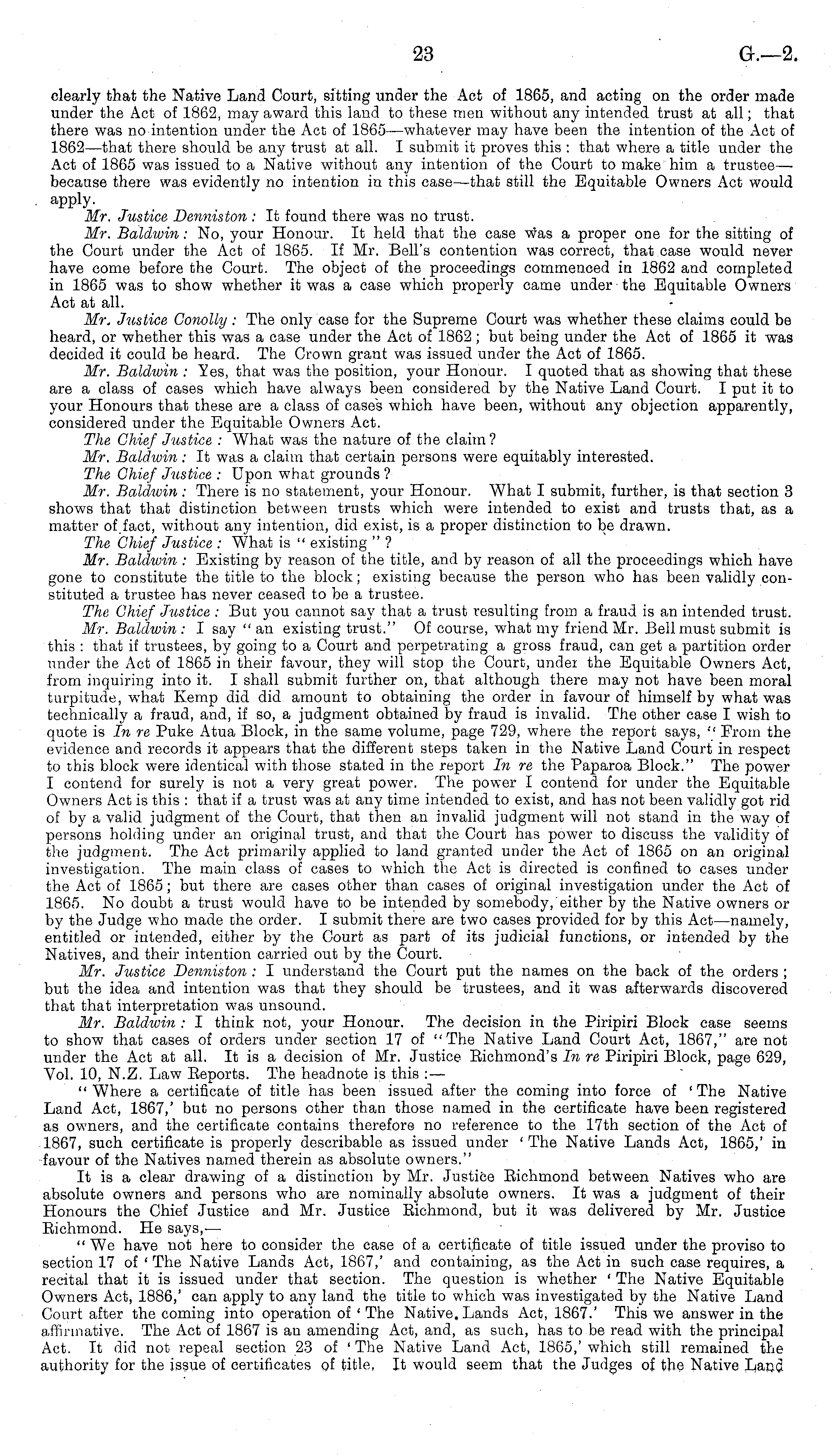 clearly that the Native Land Court, sitting under the Act of 1865, and acting on the order made under the Act of 1862, may award this land to these men without any intended trust at all; that there was no intention under the Act of 1865 —whatever may have been the intention of the Act of 1862 —that there should be any trust at all. I submit it proves this : that where a title under the Act of 1865 was issued to a Native without any intention of the Court to make him a trustee— because there was evidently no intention in this case—that still the Equitable Owners Act would applyMr. Justice Denniston : It found there was no trust. Mr. Baldwin: No, your Honour. It held that the case was a proper one for the sitting of the Court under the Act of 1865. If Mr. Bell's contention was correct, that case would never have come before the Court. The object of the proceedings commenced in 1862 and completed in 1865 was to show whether it was a case which properly came under the Equitable Owners Act at all. Mr. Justice Conolly : The only case for the Supreme Court was whether these claims could be heard, or whether this was a case under the Act of 1862 ; but being under the Act of 1865 it was decided it could be heard. The Crown grant was issued under the Act of 1865. ilfr. Baldwin : Yes, that was the position, your Honour. I quoted that as showing that these are a class of cases which have always been considered by the Native Land Court. I put it to your Honours that these are a class of cases which have been, without any objection apparently, considered under the Equitable Owners Act. The Chief Justice : What was the nature of the claim ? Mr. Baldwin : It was a claim that certain persons were equitably interested. The Chief Justice : Upon what grounds ? Mr. Baldwin: There is no statement, your Honour. What I submit, further, is that section 3 shows that that distinction between trusts which were intended to exist and trusts that, as a matter of fact, without any intention, did exist, is a proper distinction to be drawn. The Chief Justice : What is " existing " ? Mr. Baldwin : Existing by reason of the title, and by reason of all the proceedings which have gone to constitute the title to the block; existing because the person who has been validly constituted a trustee has never ceased to be a trustee. The Chief Justice : But you cannot say that a trust resulting from a fraud is an intended trust. Mr. Baldwin: I say "an existing trust." Of course, what my friend Mr. Bell must submit is this : that if trustees, by going to a Court and perpetrating a gross fraud, can get a partition order under the Act of 1865 in their favour, they will stop the Court, under the Equitable Owners Act, from inquiring into it. I shall submit further on, that although there may not have been moral turpitude, w T hat Kemp did did amount to obtaining the order in favour of himself by what was technically a fraud, and, if so, a judgment obtained by fraud is invalid. The other case I wish to quote is In re Puke Atua Block, in the same volume, page 729, where the report says, " From the evidence and records it appears that the different steps taken in the Native Land Court in respect to this block were identical with those stated in the report In re the Paparoa Block." The power I contend for surely is not a very great power. The power I contend for under the Equitable Owners Act is this : that if a trust was at any time intended to exist, and has not been validly got rid of by a valid judgment of the Court, that then an invalid judgment will not stand in the way of persons holding under an original trust, and that the Court has power to discuss the validity of the judgment. The Act primarily applied to land granted under the Act of 1865 on an original investigation. The main class of cases to which the Act is directed is confined to cases under the Act of 1865; but there are cases other than cases of original investigation under the Act of 1865. No doubt a trust would have to be intended by somebody, either by the Native owners or by the Judge who made the order. I submit there are two cases provided for by this Act—namely, entitled or intended, either by the Court as part of its judicial functions, or intended by the Natives, and their intention carried out by the Court. Mr. Justice Denniston : I understand the Court put the names on the back of the orders ; but the idea and intention was that they should be trustees, and it was afterwards discovered that that interpretation was unsound. Mr. Baldwin : I think not, your Honour. The decision in the Piripiri Block case seems to show that cases of orders under section 17 of "The Native Land Court Act, 1867," are not under the Act at all. It is a decision of Mr. Justice Eichmond's In re Piripiri Block, page 629, Vol. 10, N.Z. Law Eeports. The headnote is this : — " Where a certificate of title has been issued after the coming into force of ' The Native Land Act, 1867,' but no persons other than those named in the certificate have been registered as owners, and the certificate contains therefore no reference to the 17th section of the Act of 1867, such certificate is properly describable as issued under ' The Native Lands Act, 1865,' in favour of the Natives named therein as absolute owners." It is a clear drawing of a distinction by Mr. Justice Eichmond between Natives who are absolute owners and persons who are nominally absolute owners. It was a judgment of their Honours the Chief Justice and Mr. Justice Eichmond, but it was delivered by Mr. Justice Eichmond. He says,— "We have not here to consider the case of a certificate of title issued under the proviso to section 17 of ' The Native Lands Act, 1867,' and containing, as the Act in such case requires, a recital that it is issued under that section. The question is whether ' The Native Equitable Owners Act, 1886,' can apply to any land the title to which was investigated by the Native Land Court after the coming int