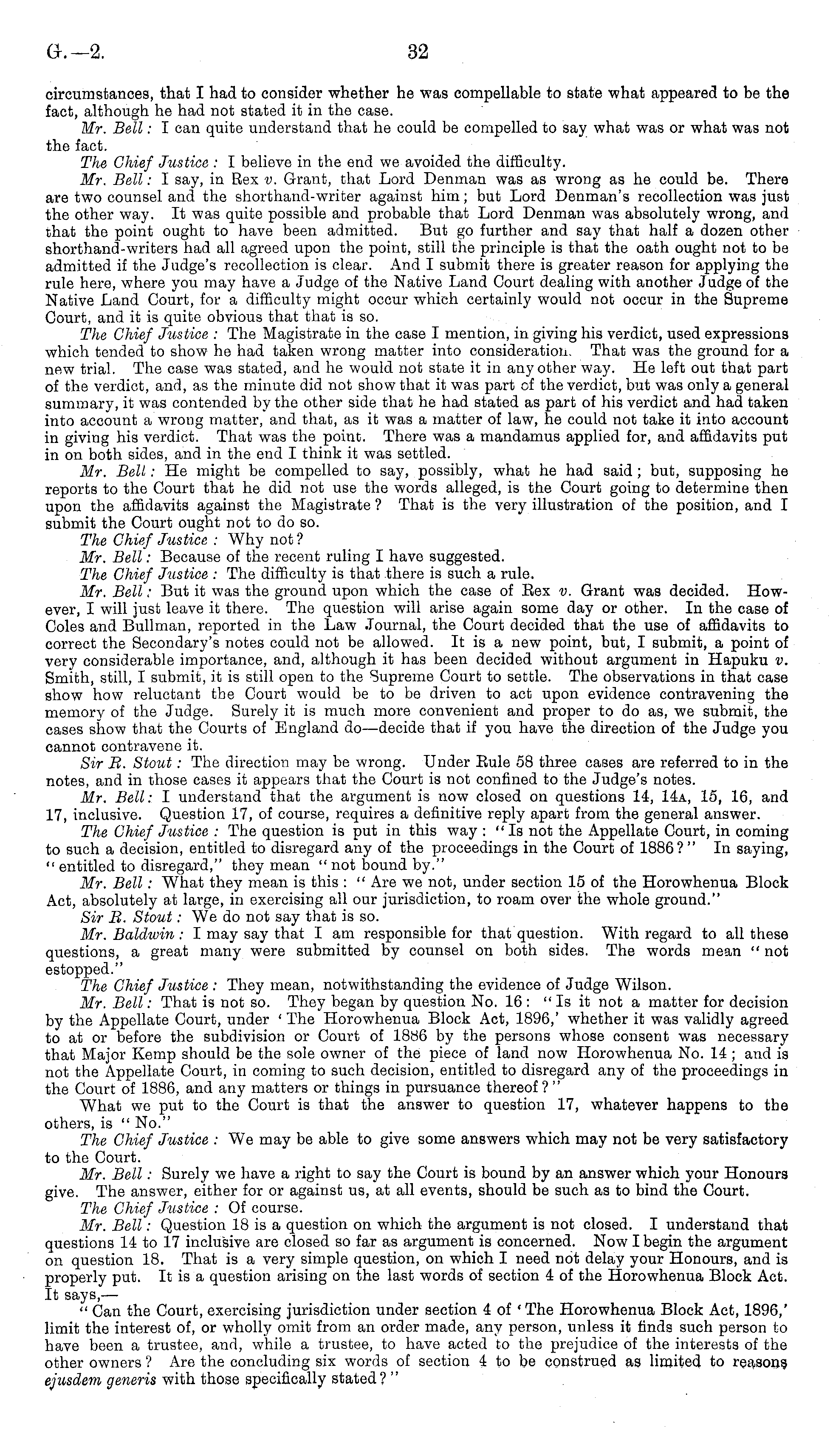 circumstances, that I had to consider whether he was compellable to state what appeared to be the fact, although he had not stated it in the case. Mr. Bell: I can quite understand that he could be compelled to say what was or what was not the fact. The Chief Justice : I believe in the end we avoided the difficulty. Mr. Bell: I say, in Eex v. Grant, that Lord Denman was as wrong as he could be. There are two counsel and the shorthand-writer against him; but Lord Denman's recollection was just the other way. It was quite possible and probable that Lord Denman was absolutely wrong, and that the point ought to have been admitted. But go further and say that half a dozen other shorthand-writers had all agreed upon the point, still the principle is that the oath ought not to be admitted if the Judge's recollection is clear. And I submit there is greater reason for applying the rule here, where you may have a Judge of the Native Land Court dealing with another Judge of the Native Land Court, for a difficulty might occur which certainly would not occur in the Supreme Court, and it is quite obvious that that is so. The Chief Justice : The Magistrate in the case I mention, in giving his verdict, used expressions which tended to show he had taken wrong matter into consideration. That was the ground for a new trial. The case was stated, and he would not state it in any other way. He left out that part of the verdict, and, as the minute did not show that it was part of the verdict, but was only a general summary, it was contended by the other side that he had stated as part of his verdict and had taken into account a wrong matter, and that, as it was a matter of law, he could not take it into account in giving his verdict. That was the point. There was a mandamus applied for, and affidavits put in on both sides, and in the end I think it was settled. Mr. Bell: He might be compelled to say, possibly, what he had said; but, supposing he reports to the Court that he did not use the words alleged, is the Court going to determine then upon the affidavits against the Magistrate ? That is the very illustration of the position, and I submit the Court ought not to do so. The Chief Justice : Why not ? Mr. Bell: Because of the recent ruling I have suggested. The Chief Justice : The difficulty is that there is such a rule. Mr. Bell: But it was the ground upon which the case of Eex v. Grant was decided. However, I will just leave it there. The question will arise again some day or other. In the case of Coles and Bull man, reported in the Law Journal, the Court decided that the use of affidavits to correct the Secondary's notes could not be allowed. It is a new point, but, I submit, a point of very considerable importance, and, although it has been decided without argument in Hapuku v. Smith, still, I submit, it is still open to the Supreme Court to settle. The observations in that case show how reluctant the Court would be to be driven to act upon evidence contravening the memory of the Judge. Surely it is much more convenient and proper to do as, we submit, the cases show that the Courts of England do—decide that if you have the direction of the Judge you cannot contravene it. Sir R. Stout: The direction may be wrong. Under Eule 58 three cases are referred to in the notes, and in those cases it appears that the Court is not confined to the Judge's notes. Mr. Bell: I understand that the argument is now closed on questions 14, 14a, 15, 16, and 17, inclusive. Question 17, of course, requires a definitive reply apart from the general answer. The Chief Justice : The question is put in this way : "Is not the Appellate Court, in coming to such a decision, entitled to disregard any of the proceedings in the Court of 1886?" In saying, " entitled to disregard," they mean " not bound by." Mr. Bell: What they mean is this : " Are we not, under section 15 of the Horowhenua Block Act, absolutely at large, in exercising all our jurisdiction, to roam over the whole ground." Sir R. Stout: We do not say that is so. Mr. Baldwin : I may say that I am responsible for that question. With regard to all these questions, a great many were submitted by counsel on both sides. The words mean " not estopped." The Chief Justice : They mean, notwithstanding the evidence of Judge Wilson. Mr. Bell: That is not so. They began by question No. 16 :"Is it not a matter for decision by the Appellate Court, under ' The Horowhenua Block Act, 1896,' whether it was validly agreed to at or before the subdivision or Court of 1886 by the persons whose consent was necessary that Major Kemp should be the sole owner of the piece of land now Horowhenua No. 14; and is not the Appellate Court, in coming to such decision, entitled to disregard any of the proceedings in the Court of 1886, and any matters or things in pursuance thereof ? " What we put to the Court is that the answer to question 17, whatever happens to the others, is " No." The Chief Justice : We may be able to give some answers which may not be very satisfactory to the Court. Mr. Bell: Surely we have a right to say the Court is bound by an answer which your Honours give. The answer, either for or against us, at all events, should be such as to bind the Court. The Chief Justice : Of course. Mr. Bell: Question 18 is a question on which the argument is not closed. I understand that questions 14 to 17 inclusive are closed so far as argument is concerned. Now I begin the argument on question 18. That is a very simple question, on which I need not delay your Honours, and is properly put. It is a question arising on the last words of section 4of the Horowhenua Block Act. It says, — " Can the Court, exercising jurisdiction under section 4 of ' The Horowhenua Block Act, 1896,' limit the interest of, or wholly omit from an order made, any person, unless it finds such person to have been a trustee, and, while a trustee, to have acted to the prejudice of the interests of the other owners ? Are the concludin