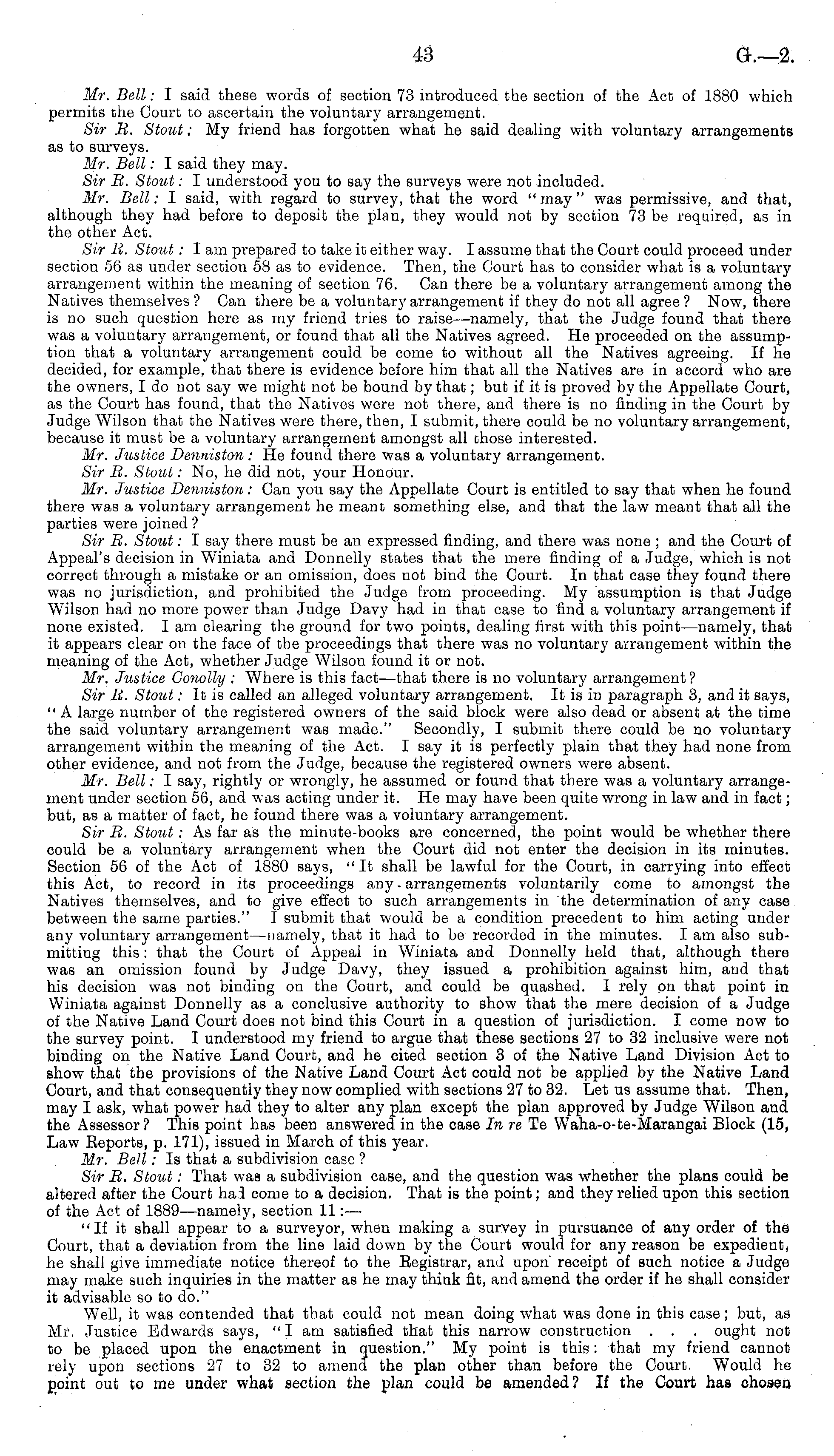 Mr. Bell: I said these words of section 73 introduced the section of the Act of 1880 which permits the Court to ascertain the voluntary arrangement. Sir R. Stout; My friend has forgotten what he said dealing with voluntary arrangements as to surveys. Mr. Bell: I said they may. Sir R. Stout: I understood you to say the surveys were not included. Mr. Bell: I said, with regard to survey, that the word "may" was permissive, and that, although they had before to deposit the plan, they would not by section 73 be required, as in the other Act. Sir B. Stout: lam prepared to take it either way. I assume that the Court could proceed under section 56 as under section 58 as to evidence. Then, the Court has to consider what is a voluntary arrangement within the meaning of section 76. Can there be a voluntary arrangement among the Natives themselves ? Can there be a voluntary arrangement if they do not all agree ? Now, there is no such question here as my friend tries to raise—namely, that the Judge found that there was a voluntary arrangement, or found that all the Natives agreed. He proceeded on the assumption that a voluntary arrangement could be come to without all the Natives agreeing. If he decided, for example, that there is evidence before him that all the Natives are in accord who are the owners, Ido not say we might not be bound by that; but if it is proved by the Appellate Court, as the Court has found, that the Natives were not there, and there is no finding in the Court by Judge Wilson that the Natives were there, then, I submit, there could be no voluntary arrangement, because it must be a voluntary arrangement amongst all chose interested. Mr. Justice Denniston : He found there was a voluntary arrangement. Sir R. Stout: No, he did not, your Honour. Mr. Justice Denniston: Can you say the Appellate Court is entitled to say that when he found there was a voluntary arrangement he meant something else, and that the law meant that all the parties were joined ? Sir B. Stout: I say there must be an expressed finding, and there was none ; and the Court of Appeal's decision in Winiata and Donnelly states that the mere finding of a Judge, which is not correct through a mistake or an omission, does not bind the Court. In that case they found there was no jurisdiction, and prohibited the Judge from proceeding. My assumption is that Judge Wilson had no more power than Judge Davy had in that case to find a voluntary arrangement if none existed. lam clearing the ground for two points, dealing first with this point—namely, that it appears clear on the face of the proceedings that there was no voluntary arrangement within the meaning of the Act, whether Judge Wilson found it or not. Mr. Justice Conolly : Where is this fact—that there is no voluntary arrangement? Sir R. Stout: It is called an alleged voluntary arrangement. It is in paragraph 3, and it says, " A large number of the registered owners of the said block were also dead or absent at the time the said voluntary arrangement was made." Secondly, I submit there could be no voluntary arrangement within the meaning of the Act. I say it is perfectly plain that they had none from other evidence, and not from the Judge, because the registered owners were absent. Mr. Bell: I say, rightly or wrongly, he assumed or found that there was a voluntary arrangement under section 56, and was acting under it. He may have been quite wrong in law and in fact; but, as a matter of fact, he found there was a voluntary arrangement. Sir R. Stout: As far as the minute-books are concerned, the point would be whether there could be a voluntary arrangement when the Court did not enter the decision in its minutes. Section 56 of the Act of 1880 says, "It shall be lawful for the Court, in carrying into effect this Act, to record in its proceedings any - arrangements voluntarily come to amongst the Natives themselves, and to give effect to such arrangements in the determination of any case between the same parties." T submit that would be a condition precedent to him acting under any voluntary arrangement —namely, that it had to be recorded in the minutes. lam also submitting this: that the Court of Appeal in Winiata and Donnelly held that, although there was an omission found by Judge Davy, they issued a prohibition against him, and that his decision was not binding on the Court, and could be quashed. I rely on that point in Winiata against Donnelly as a conclusive authority to show that the mere decision of a Judge of the Native Land Court does not bind this Court in a question of jurisdiction. I come now to the survey point. I understood my friend to argue that these sections 27 to 32 inclusive were not binding on the Native Land Court, and he cited section 3 of the Native Land Division Act to show that the provisions of the Native Land Court Act could not be applied by the Native Land Court, and that consequently they now complied with sections 27 to 32. Let us assume that. Then, may I ask, what power had they to alter any plan except the plan approved by Judge Wilson and the Assessor? This point has been answered in the case In re Te Waha-o-te-Marangai Block (15, Law Eeports, p. 171), issued in March of this year. Mr. Bell: Is that a subdivision case ? Sir R. Stout: That was a subdivision case, and the question was whether the plans could be altered after the Court had come to a decision. That is the point; and they relied upon this section of the Act of 1889 —namely, section 11: —■ "If it shall appear to a surveyor, when making a survey in pursuance of any order of the Court, that a deviation from the line laid down by the Court would for any reason be expedient, he shall give immediate notice thereof to the Eegistrar, and upon' receipt of such notice a Judge may make such inquiries in the matter as he may think fit, and amend the order if he shall consider it advisable so to do." Well, it was contended that that could not mean doing what was done in this cas