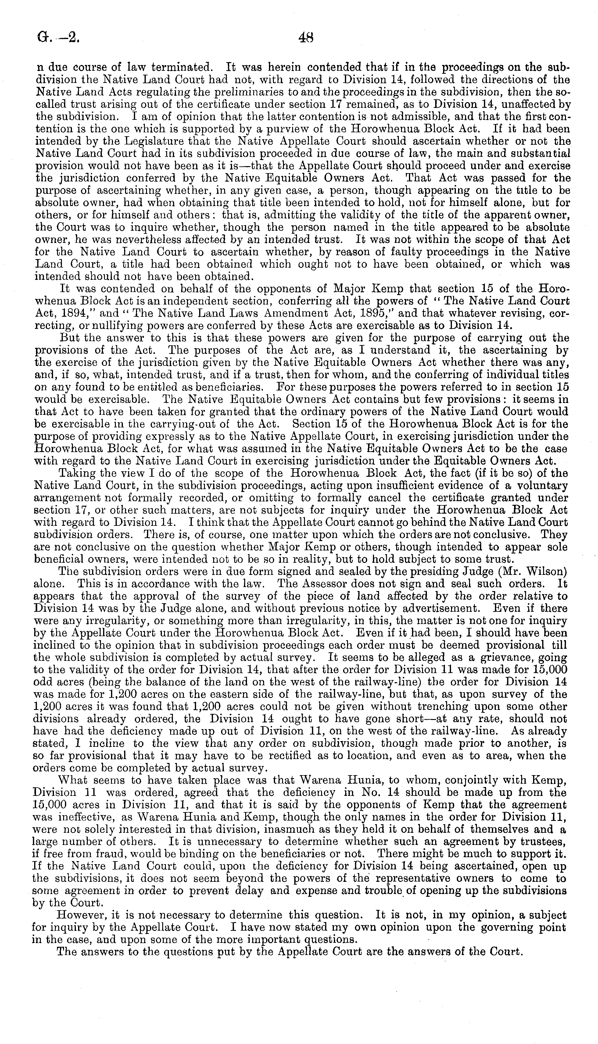 n due course of law terminated. It was herein contended that if in the proceedings on the subdivision the Native Land Court had not, with regard to Division 14, followed the directions of the Native Land Acts regulating the preliminaries to and the proceedings in the subdivision, then the socalled trust arising out of the certificate under section 17 remained, as to Division 14, unaffected by the subdivision. lam of opinion that the latter contention is not admissible, and that the first contention is the one which is supported by a purview of the Horowhenua Block Act. If it had been intended by the Legislature that the Native Appellate Court should ascertain whether or not the Native Land Court had in its subdivision proceeded in due course of law, the main and substantial provision would not have been as it is—that the Appellate Court should proceed under and exercise the jurisdiction conferred by the Native Equitable Owners Act. That Act was passed for the purpose of ascertaining whether, in any given case, a person, though appearing on the title to be absolute owner, had when obtaining that title been intended to hold, not for himself alone, but for others, or for himself and others : that is, admitting the validity of the title of the apparent owner, the Court was to inquire whether, though the person named in the title appeared to be absolute owner, he was nevertheless affected by an intended trust. It was not within the scope of that Act for the Native Land Court to ascertain whether, by reason of faulty proceedings in the Native Land Court, a title had been obtained which ought not to have been obtained, or which was intended should not have been obtained. It was contended on behalf of the opponents of Major Kemp that section 15 of the Horowhenua Block Act is an independent section, conferring all the powers of " The Native Land Court Act, 1894," and " The Native Land Laws Amendment Act, 1895,'' and that whatever revising, correcting, or nullifying powers are conferred by these Acts are exercisable as to Division 14. But the answer to this is that these powers are given for the purpose of carrying out the provisions of the Act. The purposes of the Act are, as I understand it, the ascertaining by the exercise of the jurisdiction given by the Native Equitable Owners Act whether there was any, and, if so, what, intended trust, and if a trust, then for whom, and the conferring of individual titles on any found to be entitled as beneficiaries. For these purposes the powers referred to in section 15 would be exercisable. The Native Equitable Owners Act contains but few provisions :it seems in that Act to have been taken for granted that the ordinary powers of the Native Land Court would be exercisable in the carrying-out of the Act. Section 15 of the Horowhenua Block Act is for the purpose of providing expressly as to the Native Appellate Court, in exercising jurisdiction under the Horowhenua Block Act, for what was assumed in the Native Equitable Owners Act to be the case with regard to the Native Land Court in exercising jurisdiction under the Equitable Owners Act. Taking the view I do of the scope of the Horowhenua Block Act, the fact (if it be so) of the Native Land Court, in the subdivision proceedings, acting upon insufficient evidence of a voluntary arrangement not formally recorded, or omitting to formally cancel the certificate granted under section 17, or other such matters, are not subjects for inquiry under the Horowhenua Block Act with regard to Division 14. I think that the Appellate Court cannot go behind the Native Land Court subdivision orders. There is, of course, one matter upon which the orders are not conclusive. They are not conclusive on the question whether Major Kemp or others, though intended to appear sole beneficial owners, were intended not to be so in reality, but to hold subject to some trust. The subdivision orders were in due form signed and sealed by the presiding Judge (Mr. Wilson) alone. This is in accordance with the law. The Assessor does not sign and seal such orders. It appears that the approval of the survey of the piece of land affected by the order relative to Division 14 was by the Judge alone, and without previous notice by advertisement. Even if there were any irregularity, or something more than irregularity, in this, the matter is not one for inquiry by the Appellate Court under the Horowhenua Block Act. Even if it had been, I should have been inclined to the opinion that in subdivision proceedings each order must be deemed provisional till the whole subdivision is completed by actual survey. It seems to be alleged as a grievance, going to the validity of the order for Division 14, that after the order for Division 11 was made for 15,000 odd acres (being the balance of the land on the west of the railway-line) the order for Division 14 was made for 1,200 acres on the eastern side of the railway-line, but that, as upon survey of the 1,200 acres it was found that 1,200 acres could not be given without trenching upon some other divisions already ordered, the Division 14 ought to have gone short—at any rate, should not have had the deficiency made up out of Division 11, on the west of the railway-line. As already stated, I incline to the view that any order on subdivision, though made prior to another, is so far provisional that it may have to be rectified as to location, and even as to area, when the orders come be completed by actual survey. What seems to have taken place was that Warena Hunia, to whom, conjointly with Kemp, Division 11 was ordered, agreed that the deficiency in No. 14 should be made up from the 15,000 acres in Division 11, and that it is said by the opponents of Kemp that the agreement was ineffective, as Warena Hunia and Kemp, though the only names in the order for Division 11, were not solely interested in that division, inasmuch as they held it on behalf of themselves and a large number of others. It is unnecessary 