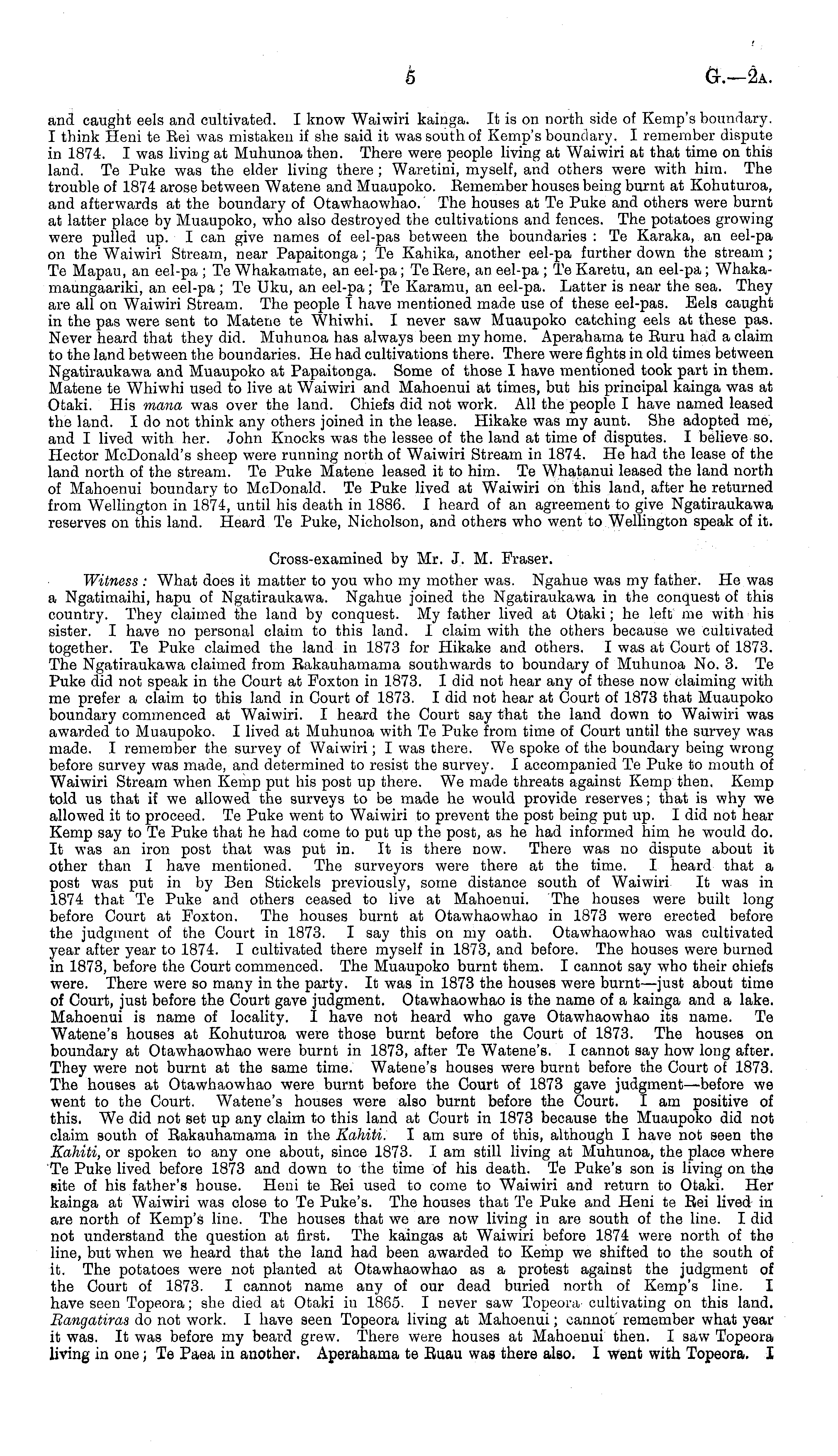 and caught eels and cultivated. I know Waiwiri kainga. It is on north side of Kemp's boundary. I think Heni te Bei was mistaken if she said it was south of Kemp's boundary. I remember dispute in 1874. I was living at Muhunoa then. There were people living at Waiwiri at that time on this land. Te Puke was the elder living there; Waretini, myself, and others were with him. The trouble of 1874 arose between Watene and Muaupoko. Bemember houses being burnt at Kohuturoa, and afterwards at the boundary of Otawhaowhao. The houses at Te Puke and others were burnt at latter place by Muaupoko, who also destroyed the cultivations and fences. The potatoes growing were pulled up. I can give names of eel-pas between the boundaries :Te Karaka, an eel-pa on the Waiwiri Stream, near Papaitonga; Te Kahika, another eel-pa further down the stream ; Te Mapau, an eel-pa ; Te Whakamate, an eel-pa; Te Bere, an eel-pa ; Te Karetu, an eel-pa; Whakamaungaariki, an eel-pa ; Te Uku, an eel-pa; Te Karamu, an eel-pa. Latter is near the sea. They are all on Waiwiri Stream. The people I have mentioned made use of these eel-pas. Eels caught in the pas were sent to Matene te Whiwhi. I never saw Muaupoko catching eels at these pas. Never heard that they did. Muhunoa has always been my home. Aperahama te Buru had a claim to the land between the boundaries. He had cultivations there. There were fights in old times between Ngatiraukawa and Muaupoko at Papaitonga. Some of those I have mentioned took part in them. Matene te Whiwhi used to live at Waiwiri and Mahoenui at times, but his principal kainga was at Otaki. His mana was over the land. Chiefs did not work. All the people I have named leased the land. Ido not think any others joined in the lease. Hikake was my aunt. She adopted me, and I lived with her. John Knocks was the lessee of the land at time of disputes. I believe so. Hector McDonald's sheep were running north of Waiwiri Stream in 1874. He had the lease of the land north of the stream. Te Puke Matene leased it to him. Te Whatanui leased the land north of Mahoenui boundary to McDonald. Te Puke lived at Waiwiri on this land, after he returned from Wellington in 1874, until his death in 1886. I heard of an agreement to give Ngatiraukawa reserves on this land. Heard Te Puke, Nicholson, and others who went to Wellington speak of it. Cross-examined by Mr. J. M. Fraser. Witness : What does it matter to you who my mother was. Ngahue was my father. He was a Ngatimaihi, hapu of Ngatiraukawa. Ngahue joined the Ngatiraukawa in the conquest of this country. They claimed the land by conquest. My father lived at Otaki; he left me with his sister. I have no personal claim to this land. I claim with the others because we cultivated together. Te Puke claimed the land in 1873 for Hikake and others. I was at Court of 1873. The Ngatiraukawa claimed from Bakauhamama southwards to boundary of Muhunoa No. 3. Te Puke did not speak in the Court at Foxton in 1873. I did not hear any of these now claiming with me prefer a claim to this land in Court of 1873. I did not hear at Court of 1873 that Muaupoko boundary commenced at Waiwiri. I heard the Court say that the land down to Waiwiri was awarded to Muaupoko. I lived at Muhunoa with Te Puke from time of Court until the survey was made. I remember the survey of Waiwiri; I was there. We spoke of the boundary being wrong before survey was made, and determined to resist the survey. I accompanied Te Puke to mouth of Waiwiri Stream when Kemp put his post up there. We made threats against Kemp then. Kemp told us that if we allowed the surveys to be made he would provide reserves; that is why we allowed it to proceed. Te Puke went to Waiwiri to prevent the post being put up. I did not hear Kemp say to Te Puke that he had come to put up the post, as he had informed him he would do. It was an iron post that was put in. It is there now. There was no dispute about it other than I have mentioned. The surveyors were there at the time. I heard that a post was put in by Ben Stickels previously, some distance south of Waiwiri It was in 1874 that Te Puke and others ceased to live at Mahoenui. The houses were built long before Court at Foxton. The houses burnt at Otawhaowhao in 1873 were erected before the judgment of the Court in 1873. I say this on my oath. Otawhaowhao was cultivated year after year to 1874. I cultivated there myself in 1873, and before. The houses were burned in 1873, before the Court commenced. The Muaupoko burnt them. I cannot say who their chiefs were. There were so many in the party. It was in 1873 the houses were burnt—just about time of Court, just before the Court gave judgment. Otawhaowhao is the name of a kainga and a lake. Mahoenui is name of locality. I have not heard who gave Otawhaowhao its name. Te Watene's houses at Kohuturoa were those burnt before the Court of 1873. The houses on boundary at Otawhaowhao were burnt in 1873, after Te Watene's. I cannot say how long after. They were not burnt at the same time. Watene's houses were burnt before the Court of 1873. The houses at Otawhaowhao were burnt before the Court of 1873 gave judgment—before we went to the Court. Watene's houses were also burnt before the Court. I am positive of this. We did not set up any claim to this land at Court in 1873 because the Muaupoko did not claim south of Bakauhamama in the Kahiti. lam sure of this, although I have not seen the Kahiti, or spoken to any one about, since 1873. lam still living at Muhunoa, the place where Te Puke lived before 1873 and down to the time of his death. Te Puke's son is living on the site of his father's house. Heni te Bei used to come to Waiwiri and return to Otaki. Her kainga at Waiwiri was close to Te Puke's. The houses that Te Puke and Heni te Bei lived in are north of Kemp's line. The houses that we are now living in are south of the line. I did not understand the question at first. The kaingas at Waiwiri before 1874 were north of the line, but when we heard th