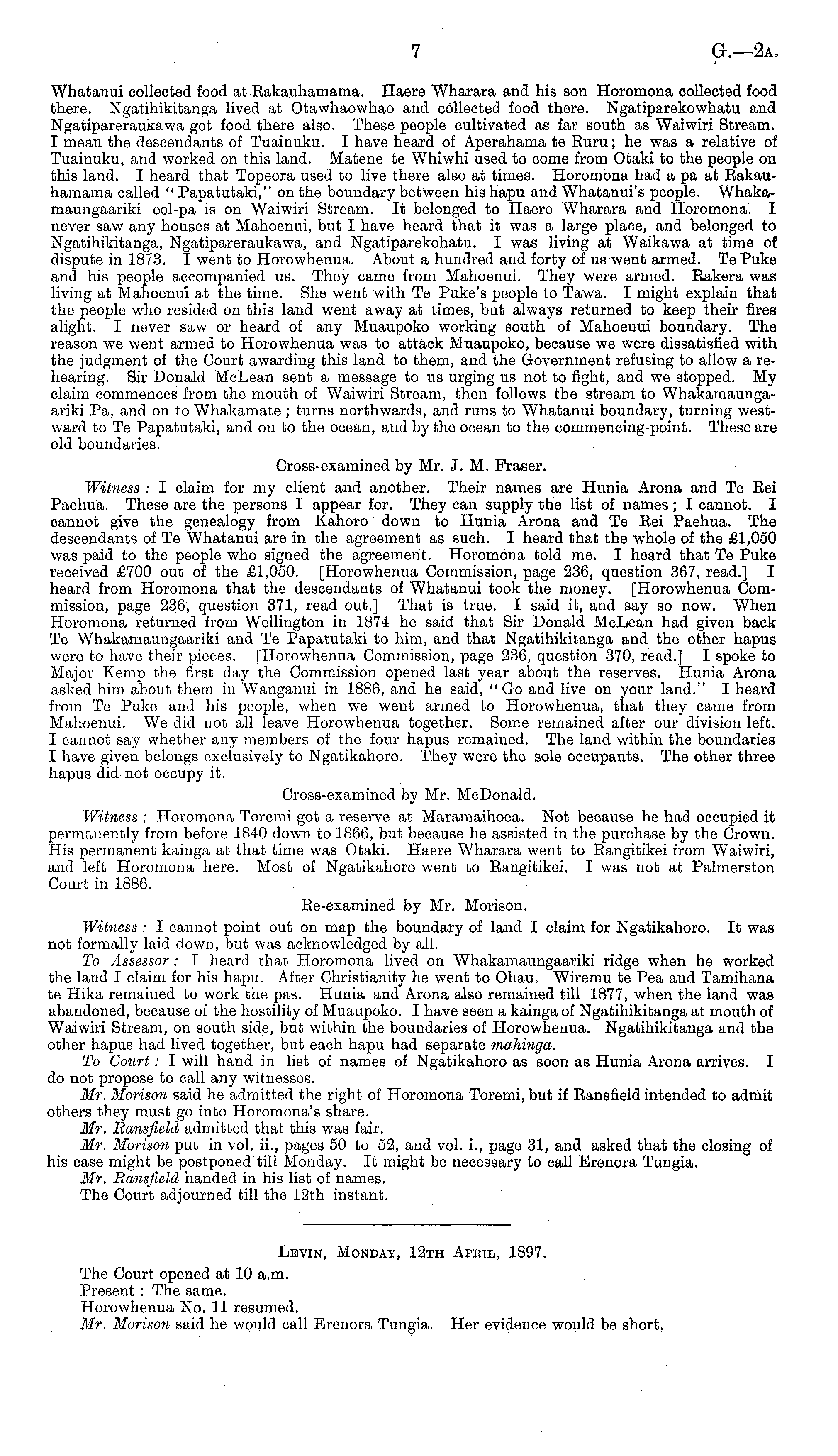 Whatanui collected food at Bakauhamama. Haere Wharara and his son Horomona collected food there. Ngatihikitanga lived at Otawhaowhao and collected food there. Ngatiparekowhatu and Ngatipareraukawa got food there also. These people cultivated as far south as Waiwiri Stream. I mean the descendants of Tuainuku. I have heard of Aperahama te Buru; he was a relative of Tuainuku, and worked on this land. Matene te Whiwhi used to come from Otaki to the people on this land. I heard that Topeora used to live there also at times. Horomona had apa at Bakauhamama called " Papatutaki," on the boundary between his hapu and Whatanui's people. Whakamaungaariki eel-pa is on Waiwiri Stream. It belonged to Haere Wharara and Horomona. I never saw any houses at Mahoenui, but I have heard that it was a large place, and belonged to Ngatihikitanga, Ngatipareraukawa, and Ngatiparekohatu. I was living at Waikawa at time of dispute in 1873. I went to Horowhenua. About a hundred and forty of us went armed. Te Puke and his people accompanied us. They came from Mahoenui. They were armed. Bakera was living at Mahoenui at the time. She went with Te Puke's people to Tawa. I might explain that the people who resided on this land went away at times, but always returned to keep their fires alight. I never saw or heard of any Muaupoko working south of Mahoenui boundary. The reason we went armed to Horowhenua was to attack Muaupoko, because we were dissatisfied with the judgment of the Court awarding this land to them, and the Government refusing to allow a rehearing. Sir Donald McLean sent a message to us urging us not to fight, and we stopped. My claim commences from the mouth of Waiwiri Stream, then follows the stream to Whakamaungaariki Pa, and on to Whakamate ; turns northwards, and runs to Whatanui boundary, turning westward to Te Papatutaki, and on to the ocean, and by the ocean to the commencing-point. These are old boundaries. Cross-examined by Mr. J. M. Fraser. Witness : I claim for my client and another. Their names are Hunia Arona and Te Bei Paehua. These are the persons I appear for. They can supply the list of names; I cannot. I cannot give the genealogy from Kahoro down to Hunia Arona and Te Bei Paehua. The descendants of Te Whatanui are in the agreement as such. I heard that the whole of the £1,050 was paid to the people who signed the agreement. Horomona told me. I heard that Te Puke received £700 out of the £1,050. [Horowhenua Commission, page 236, question 367, read.] I heard from Horomona that the descendants of Whatanui took the money. [Horowhenua Commission, page 236, question 371, read out.] That is true. I said it, and say so now. When Horomona returned from Wellington in 1874 he said that Sir Donald McLean had given back Te Whakamaungaariki and Te Papatutaki to him, and that Ngatihikitanga and the other hapus were to have their pieces. [Horowhenua Commission, page 236, question 370, read.] I spoke to Major Kemp the first day the Commission opened last year about the reserves. Hunia Arona asked him about them in Wanganui in 1886, and he said, "Go and live on your land." I heard from Te Puke and his people, when we went armed to Horowhenua, that they came from Mahoenui. We did not all leave Horowhenua together. Some remained after our division left. I cannot say whether any members of the four hapus remained. The land within the boundaries I have given belongs exclusively to Ngatikahoro. They were the sole occupants. The other three hapus did not occupy it. Cross-examined by Mr. McDonald. Witness : Horomona Toremi got a reserve at Maramaihoea. Not because he had occupied it permanently from before 1840 down to 1866, but because he assisted in the purchase by the Crown. His permanent kainga at that time was Otaki. Haere Wharara went to Bangitikei from Waiwiri, and left Horomona here. Most of Ngatikahoro went to Bangitikei. I was not at Palmerston Court in 1886. Ec-examined by Mr. Morison. Witness : I cannot point out on map the boundary of land I claim for Ngatikahoro. It was not formally laid down, but was acknowledged by all. To Assessor : I heard that Horomona lived on Whakamaungaariki ridge when he worked the land I claim for his hapu. After Christianity he went to Ohau. Wiremu te Pea and Tamihana te Hika remained to work the pas. Hunia and Arona also remained till 1877, when the land was abandoned, because of the hostility of Muaupoko. I have seen a kainga of Ngatihikitanga at mouth of Waiwiri Stream, on south side, but within the boundaries of Horowhenua. Ngatihikitanga and the other hapus had lived together, but each hapu had separate mahinga. To Court: I will hand in list of names of Ngatikahoro as soon as Hunia Arona arrives. I do not propose to call any witnesses. Mr. Morison said he admitted the right of Horomona Toremi, but if Bansfield intended to admit others they must go into Horomona's share. Mr. Ransfield admitted that this was fair. Mr. Morison put in vol. ii., pages 50 to 52, and vol. i., page 31, and asked that the closing of his case might be postponed till Monday. It might be necessary to call Erenora Tungia. Mr. Ransfield handed in his list of names. The Court adjourned till the 12th instant.