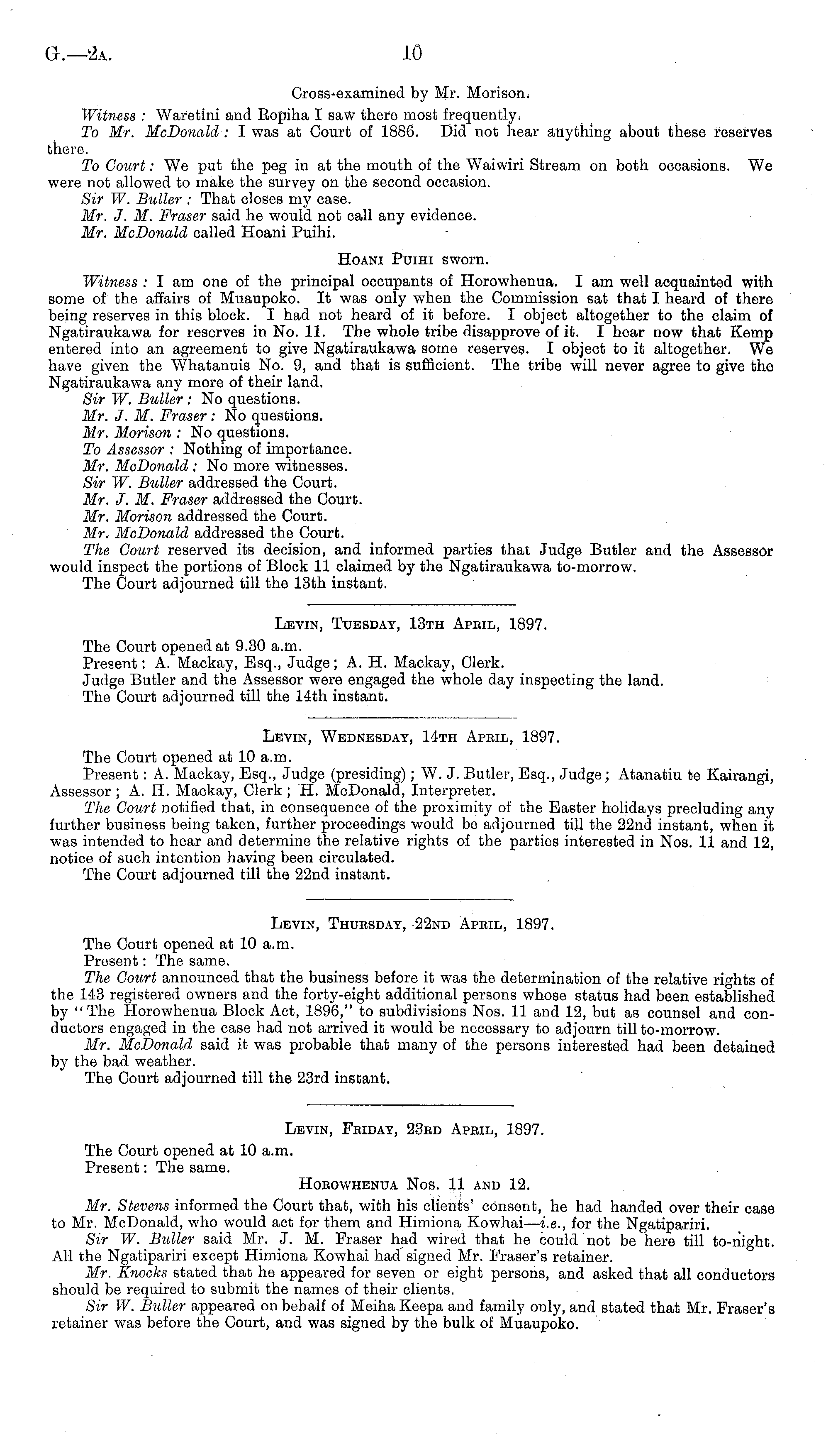 Levin, Feiday, 23bd Apeil, 1897. The Court opened at 10 a.m. Present: The same. Hoeowhenua Nos. 11 and 12. Mr. Stevens informed the Court that, with his clients' consent, he had handed over their case to Mr. McDonald, who would act for them and Himiona Kowhai— i.e., for the Ngatipariri. Sir W. Buller said Mr. J. M. Fraser had wired that he could not be here till to-night. All the Ngatipariri except Himiona Kowhai had signed Mr. Fraser's retainer. Mr. Knocks stated that he appeared for seven or eight persons, and asked that all conductors should be required to submit the names of their clients. Sir W. Buller appeared on behalf of Meiha Keepa and family only, and stated that Mr. Fraser's retainer was before the Court, and was signed by the bulk of Muaupoko.