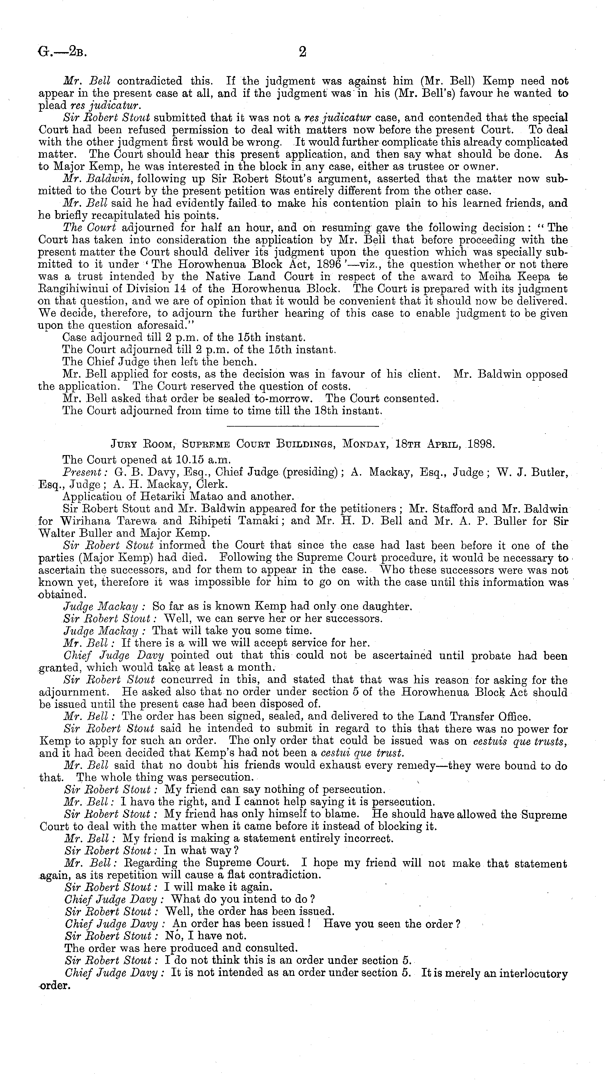 JUBY EoOM, SUPEEMB CoUET BUILDINGS, MONDAY, 18TH APEIL, 1898. The Court opened at 10.15 a.m. Present: G. B. Davy, Esq., Chief Judge (presiding); A. Mackay, Esq., Judge; W. J. Butler, Esq., Judge ; A. H. Mackay, Clerk. Application of Hetariki Matao and another. Sir Eobert Stout and Mr. Baldwin appeared for the petitioners ; Mr. Stafford and Mr. Baldwin for "Wirihana Tarewa and Eihipeti Tamaki; and Mr. H. D. Bell and Mr. A. P. Buller for Sir Walter Buller and Major Kemp. Sir Robert Stout informed the Court that since the case had last been before it one of the parties (Major Kemp) had died. Following the Supreme Court procedure, it would be necessary to ascertain the successors, and for them to appear in the case. Who these successors were was not known yet, therefore it was impossible for him to go on with the ease until this information was obtained. Judge Mackay : So far as is known Kemp had only one daughter. Sir Robert Stout: Well, we can serve her or her successors. Judge Mackay : That will take you some time. Mr. Bell: If there is a will we will accept service for her. Chief Judge Davy pointed out that this could not be ascertained until probate had been granted, which would take at least a month. Sir Robert Stout concurred in this, and stated that that was his reason for asking for the adjournment. He asked also that no order under section sof the Horowhenua Block Act should be issued until the present case had been disposed of. Mr. Bell: The order has been signed, sealed, and delivered to the Land Transfer Office. Sir Robert Stout said he intended to submit in regard to this that there was no power for Kemp to apply for such an order. The only order that could be issued was on cestuis que trusts, and it had been decided that Kemp's had not been a cestui que trust. Mr. Bell said that no doubt his friends would exhaust every remedy—they were bound to do that. The whole thing was persecution. Sir Robert Stout: My friend can say nothing of persecution. Mr. Bell: 1 have the right, and I cannot help saying it is persecution. Sir Robert Stout: My friend has only himself to blame. He should have allowed the Supreme Court to deal with the matter when it came before it instead of blocking it. Mr. Bell: My friend is making a statement entirely incorrect. Sir Robert Stout: In what way ? Mr. Bell: Begarding the Supreme Court. I hope my friend will not make that statement again, as its repetition will cause a flat contradiction. Sir Robert Stout: I will make it again. Chief Judge Davy : What do you intend to do ? Sir Robert Stout: Well, the order has been issued. Chief Judge Davy : An order has been issued ! Have you seen the order ? Sir Robert Stout: No, I have not. The order was here produced and consulted. Sir Robert Stout: Ido not think this is an order under section 5. Chief Judge Davy : It is not intended as an order under section 5. It is merely an interlocutory order.