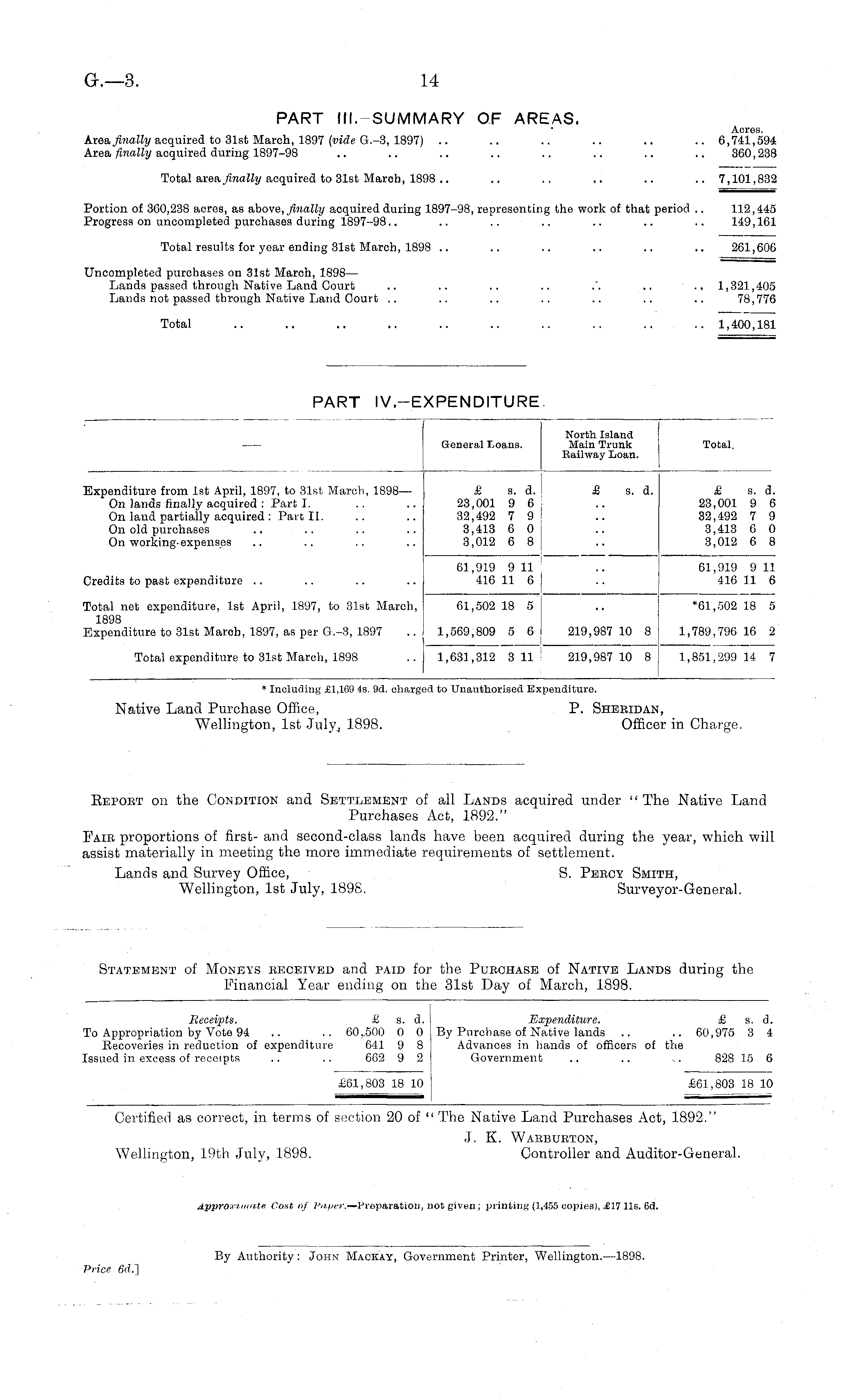 Certified as correct, in terms of section 20 of " The Native Land Purchases Act, 1892." J. K. Waebubton, Wellington, 19th July, 1898. Controller and Auditor-General. Approximate Cost of I'iiver.— Preparation, not given; printing (1,455 copies), £11 lls, 6d.