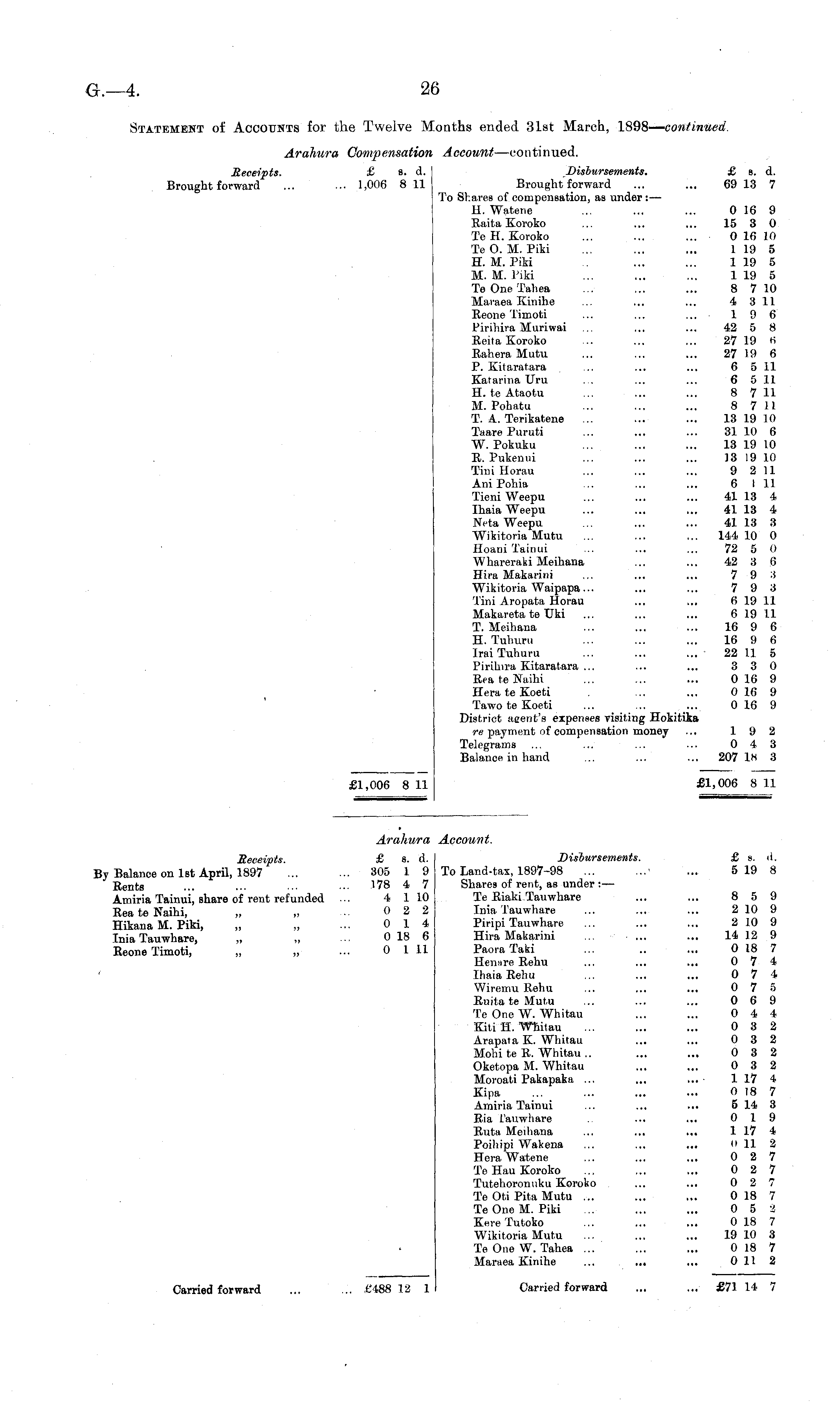 Statement of Accounts for the Twelve Months ended 31st March, 1898— continued. Arahura Compensation Account —continued. Receipts. £ s. d. Disbursements. £ s. d. Brought forward ... ... 1,006 811 Brought forward ... ... 69 13 7 To Shares of compensation, as under: — H. Watene ... ... ... 0 16 9 Raita Koroko ... ... ... 15 3 0 Te H. Koroko ... ... ... 0 16 10 Te 0. M. Piki ... ... ... 1 19 5 H. M. Piki ... ... 1 19 5 M. M. Piki ... ... ... 1 19 5 Te One Tahea ... ... ... 8 7 10 Maraea Kinihe ... ... ... 4311 Reone Timoti ... ... ... 19 6 Pirihira Muriwai ... ... ... 42 5 8 Reita Koroko ... ... ... 27 19 6 RaheraMutu ... ... ... 27 19 6 P. Kitaratara ... ... ... 6 5 11 Katarina Uru ... ... ... 6 5 11 H. te Ataotu ... ... ... 8 7 11 M. Pohatu ... ... ... 8 7 11 T. A. Terikatene ... ... ... 13 19 10 Taare Puruti ... ... ... 31 10 6 W. Pokuku ... ... ... 13 19 10 R. Pukenui ... ... ... 13 19 10 Tini Horau ... ... ... 9 2 11 AniPohia ... ... ... 6 I 11 Tieni Weepu ... ... ... 41 13 4 Ihaia Weepu ... ... ... 41 13 4 Neta Weepu ... ... ... 41 13 3 Wikitoria Mutu ... ... ... 144 10 0 Hoani Tainui ... ... ... 72 5 0 Whareraki Meihana ... ... 42 3 6 Hira Makarini ... ... ... 7 9 3 Wikitoria Waipapa... ... ... 7 9 3 Tini Aropata Horau ... ... 6 19 11 Makareta te Uki ... ... ... 619 11 T. Meihana ... ... ... 16 9 6 H. Tuhuru ... ... ... 16 9 6 IraiTuhuru ... ... ... - 22 11 5 Pirihira Kitaratara ... ... ... 3 3 0 Rea teNaihi ... ... ... 0 16 9 Hera te Koeti ... ... 0 16 9 Tawo te Koeti ... ... ... 0 16 9 District aeent's expenses visiting Hokitika re payment of compensation money ... 19 2 Telegrams ... ... ... ... 0 4 3 Balance in hand ... ... ... 207 IH 3 £1,006 8 11 £1,006 8 11