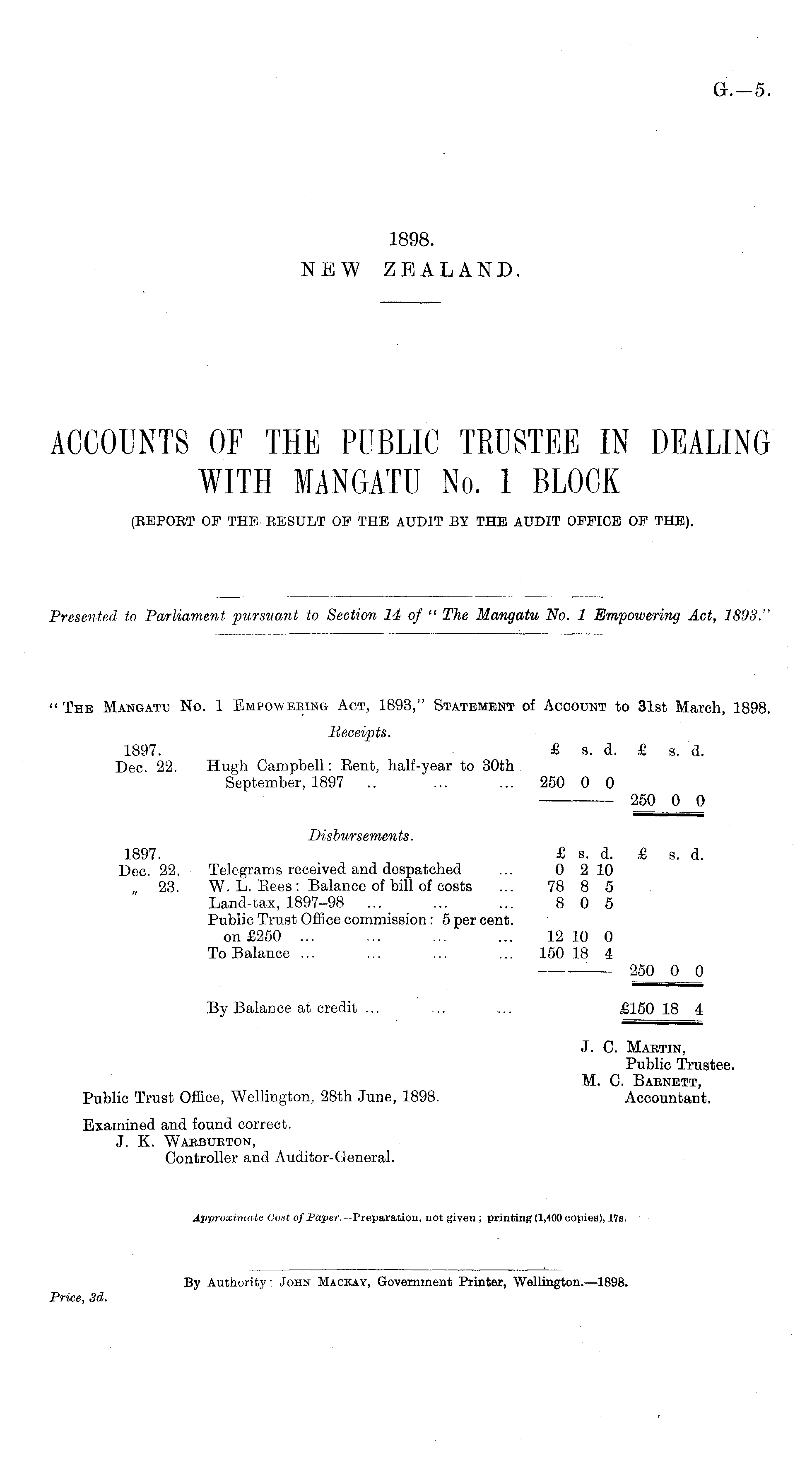 " The Mangatu No. 1 Empowering Act, 1893," Statement of Account to 31st March, 1898. Receipts. 1897. £ s. d. £ s. d. Dec. 22. Hugh Campbell: Eent, half-year to 30th September, 1897 .. ... ... 250 0 0 250_0_J) Disbursements. 1897. £ s. d. £ s. d. Dec. 22. Telegrams received and despatched ... 0 210 „ 23. W. L. Eees: Balance of bill of costs ... 78 8 5 Land-tax, 1897-98 ... ... ... 805 Public Trust Office commission: 5 per cent. on £250 ... ... ... ... 12 10 0 To Balance ... ... ... ... 150 18 4 250 0 0 By Balance at credit ... ... ... £150 18 4 J. C. Martin, Public Trustee. M. C. Baenett, Public Trust Office, Wellington, 28th June, 1898. Accountant. Examined and found correct. J. K. Waebueton, Controller and Auditor-General. Approximate Cost of Paper. —Preparation, not given ; printing (1,400 copies), 17s.