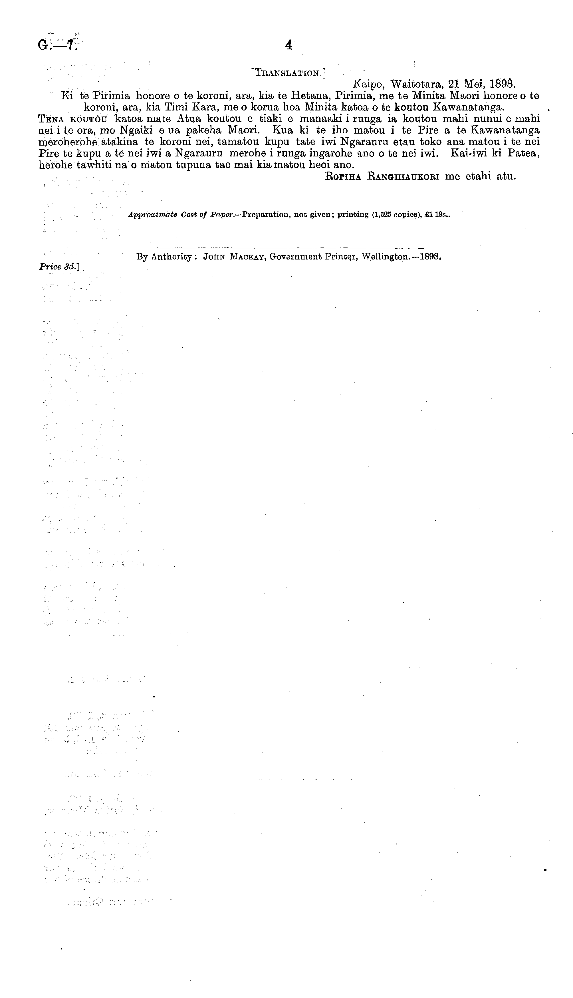 [Teanslation.] Kaipo, Waitotara, 21 Mci, 1898. Xi te Pirimia honore o te koroni, ara, kia te Hetana, Pirimia, me te Minita Maori honoreo te koroni, ara, kia Timi Kara, me o korua hoa Minita katoa o te koutou Kawanatanga. Tena koutou katoa mate Atua koutou c tiaki c manaaki i runga ia koutou mahi nunui c mahi nei ite ora, mo Ngaiki eva pakeha Maori. Kua kite iho matou i te Pire a te Kawanatanga meroherohe atakina te koroni nei, tamatou kupu tate iwi Ngarauru etau toko ana matou i te nei Pire te kupu ate nei iwi a Ngarauru merohe i runga ingarohe ano ote nei iwi. Kai-iwi ki Patea, herohe tawhiti na o matou tupuna tae mai kia matou heoi ano. Eopiha Eangihaukobi me etahi atu. Approximate Cost of Paper.—Preparation, not given; printing (1,325 copies), £1195..