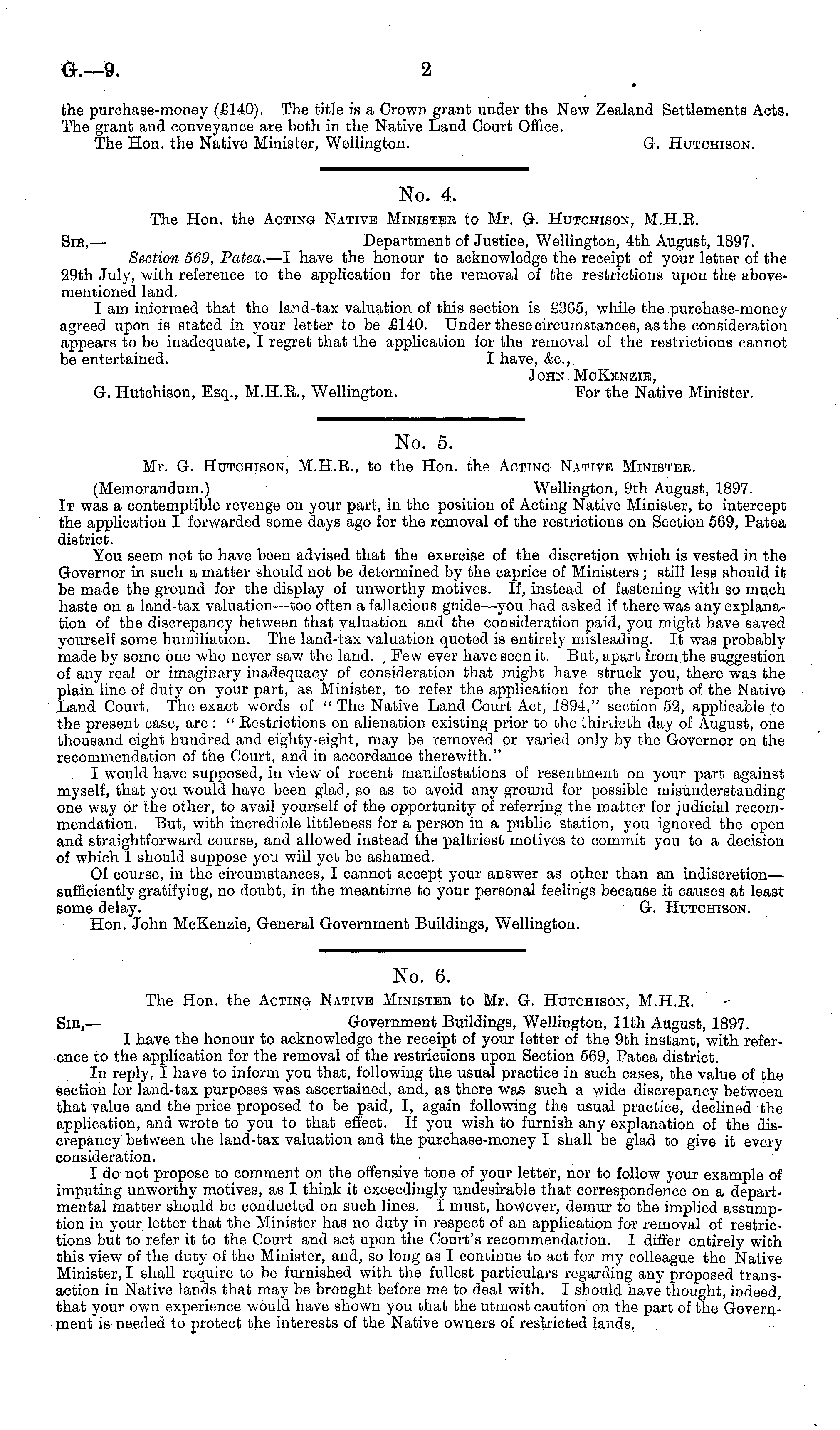 No. 5. Mr. G. Hutchison, M.H.E,, to the Hon. the Acting Native Ministbe. (Memorandum.) Wellington, 9th August, 1897. It was a contemptible revenge on your part, in the position of Acting Native Minister, to intercept the application I forwarded some days ago for the removal of the restrictions on Section 569, Patea district. You seem not to have been advised that the exercise of the discretion which is vested in the Governor in such a matter should not be determined by the caprice of Ministers; still less should it be made the ground for the display of unworthy motives. If, instead of fastening with so much haste on a land-tax valuation—too often a fallacious guide—you had asked if there was any explanation of the discrepancy between that valuation and the consideration paid, you might have saved yourself some humiliation. The land-tax valuation quoted is entirely misleading. It was probably made by some one who never saw the land. . Few ever have seen it. But, apart from the suggestion of any real or imaginary inadequacy of consideration that might have struck you, there was the plain line of duty on your part, as Minister, to refer the application for the report of the Native Land Court. The exact words of " The Native Land Court Act, 1894," section 52, applicable to the present case, are : " Restrictions on alienation existing prior to the thirtieth day of August, one thousand eight hundred and eighty-eight, may be removed or varied only by the Governor on the recommendation of the Court, and in accordance therewith." I would have supposed, in view of recent manifestations of resentment on your part against myself, that you would have been glad, so as to avoid any ground for possible misunderstanding one way or the other, to avail yourself of the opportunity of referring the matter for judicial recommendation. But, with incredible littleness for a person in a public station, you ignored the open and straightforward course, and allowed instead the paltriest motives to commit you to a decision of which I should suppose you will yet be ashamed. Of course, in the circumstances, I cannot accept your answer as other than an indiscretion— sufficiently gratifying, no doubt, in the meantime to your personal feelings because it causes at least some delay. G. Hutchison. Hon. John McKenzie, General Government Buildings, Wellington.