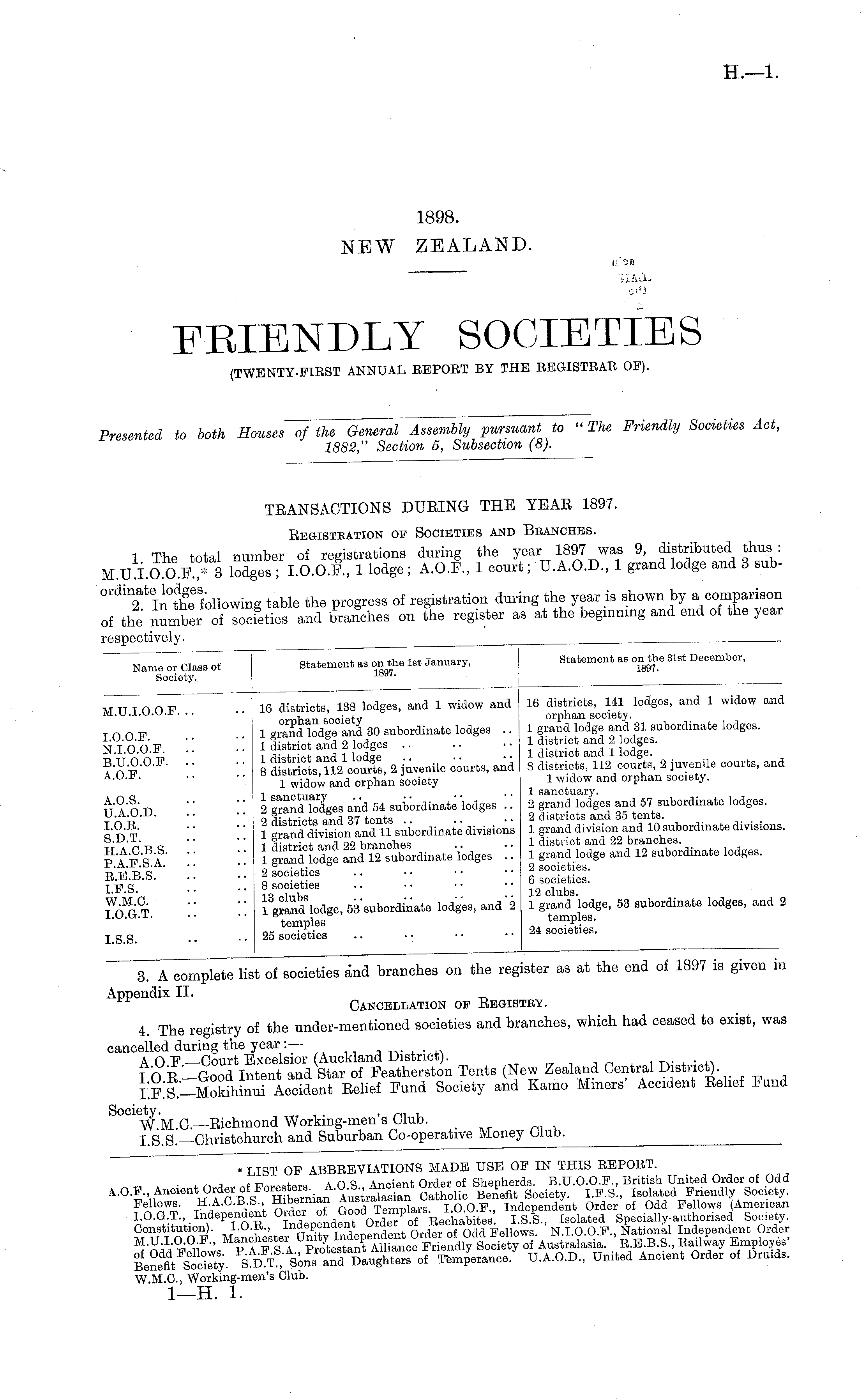 TEANSACTIONS DUBING THE YBAE 1897. Begistbation of Societies and Bbanches. 1 The total number of registrations during the year 1897 was 9, distributed thus : M.TJXO.C».]?.,* 3 lodges ; 1.0.01, 1 lodge ; A.0.F., 1 court; U.A.0.D., 1 grand lodge and 3 subordinate lodges rf istrafcion during the year ia shown by a comparison of the number of Sties and branches on the register as at the beginning and end of the year respectively.