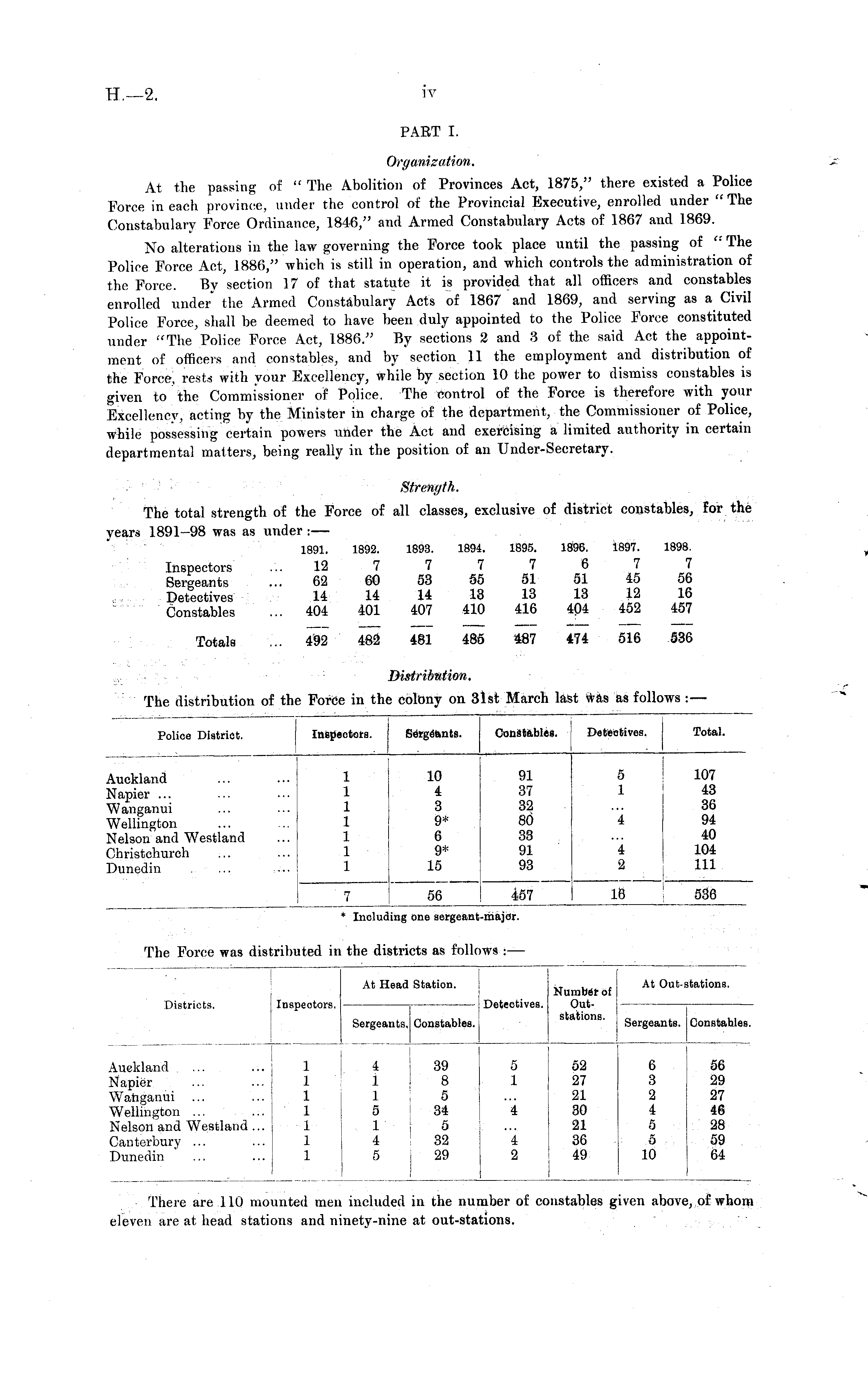 PART I. Organization. At the passing of " The Abolition of Provinces Act, 1875/' there existed a Police Force in each province, under the control of the Provincial Executive, enrolled under " The Constabulary Force Ordinance, 1846," and Armed Constabulary Acts of 1867 and 1869. No alterations in the law governing the Force took place until the passing of " The Police Force Act, 1886," which is still in operation, and which controls the administration of the Force. By section 17 of that statute it is provided that all officers and constables enrolled under" the Armed Constabulary Acts of 1867 and 1869, and serving as a Civil Police Force, shall be deemed to have been duly appointed to the Police Force constituted under "The Police Force Act, 1886." By sections 2 and 3 of the said Act the appointment of officers and constables, and by section 11 the employment and distribution of the Force, rests with your Excellency, while by section 10 the power to dismiss constables is given to the Commissioner of Police. The control of the Force is therefore with your Excellency, acting by the Minister in charge of the department, the Commissioner of Police, while possessing certain powers under the Act and exercising a limited authority in certain departmental matters, being really in the position of an Under-Secretary. Strength. The total strength of the Force of all classes, exclusive of district constables, for the years 1891-98 was as under : — 1891. 1892. 1893. 1894. 1895. 1896. 1897. 1898. Inspectors ... 12 7 7 7 7 6 7 7 Sergeants ... 62 60 53 55 51 51 45 56 Detectives 14 14 14 13 13 13 12 16 Constables ... 404 401 407 410 416 404 452 457 Totals ... 492 482 481 485 487 474 516 536