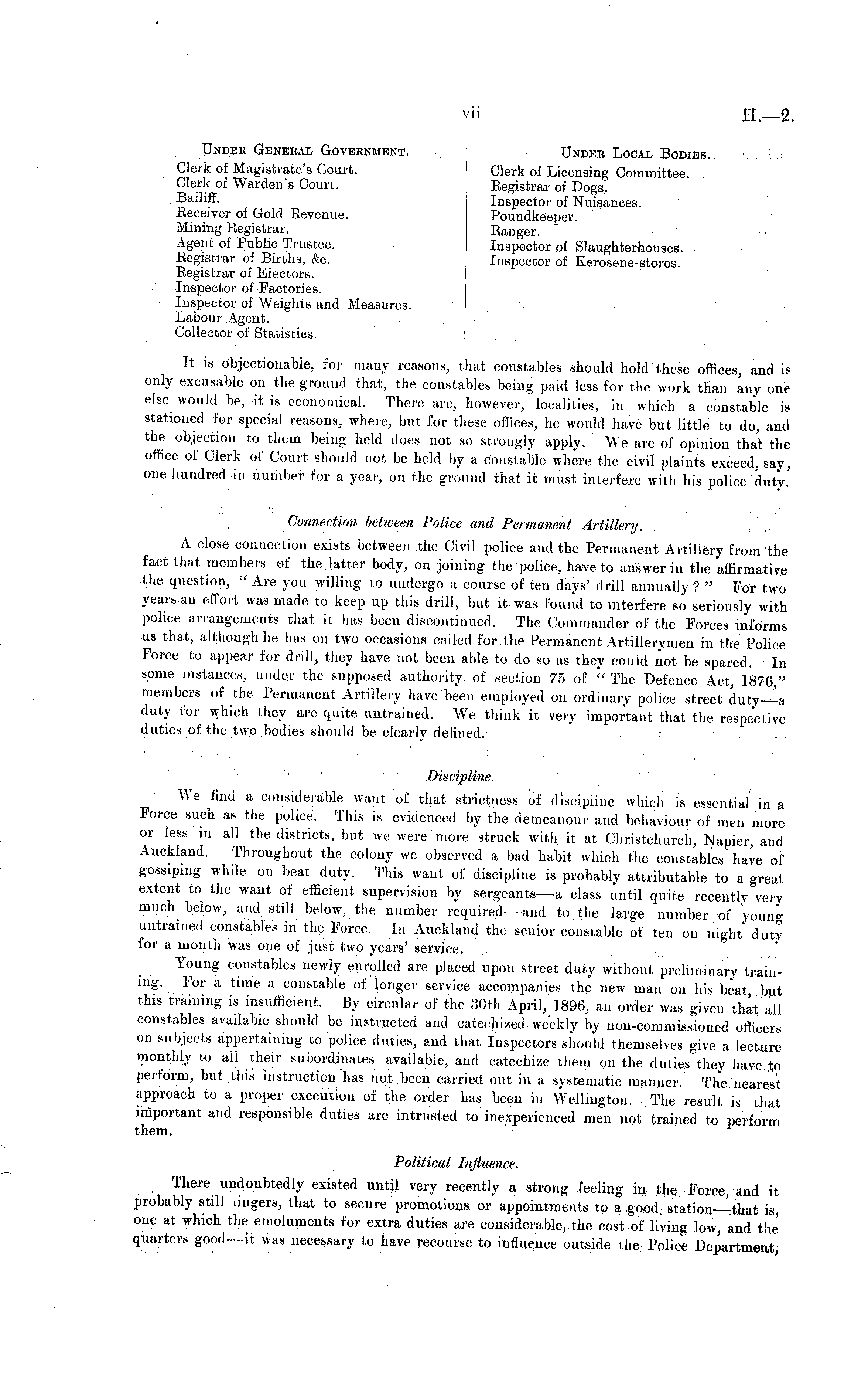 It is objectionable, for many reasons, that constables should hold these offices, and is only excusable on the ground that, the constables being paid less for the work than any one else would be, it is economical. There are, however, localities, in which a constable is stationed for special reasons, where, but for these offices, he would have but little to do, and the objection to them being held does not so strongly apply. We are of opinion that the office of Clerk of Court should not be held by a constable where the civil plaints exceed, say, one hundred in number for a year, on the ground that it must interfere with his police duty.' . Connection between Police and Permanent Artillery. ■ , . A close connection exists between the Civil police and the Permanent Artillery from the fact that members of the latter body, on joining the police, have to answer in the affirmative the question, '■' Are you willing to undergo a course of ten days' drill annually ? " For two years an effort was made to keep up this drill, but it was found to interfere so seriously with police arrangements that it has been discontinued. The Commander of the Forces informs us that, although he has on two occasions called for the Permanent Artillerymen in the Police Force to appear for drill, they have not been able to do so as they could not be spared. In some instances, under the supposed authority of section 75 of "The Defence Act, 1876," members of the Permanent Artillery have been employed on ordinary police street duty—a duty for which they are quite untrained. We think it very important that the respective duties of the two bodies should be clearly denned. Discipline. We find a considerable want of that strictness of discipline which is essential in a Force such as the police. This is evidenced by the demeanour and behaviour of men more or less in all the districts, but we were more struck with it at Christchurch, Napier and Auckland. Throughout the colony we observed a bad habit which the constables have of gossiping while on beat duty. This want of discipline is probably attributable to a great extent to the want of efficient supervision by sergeants—a class until quite recently very much below, and still below, the number required—and to the large number of 'young untrained constables in the Force. In Auckland the senior constable of ten on night' duty tor a month was one of just two years' service. Young constables newly enrolled are placed upon street duty without preliminary training. For a time a constable of longer service accompanies the new man on his beat but tins training is insufficient. By circular of the 30th April, 1896, an order was given that all constables available should be instructed and catechized weekly by non-commissioned officers on subjects appertaining to police duties, and that Inspectors should themselves give a lecture monthly to all their subordinates available, and catechize them on the duties they have to perform, but this instruction has not been carried out in a systematic manner. The nearest approach to a proper execution of the order has been iv Wellington. The result is that important and responsible duties are intrusted to inexperienced men not trained to perform them. Political Influence. There undoubtedly existed until very recently a strong feeling in the Force, and it probably still lingers, that to secure promotions or appointments to a good station—that is, one at which the emoluments for extra duties are considerable,.the cost of living low, and the quarters good—it was necessary to have recourse to influence outside the Police Department