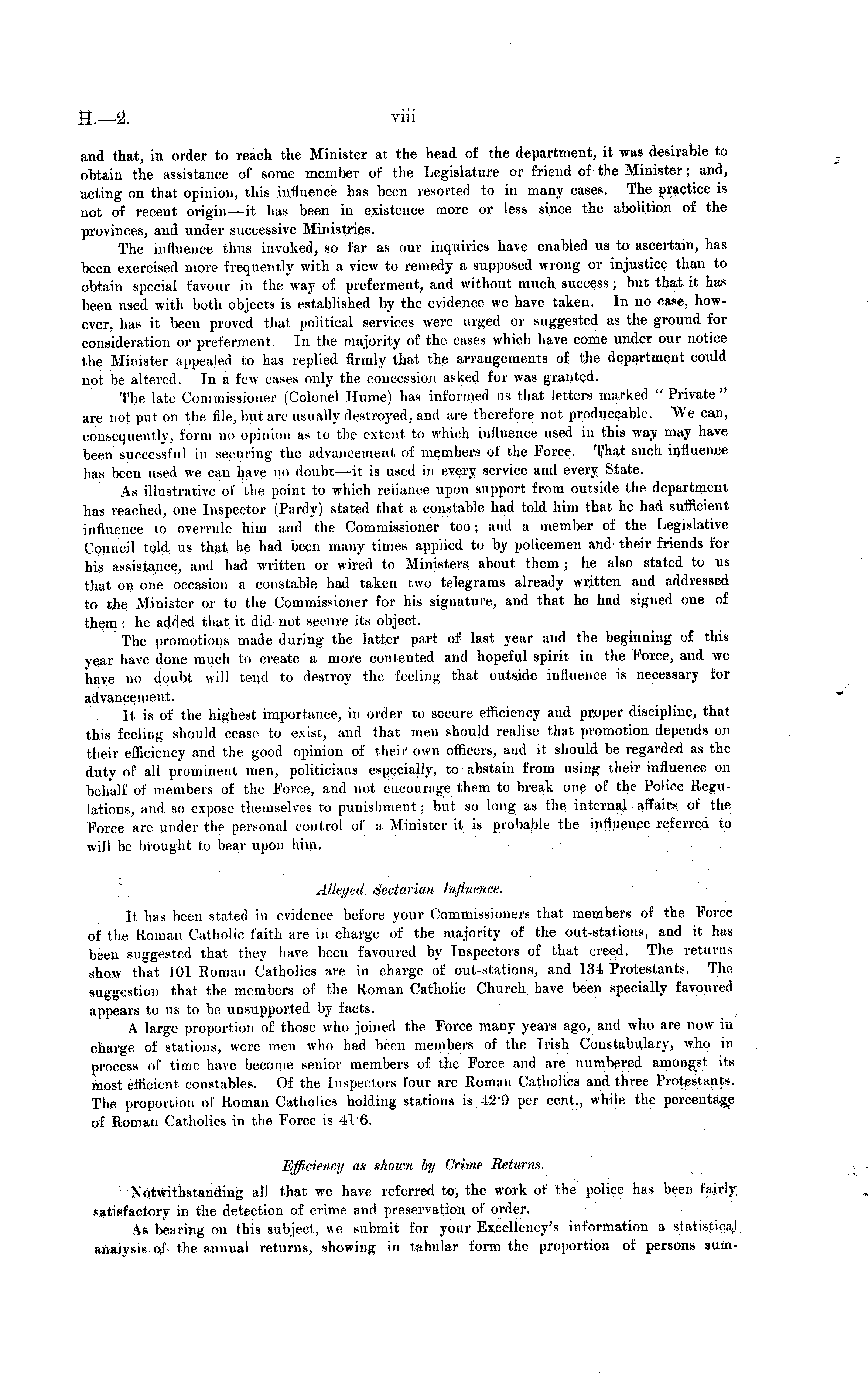 and that, in order to reach the Minister at the head of the department, it was desirable to obtain the assistance of some member of the Legislature or friend of the Minister; and, acting on that opinion, this influence has been resorted to in many cases. The practice is not of recent origin—it has been in existence more or less since the abolition of the provinces, and under successive Ministries. The influence thus invoked, so far as our inquiries have enabled us to ascertain, has been exercised more frequently with a view to remedy a supposed wrong or injustice than to obtain special favour in the way of preferment, and without much success; but that it has been used with both objects is established by the evidence we have taken. In no case, however, has it been proved that political services were urged or suggested as the ground for consideration or preferment. In the majority of the cases which have come under our notice the Minister appealed to has replied firmly that the arrangements of the department could not be altered. In a few cases only the concession asked for was granted. The late Commissioner (Colonel Hume) has informed us that letters marked " Private " are not put on the file, but are usually destroyed, and are therefore not produceable. We can, consequently, form no opinion as to the extent to which influence used in this way may have been successful in securing the advancement of members of the Force. That such influence has been used we can have no doubt —it is used in every service and every State. As illustrative of the point to which reliance upon support from outside the department has reached, one Inspector (Pardy) stated that a constable had told him that he had sufficient influence to overrule him and the Commissioner too; and a member of the Legislative Council told us that he had been many times applied to by policemen and their friends for his assistance, and had written or wired to Ministers about them ; he also stated to us that on one occasion a constable had taken two telegrams already written and addressed to the Minister or to the Commissioner for his signature, and that he had signed one of them : he added that it did not secure its object. The promotions made during the latter part of last year and the beginning of this year have done much to create a more contented and hopeful spirit in the Force, and we nave no doubt will tend to destroy the feeling that outside influence is necessary for advancement. It is of the highest importance, in order to secure efficiency and proper discipline, that this feeling should cease to exist, and that men should realise that promotion depends on their efficiency and the good opinion of their own officers, and it should be regarded as the duty of all prominent men, politicians especially, to abstain from using their influence on behalf of members of the Force, and not encourage them to break one of the Police Regulations, and so expose themselves to punishment; but so long as the internal affairs of the Force are under the personal control of a Minister it is probable the influence referred to will be brought to bear upon him. Alleyed /Sectarian Influence. It has been stated in evidence before your Commissioners that members of the Force of the Roman Catholic faith are in charge of the majority of the out-stations, and it has been suggested that they have been favoured by Inspectors of that creed. The returns show that 101 Roman Catholics are in charge of out-stations, and 134 Protestants. The suggestion that the members of the Roman Catholic Church have been specially favoured appears to us to be unsupported by facts. A large proportion of those who joined the Force many years ago, and who are now in charge of stations, were men who had been members of the Irish Constabulary, who in process of time have become senior members of the Force and are numbered amongst its most efficient constables. Of the Inspectors four are Roman Catholics and three Protestants. The proportion of Roman Catholics holding stations is 42 - 9 per cent., while the percentage of Roman Catholics in the Force is 41 6. Efficiency as shown by Crime Returns. Notwithstanding all that we have referred to, the work of the police has been fairly, satisfactory in the detection of crime and preservation of order. As bearing on this subject, we submit for your Excellency's information a statistical analysis the annual returns, showing in tabular form the proportion of persons sum-