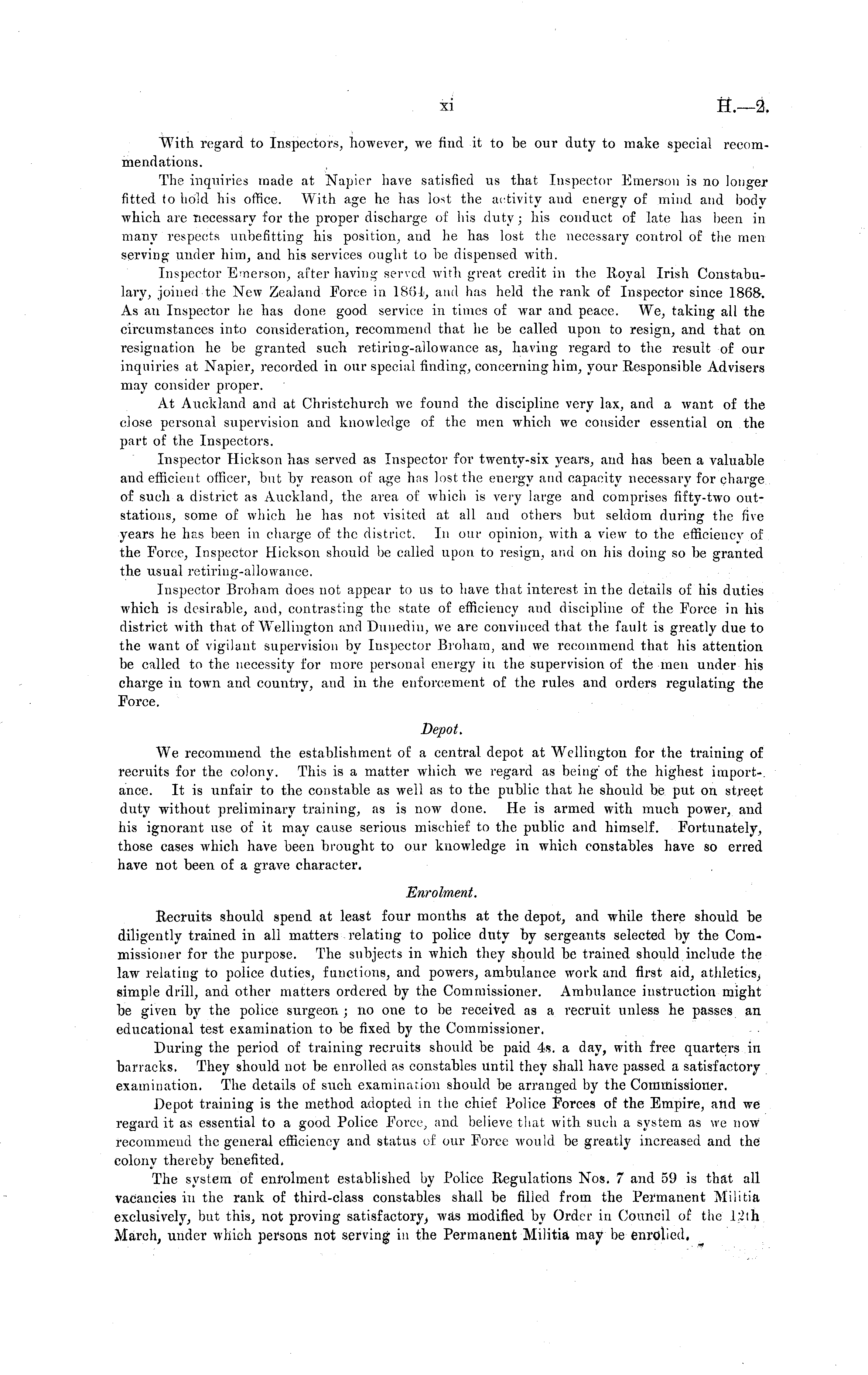 With regard to Inspectors, however, we find it to be our duty to make special recommendations. The inquiries made at Napier have satisfied us that Inspector Emerson is no longer fitted to hold his office. With age he has lost the activity and energy of mind and body which are necessary for the proper discharge of his duty; his conduct of late has been in many respects unbefitting his position, and he has lost the necessary control of the men serving under him, and his services ought to be dispensed with. Inspector Emerson, after having served with great credit in the Royal Irish Constabulary, joined the New Zealand Force in 1864, and has held the rank of Inspector since 1868. As an Inspector he has done good service in times of war and peace. We, taking all the circumstances into consideration, recommend that he be called upon to resign, and that on resignation he be granted such retiring-allowance as, having regard to the result of our inquiries at Napier, recorded in our special finding, concerning him, your Responsible Advisers may consider proper. At Auckland and at Christchurch we found the discipline very lax, and a want of the close personal supervision and knowledge of the men which we consider essential on the part of the Inspectors. Inspector Hickson has served as Inspector for twenty-six years, and has been a valuable and efficieut officer, but by reason of age has lost the energy and capacity necessary for charge of such a district as Auckland, the area of which is very large and comprises fifty-two outstations, some of which he has not visited at all atid others but seldom during the five years he has been in charge of the district. In our opinion, with a view to the efficiency of the Force, Inspector Hickson should be called upon to resign, and on his doing so be granted the usual retiring-allowance. Inspector Broh'am does not appear to us to have that interest in the details of his duties which is desirable, and, contrasting the state of efficiency and discipline of the Force in his district with that of Wellington and Dunedin, we are convinced that the fault is greatly due to the want of vigilant supervision by Inspector Broham, and we recommend that his attention be called to the necessity for more personal energy in the supervision of the men under his charge in town and country, and in the enforcement of the rules and orders regulating the Force. Depot. We recommend the establishment of a central depot at Wellington for the training of recruits for the colony. This is a matter which we regard as being of the highest importance. It is unfair to the constable as well as to the public that he should be put on street duty without preliminary training, as is now done. He is armed with much power, and his ignorant use of it may cause serious mischief to the public and himself. Fortunately, those cases which have been brought to our knowledge in which constables have so erred have not been of a grave character. Enrolment. Recruits should spend at least four months at the depot, and while there should be diligently trained in all matters relating to police duty by sergeants selected by the Commissioner for the purpose. The subjects in which they should be trained should include the law relating to police duties, functions, and powers, ambulance work and first aid, simple drill, and other matters ordered by the Commissioner. Ambulance instruction might be given by the police surgeon ; no one to be received as a recruit unless he passes an educational test examination to be fixed by the Commissioner. During the period of training recruits should be paid 4s. a day, with free quarters in barracks. They should not be enrolled as constables until they shall have passed a satisfactory examination. The details of siich examination should be arranged by the Commissioner. Depot training is the method adopted in the chief Police Forces of the Empire, and we regard it as essential to a good Police Force, and believe that with such a system as we now recommend the general efficiency and status of our Force would be greatly increased and the colony thereby benefited, The system of enrolment established by Police Regulations Nos. 7 and 59 is that all vacancies in the rank of third-class constables shall be filled from the Permanent Militia exclusively, but this, not proving satisfactory, was modified by Order in Council of the I:2th March, under which persons not serving in the Permanent Militia may be enrolled,
