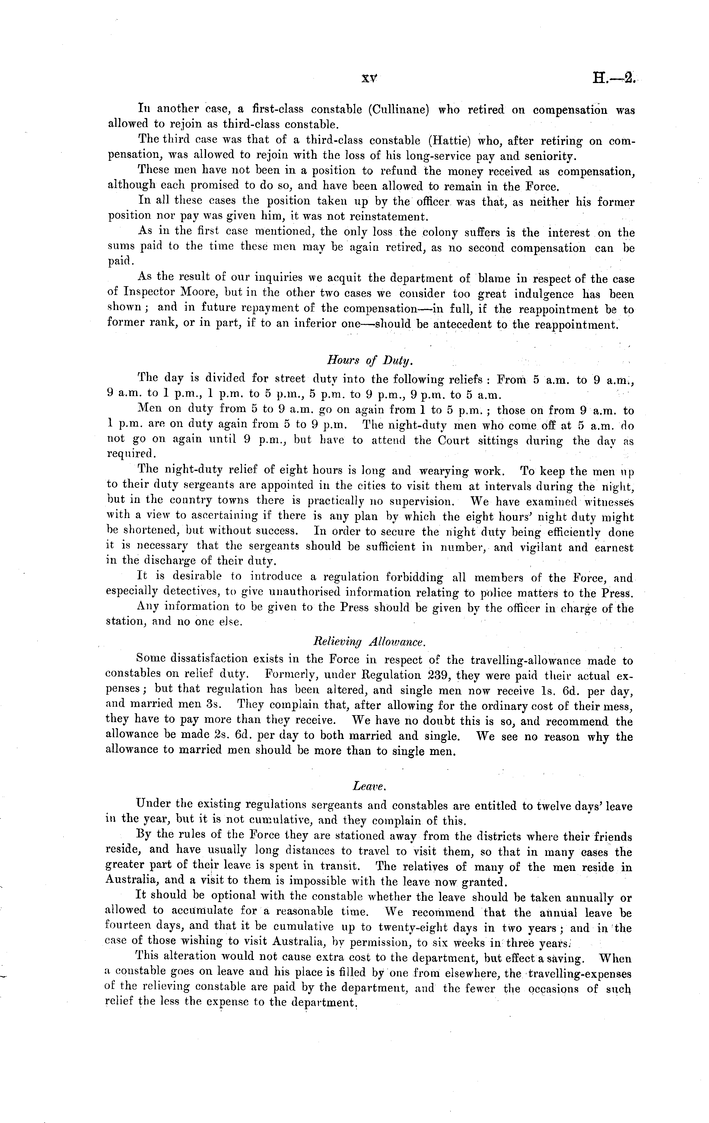 In another case, a first-class constable (Cullinane) who retired on compensation was allowed to rejoin as third-class constable. The third case was that of a third-class constable (Hattie) who, after retiring on compensation, was allowed to rejoin with the loss of his long-service pay and seniority. These men have not been in a position to refund the money received as compensation, although each promised to do so, and have been allowed to remain in the Force. In all these cases the position taken up by the officer was that, as neither his former position nor pay was given him, it was not reinstatement. As in the first case mentioned, the only loss the colony suffers is the interest on the sums paid to the time these men may be again l-etired, as no second compensation can be paid. As the result of our inquiries we acquit the department of blame in respect of the case of Inspector Moore, but in the other two cases we consider too great indulgence has been shown • and in future repayment of the compensation—in full, if the reappointment be to former rank, or in part, if to an inferior one—should be antecedent to the reappointment. Hours of Duty. The day is divided for street duty into the following reliefs : From 5 a.m. to 9 a.m., 9 a.m. to 1 p.m., 1 p.m. to 5 p.m., 5 p.m. to 9 p.m., 9 p.m. to 5 a.m. Men on duty from 5 to 9 a.m. go on again from 1 to 5 p.m. ; those on from 9 a.m. to 1 p.m. are on duty again from sto 9 p.m. The night-duty men who come off at 5 a.m. do not go on again until 9 p.m., but have to attend the Court sittings during the day as required. The night-duty relief of eight hours is long and wearying work. To keep the men up to their duty sergeants are appointed in the cities to visit them at intervals during the night, but in the country towns there is practically no supervision. We have examined witnesses with a view to ascertaining if there is any plan by which the eight hours' night duty might be shortened, but without success. In order to secure the night duty being efficiently done it is necessary that the sergeants should be sufficient in number, and vigilant and earnest in the discharge of their duty. It is desirable to introduce a regulation forbidding all members of the Force, and especially detectives, to give unauthorised information relating to police matters to the Press. Any information to be given to the Press should be given by the officer in charge of the station, and no one else. Relieving Allowance. Some dissatisfaction exists in the Force in respect o? the travelling-allowance made to constables on relief duty. Formerly, under Regulation 239, they were paid their actual expenses ; but that regulation has been altered, and single men now receive Is. 6d. per day, and married men 3s. They complain that, after allowing for the ordinary cost of their mess, they have to pay more than they receive. We have no doubt this is so, and recommend the allowance be made 2s. 6d. per day to both married and single. We see no reason why the allowance to married men should be more than to single men. Leave. Under the existing regulations sergeants and constables are entitled to twelve days' leave in the year, but it is not cumulative, and they complain of this. By the rules of the Force they are stationed away from the districts where their friends reside, and have usually long distances to travel to visit them, so that in many eases the greater part of their leave is spent in transit. The relatives of many of the men reside in Australia, and a visit to them is impossible with the leave now granted. It should be optional with the constable whether the leave should be taken annually or allowed to accumulate for a reasonable time. We recommend that the annual leave be fourteen days, and that it be cumulative up to twenty-eight days in two years; and in the case of those wishing to visit Australia, by permission, to six weeks in three years. This alteration would not cause extra cost to the department, but effect a saving. When a constable goes on leave and his place is filled by one from elsewhere, the travelling-expenses of the relieving constable are paid by the department, and the fewer the occasions of such relief the less the expense to the department.