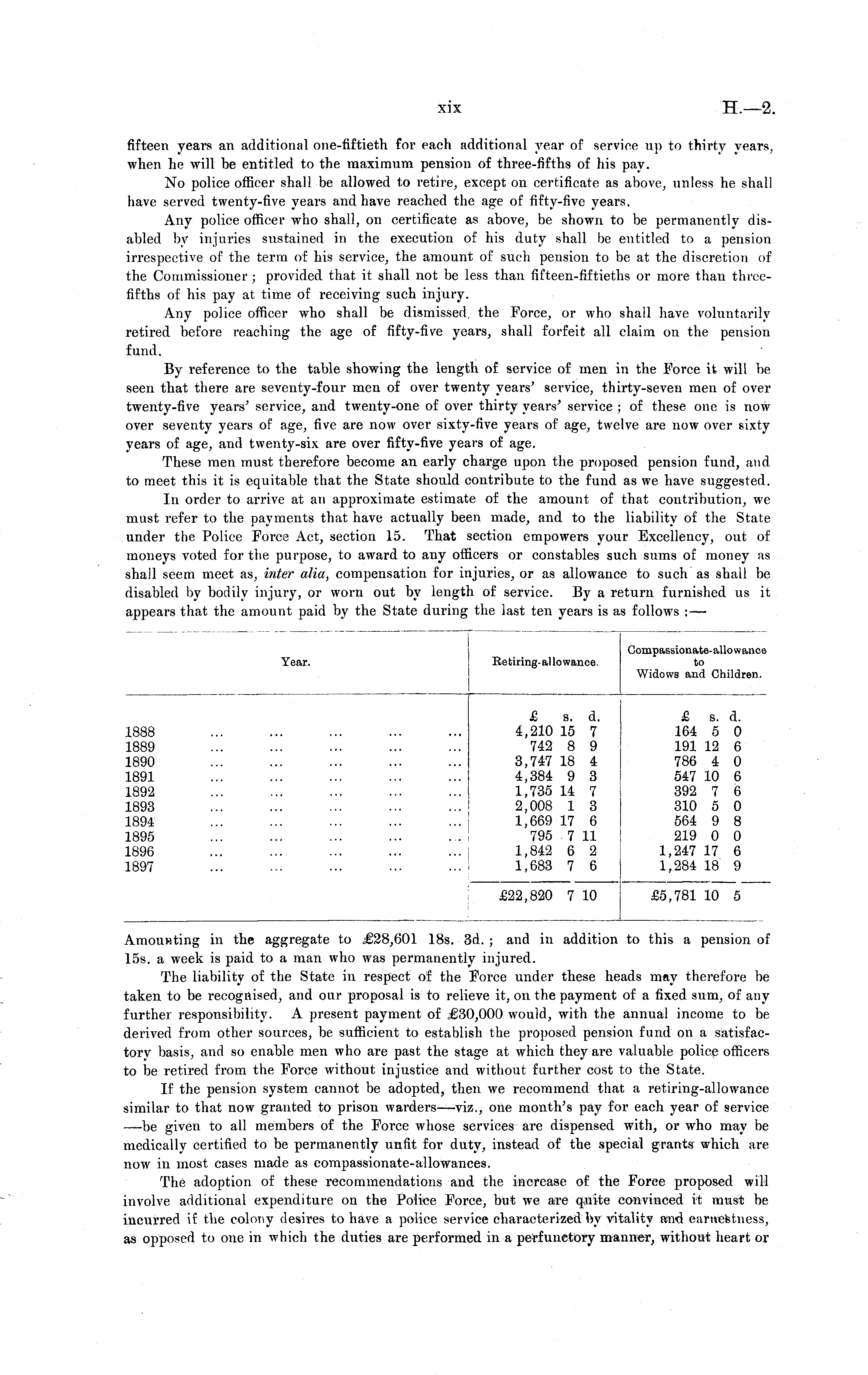 Amounting in the aggregate to £28,601 18s. 3d. ; and in addition to this a pension of 15s. a week is paid to a man who was permanently injured. The liability of the State in respect of the Force under these heads may therefore be taken to be recognised, and our proposal is to relieve it, on the payment of a fixed sum, of any further responsibility. A present payment of £30,000 would, with the annual income to be derived from other sources, be sufficient to establish the proposed pension fund on a satisfactory basis, and so enable men who are past the stage at which they are valuable police officers to be retired from the Force without injustice and without further cost to the State. If the pension system cannot be adopted, then we recommend that a retiring-allowance similar to that now granted to prison warders—viz., one month's pay for each year of service —be given to all members of the Force whose services are dispensed with, or who may be medically certified to be permanently unfit for duty, instead of the special grants which are now in most cases made as compassionate-allowances. The adoption of these recommendations and the increase of the Force proposed will involve additional expenditure on the Police Force, but we are quite convinced it must be incurred if the colony desires to have a police service characterized by vitality and earnestness, as opposed to one in which the duties are performed in a perfunctory manner, without heart or