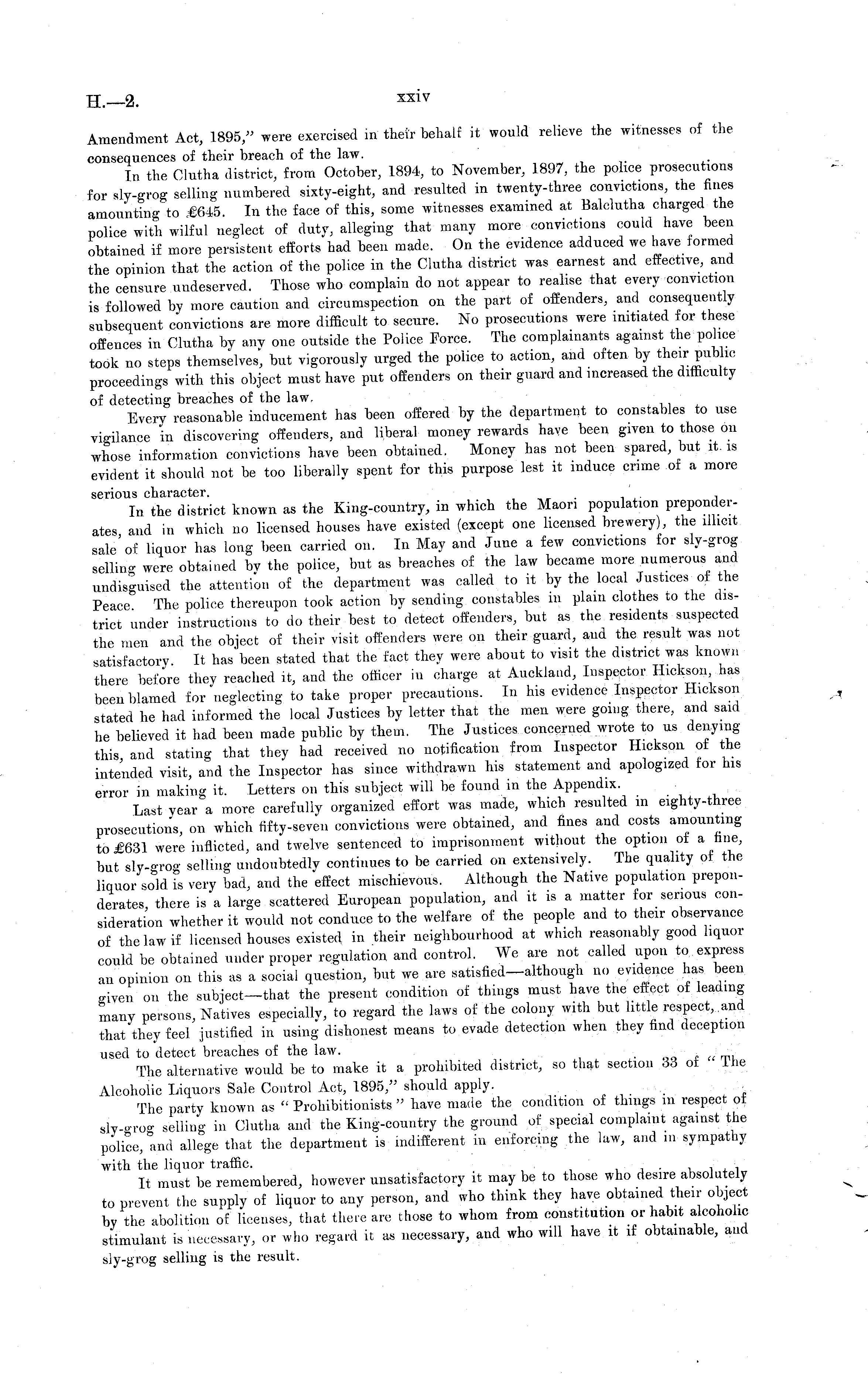 Amendment Act, 1895," were exercised m their behalf it would relieve the witnesses of the consequences of their breach of the law. In the Clutha district, from October, 1894, to November, 1897, the police prosecutions for sly-grog selling numbered sixty-eight, and resulted in twenty-three convictions, the fines amounting to ,€645. In the face of this, some witnesses examined at Balclutha charged the police with wilful neglect of duty, alleging that many more convictions could have been obtained if more persistent efforts had been made. On the evidence adduced we have formed the opinion that the action of the police in the Clutha district was earnest and effective, and the censure undeserved. Those who complain do not appear to realise that every conviction is followed by more caution and circumspection on the part of offenders, and consequently subsequent convictions are more difficult to secure. No prosecutions were initiated Jor these offences in Clutha by any one outside the Police Force. The complainants against the pohce took no steps themselves", but vigorously urged the police to action, and often by their public proceedings with this object must have put offenders on their guard and increased the difficulty of detecting breaches of the law. Every reasonable inducement has been offered by the department to constables to use vigilance in discovering offenders, and liberal money rewards have been given to those on whose information convictions have been obtained. Money has not been spared, but it is evident it should not be too liberally spent for this purpose lest it induce crime of a more serious character. . In the district known as the King-country, in which the Maori population preponderates and in which no licensed houses have existed (except one licensed brewery), the illicit sale'of liquor has long been carried on. In May and June a few convictions for sly-grog selling were obtained by the police, but as breaches of the law became more numerous and undisguised the attention of the department was called to it by the local Justices of the Peace The police thereupon took action by sending constables in plain clothes to the district under instructions to do their best to detect offenders, but as the residents suspected the men and the object of their visit offenders were on their guard, and the result was not satisfactory It has been stated that the fact they were about to visit the d lS tnct was known there before they reached it, and the officer in charge at Auckland, Inspector Hickson, has been blamed for neglecting to take proper precautions. In his evidence Inspector Hickson stated he had informed the local Justices by letter that the men were going there, and said he believed it had been made public by them. The Justices concerned wrote to us denying this and stating that they had received no notification from Inspector Hickson of the intended visit, and the Inspector has since withdrawn his statement and apologized lor his error in making it. Letters on this subject will be found in the Appendix. Last year a more carefully organized effort was made, which resulted in eighty-three prosecutions, on which fifty-seven convictions were obtained, and fines and costs amounting to £631 were inflicted, and twelve sentenced to imprisonment without the option of a fine, but sly-grog selling undoubtedly continues to be carried on extensively. The quality of the liquor sold is very bad, and the effect mischievous. Although the Native population preponderates there is a large scattered European population, and it is a matter for serious consideration whether it would not conduce to the welfare of the people and to their observance of the law if licensed houses existed in their neighbourhood at which reasonably good liquor could be obtained under proper regulation and control. We are not called upon to express an opinion on this as a social question, but we are satisfied—although no evidence has been given on the subject—that the present condition of things must have the effect of leading many persons, Natives especially, to regard the laws of the colony with but little respect,.and that they feel justified in using dishonest means to evade detection when they find deception used to detect breaches of the law. : v The alternative would be to make it a prohibited district, so that section 36 ot Ihe Alcoholic Liquors Sale Control Act, 1895," should apply. . The party known as " Prohibitionists " have made the condition of things in respect of ■ft-jrroK selling in Clutha and the King-country the ground of special complaint against the police, and allege that the department is indifferent in enforcing the law, and m sympathy with the liquor traffic. . It must be remembered, however unsatisfactory it may be to those who desire absolutely to prevent the supply of liquor to any person, and who think they have obtained then- object by the abolition of licenses, that there are those to whom from constitution or habit alcoholic stimulant is necessary, or who regard it as necessary, and who will have it if obtainable, and sly-grog selling is the result.