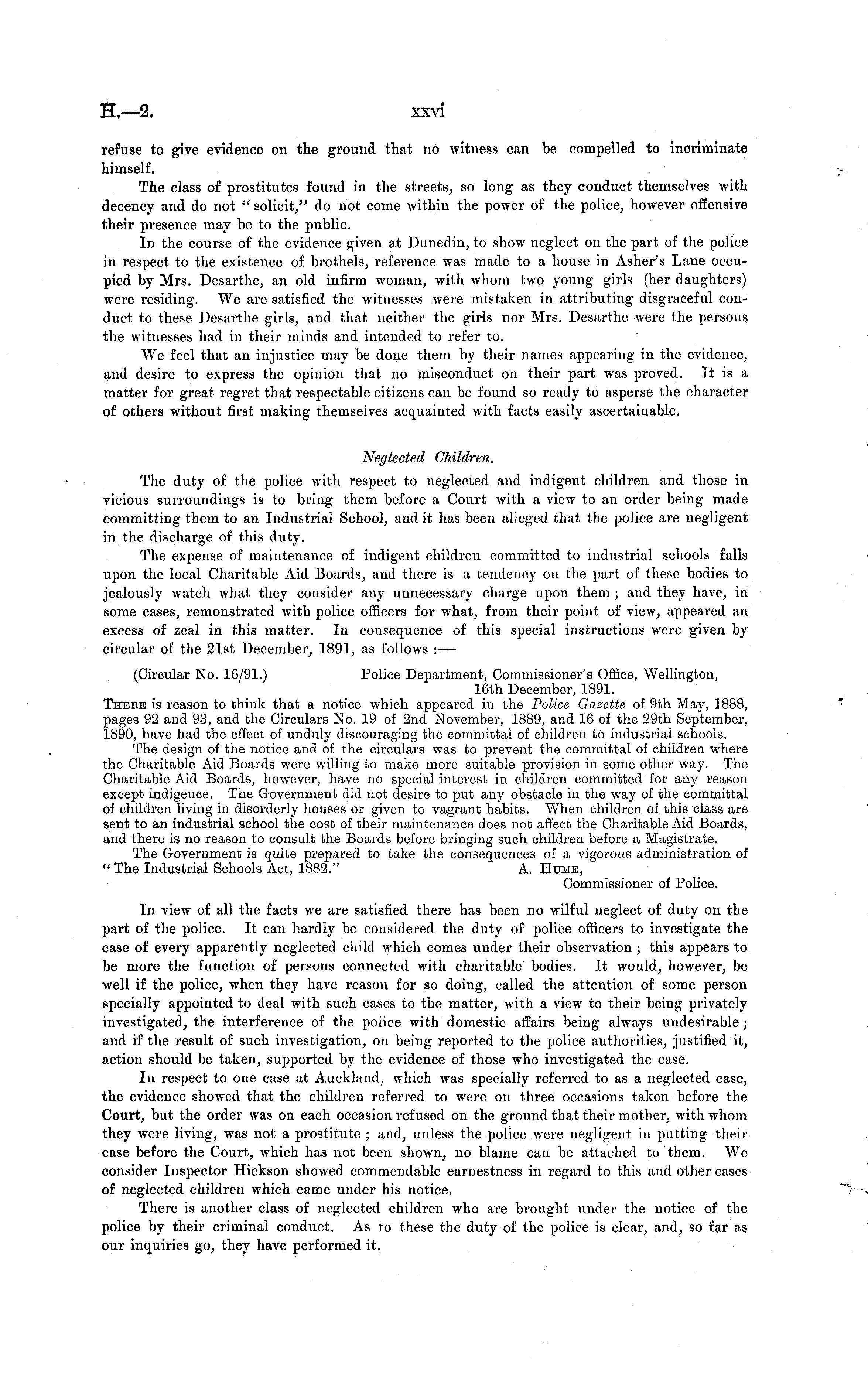 refuse to give evidence on the ground that no witness can be compelled to incriminate himself. The class of prostitutes found in the streets, so long as they conduct themselves with decency and do not " solicit," do not come within the power of the police, however offensive their presence may be to the public. In the course of the evidence given at Dunedin, to show neglect on the part of the police in respect to the existence of brothels, reference was made to a house in Asher's Lane occupied by Mrs. Desarthe, an old infirm woman, with whom two young girls (her daughters) were residing. We are satisfied the witnesses were mistaken in attributing disgraceful conduct to these Desarthe girls, and that neither the girls nor Mrs. Desarthe were the persons the witnesses had in their minds and intended to refer to. We feel that an injustice may be done them by their names appearing in the evidence, and desire to express the opinion that no misconduct on their part was proved. It is a matter for great regret that respectable citizens can be found so ready to asperse the character of others without first making themselves acquainted with facts easily ascertainable. Neglected Children. The duty of the police with respect to neglected and indigent children and those in vicious surroundings is to bring them before a Court with a view to an order being made committing them to an Industrial School, and it has been alleged that the police are negligent in the discharge of this duty. The expense of maintenance of indigent children committed to industrial schools falls upon the local Charitable Aid Boards, and there is a tendency on the part of these bodies to jealously watch what they consider any unnecessary charge upon them ; and they have, in some cases, remonstrated with police officers for what, from their point of view, appeared an excess of zeal in this matter. In consequence of this special instructions were given by circular of the 21st December, 1891, as follows ■ — (Circular No. 16/91.) Police Department, Commissioner's Office, Wellington, 16th December, 1891. There is reason to think that a notice which appeared in the Police Gazette of 9fch May, 1888, pages 92 and 93, and the Circulars No. 19 of 2nd November, 1889, and 16 of the 29fch September, 1890, have had the effect of unduly discouraging the committal of children to industrial schools. The design of the notice and of the circulars was to prevent the committal of children where the Charitable Aid Boards were willing to make more suitable provision in some other way. The Charitable Aid Boards, however, have no special interest in children committed for any reason except indigence. The Government did not desire to put any obstacle in the way of the committal of children living in disorderly houses or given to vagrant habits. When children of this class are sent to an industrial school the cost of their maintenance does not affect the Charitable Aid Boards, and there is no reason to consult the Boards before bringing such children before a Magistrate. The Government is quite prepared to take the consequences of a vigorous administration of "The Industrial Schools Act, 1882." A. Hume, Commissioner of Police. In view of all the facts we are satisfied there has been no wilful neglect of duty on the part of the police. It can hardly be considered the duty of police officers to investigate the case of every apparently neglected child which comes under their observation ; this appears to be more the function of persons connected with charitable bodies. It would, however, be well if the police, when they have reason for so doing, called the attention of some person specially appointed to deal with such cases to the matter, with a view to their being privately investigated, the interference of the police with domestic affairs being always undesirable ; and if the result of such investigation, on being reported to the police authorities, justified it, action should be taken, supported by the evidence of those who investigated the case. In respect to one case at Auckland, which was specially referred to as a neglected case, the evidence showed that the children referred to were on three occasions taken before the Court, but the order was on each occasion refused on the ground that their mother, with whom they were living, was not a prostitute ; and, unless the police were negligent in putting their case before the Court, which has not been shown, no blame can be attached to them. We consider Inspector Hickson showed commendable earnestness in regard to this and other cases of neglected children which came under his notice. There is another class of neglected children who are brought under the notice of the police by their criminal conduct. As to these the duty of the police is clear, and, so far as our inquiries go, they have performed it.