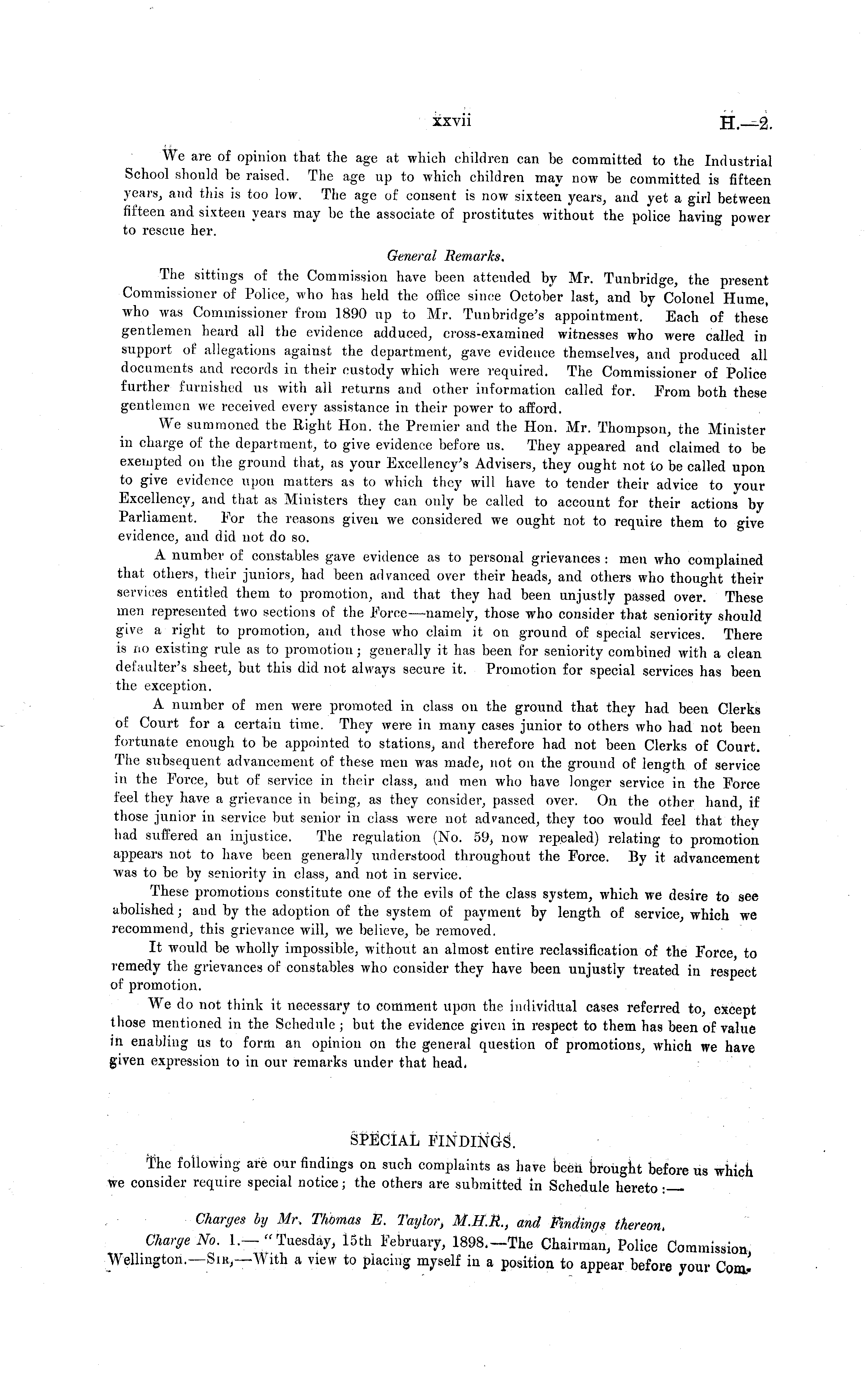 We are of opinion that, the age at which children can be committed to the Industrial School should be raised. The age up to which children may now be committed is fifteen years, and this is too low. The age of consent is now sixteen years, and yet a girl between fifteen and sixteen years may be the associate of prostitutes without the police having power to rescue her. General Remarks. The sittings of the Commission have been attended by Mr. Tunbridge, the present Commissioner of Police, who has held the office since October last, and by Colonel Hume, who was Commissioner from 1890 up to Mr. Tunbridge's appointment. Each of these gentlemen heard all the evidence adduced, cross-examined witnesses who were called in support of allegations against the department, gave evidence themselves, and produced all documents and records in their custody which were required. The Commissioner of Police further furnished us with all returns and other information called for. From both these gentlemen we received every assistance in their power to afford. We summoned the Right Hon. the Premier and the Hon. Mr. Thompson, the Minister in charge of the department, to give evidence before us. They appeared and claimed to be exempted on the ground that, as your Excellency's Advisers, they ought not to be called upon to give evidence upon matters as to which they will have to tender their advice to your Excellency, and that as Ministers they can only be called to account for their actions by Parliament. For the reasons given we considered we ought not to require them to give evidence, and did not do so. A number of constables gave evidence as to personal grievances : men who complained that others, their juniors, had been advanced over their heads, and others who thought their services entitled them to promotion, and that they had been unjustly passed over. These men represented two sections of the Foree —namely, those who consider that seniority should give a right to promotion, and those who claim it on ground of special services. There is no existing rule as to promotion ; generally it has been for seniority combined with a clean defaulter's sheet, but this did not always secure it. Promotion for special services has been the exception. A number of men were promoted in class on the ground that they had been Clerks of Court for a certain time. They were in many cases junior to others who had not been fortunate enough to be appointed to stations, and therefore had not been Clerks of Court. The subsequent advancement of these men was made, not on the ground of length of service in the Force, but of service in their class, and men who have longer service in the Force feel they have a grievance in being, as they consider, passed over. On the other hand if those junior in service but senior in class were not advanced, they too would feel that they had suffered an injustice. The regulation (No. 59, now repealed) relating to promotion appears not to have been generally understood throughout the Force. By it advancement was to be by seniority in class, and not in service. These promotions constitute one of the evils of the class system, which we desire to see abolished ; and by the adoption of the system of payment by length of service, which we recommend, this grievance will, we believe, be removed. It would be wholly impossible, without an almost entire reclassification of the Force to remedy the grievances of constables who consider they have been unjustly treated in respect of promotion. We do not think it necessary to comment upon the individual cases referred to, except those mentioned in the Schedule ; but the evidence given in respect to them has been of value in enabling us to form an opinion on the general question of promotions, which we have given expression to in our remarks under that head. SPECIAL FINDINGS. The following are our findings on such complaints as have been brought before us which we consider require special notice; the others are submitted in Schedule hereto: Charges by Mr. Thomas E. Taylor, M.H.H., and Findings thereon, Charge No. I.—"Tuesday, 15th February, 1898.—The Chairman, Police Commission Wellington.—Sir,--With a view to placing myself in a position to appear before your Com.^