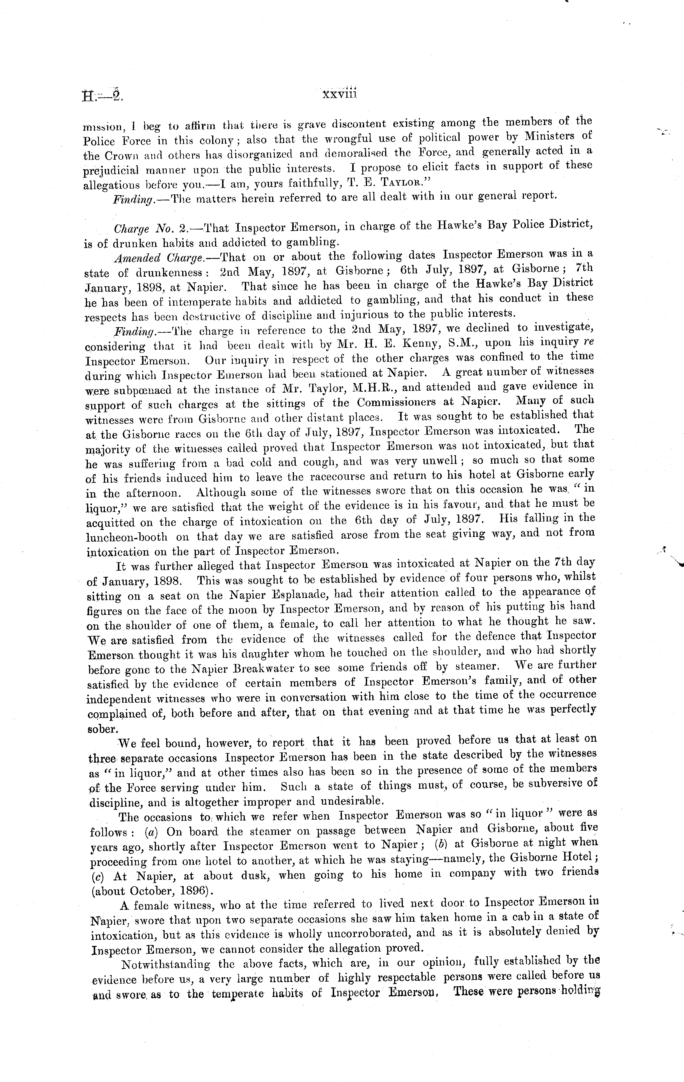 mission, I beg to affirm that there is grave discontent existing among the members of the Police Force in this colony; also that the wrongful use of political power by Ministers of the Crown and others has disorganized and demoralised the Force, and generally acted in a prejudicial manner upon the public interests. I propose to elicit facts in support of these allegations before you. —I am, yours faithfully, T. E. Taylor." Finding.—'The matters herein referred to are all dealt with in our general report. Charge No. 2.—That Inspector Emerson, in charge of the Hawke's Bay Police District, is of drunken habits and addicted to gambling. Amended Charge. —That on or about the following dates Inspector Emerson was in a state oil drunkenness : Sind May, 1897, at Gisborne; 6th July, 1897, at Gisborne; 7th January, 1898, at Napier. That since he has been in charge of the Hawke's Bay District he has been of intemperate habits and addicted to gambling, and that his conduct in these respects has been destructive of discipline and injurious to the public interests. Finding.— .The charge in reference to the 2nd May, 1897, we declined to investigate, considering' that it had \een dealt with by Mr. H. E. Kenny, S.M., upon his inquiry re Inspector Emerson. Our inquiry in respect of the other charges was confined to the time during which Inspector Emerson had been stationed at Napier. A great number of witnesses w.ere subpoenaed at the instance of Mr. Taylor, M.H.R., and attended and gave evidence in support of such charges at the sittings of the Commissioners at Napier. Many of such witnesses were from Gisborne and other distant places. It was sought to be established that at the Gisborne races on the 6th day of July, 1897, Inspector Emerson was intoxicated. The majority of the witnesses called proved that Inspector Emerson was not intoxicated, but that he was suffering from a bad cold and cough, and was very unwell ; so much so that some of his friends induced him to leave the racecourse and return to his hotel at Gisborne early in the afternoon. Although some of the witnesses swore that on this occasion he was. "in liquor," we are satisfied that the weight of the evidence is in his favour, and that he must be acquitted on the charge of intoxication on the 6th day of July, 1897. His falling in the luncheon-booth on that day we are satisfied arose from the seat giving way, and not from intoxication on the part of Inspector Emerson, It was further alleged that Inspector Emerson was intoxicated at Napier on the 7th day of January, 1898. This was sought to be established by evidence of four persons who, whilst sitting on a seat on the Napier Esplanade, had their attention called to the appearance of figures on the face of the moon by Inspector Emerson, and by reason of his putting his hand on the shoulder of one of them, a female, to call her attention to what he thought he saw. We are satisfied from the evidence of the witnesses called for the defence that Inspector Emerson thought it was his daughter whom he touched on the shoulder, and who had shortly before gone to the Napier Breakwater to see some friends off by steamer. We are further satisfied by the evidence of certain members of Inspector Emerson's family, and of other independent witnesses who were in conversation with him close to the time of the occurrence complained of, both before and after, that on that evening and at that time he was perfectly sober. We feel bound, however, to report that it has been proved before us that at least on three separate occasions Inspector Emerson has been in the state described by the witnesses as "in liquor/ and at other times also has been so in the presence of some of the members of the Force serving under him. Such a state of things must, of course, be subversive of discipline, and is altogether improper and undesirable. The occasions to, which we refer when Inspector Emerson was so "in liquor " were as follows : (a) On board the steamer on passage between Napier and Gisborne, about five years ago, shortly after Inspector Emerson went to Napier ; {b) at Gisborne at night when proceeding from one hotel to another, at which he was staying—namely, the Gisborne Hotel ; (c) At Napier, at about dusk, when going to his home in company with two friends (about October, 1896). A female witness, who at the time referred to lived next door to Inspector Emerson in Napier, swore that upon two separate occasions she saw him taken home in a cabin a state of intoxication, but as this evidence is wholly uncorroborated, and as it is absolutely denied by Inspector Emerson, we cannot consider the allegation proved. Notwithstanding the above facts, which are, in our opinion, fully established by the evidence before us, a very large number of highly respectable persons were called before us and swore, as to the temperate habits of Inspector Emerson, These were persons holding
