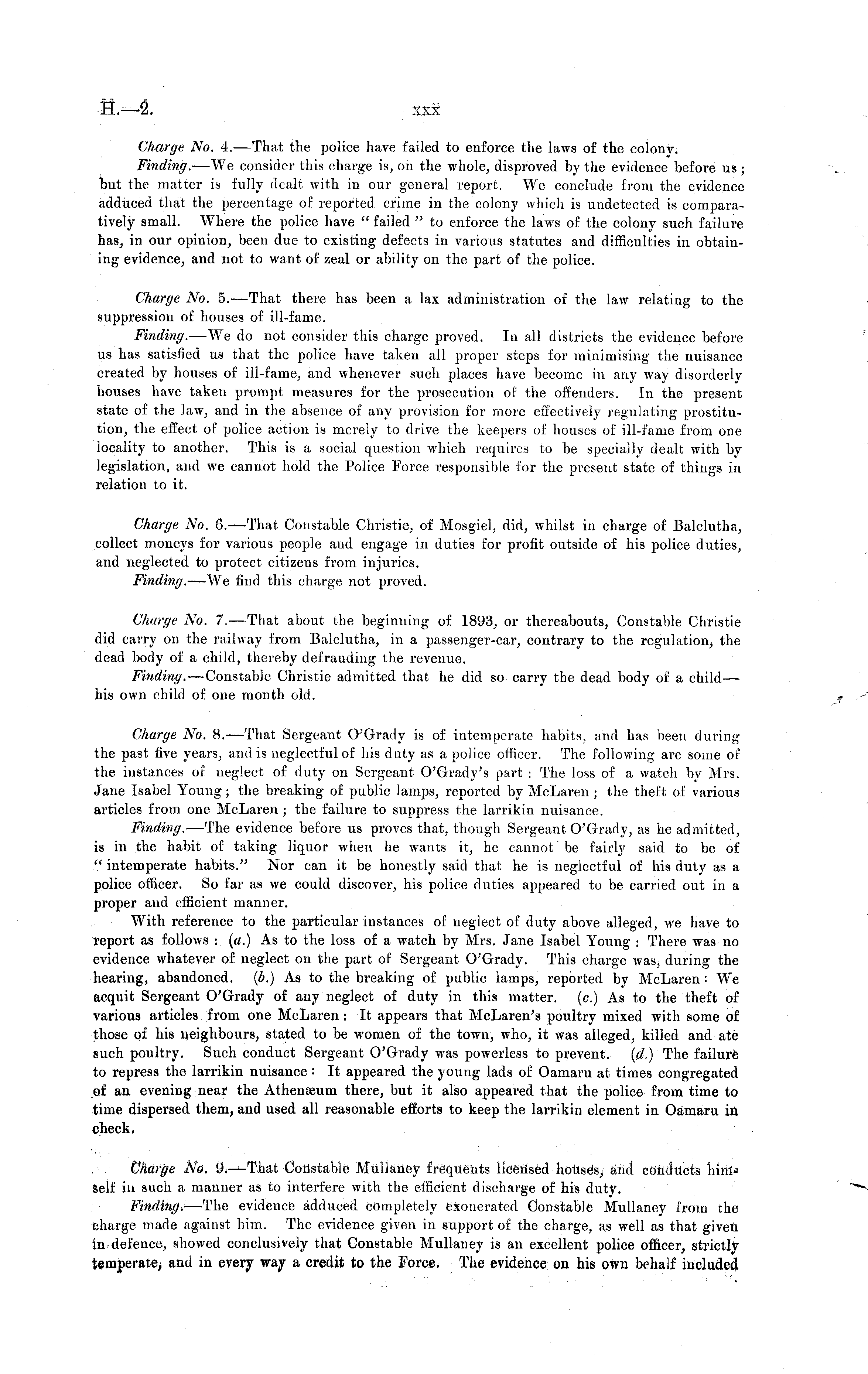 Charge No. 4. —That the police have failed to enforce the laws of the colony. Finding. —We consider this charge is, on the whole, disproved by the evidence before us ; but the matter is fully dealt with in our general report. We conclude from the evidence adduced that the percentage of reported crime in the colony which is undetected is comparatively small. Where the police have "failed" to enforce the laws of the colony such failure has, in our opinion, been due to existing defects in various statutes and difficulties in obtaining evidence, and not to want of zeal or ability on the part of the police. Charge No. 5. —That there has been a lax administration of the law relating to the suppression of houses of ill-fame. Finding. —We do not consider this charge proved. In all districts the evidence before us has satisfied us that the police have taken all proper steps for minimising the nuisance created by houses of ill-fame, and whenever such places have become in any way disorderly houses have taken prompt measures for the prosecution of the offenders. In the present state of the law, and in the absence of any provision for more effectively regulating prostitution, the effect of police action is merely to drive the keepers of houses of ill-fame from one locality to another. This is a social question which requires to be specially dealt with by legislation, and we cannot hold the Police Force responsible for the present state of things in relation to it. Charge No. 6.—That Constable Christie, of Mosgiel, did, whilst in charge of Balclutha, collect moneys for various people and engage in duties for profit outside of his police duties, and neglected to protect citizens from injuries. Finding. —We find this charge not proved. Charge No. 7. —That about the beginning of 1893, or thereabouts, Constable Christie did carry on the railway from Balclutha, in a passenger-car, contrary to the regulation, the dead body of a child, thereby defrauding the revenue. Finding. —Constable Christie admitted that he did so carry the dead body of a child— his own child of one month old. Charge No. 8.- —That Sergeant O'Grady is of intemperate habits, and has been during the past five years, and is neglectful of his duty as a police officer. The following are some of the instances of neglect of duty on Sergeant O'Grady's part : The loss of a watch by Mrs. Jane Isabel Young; the breaking of public lamps, reported by McLaren ; the theft of various articles from one McLaren ; the failure to suppress the larrikin nuisance. Finding. —The evidence before us proves that, though Sergeant O'Grady, as he admitted, is in the habit of taking liquor when he wants it, he cannot be fairly said to be of " intemperate habits." Nor can it be honestly said that he is neglectful of his duty as a police officer. So far as we could discover, his police duties appeared to be carried out in a proper and efficient manner. With reference to the particular instances of neglect of duty above alleged, we have to report as follows : (a.) As to the loss of a watch by Mrs. Jane Isabel Young : There was no evidence whatever of neglect on the part of Sergeant O'Grady. This charge was, during the hearing, abandoned. (6.) As to the breaking of public lamps, reported by McLaren :We acquit Sergeant O'Grady of any neglect of duty in this matter, (c.) As to the theft of various articles from one McLaren: It appears that McLaren's poultry mixed with some of those of his neighbours, stated to be women of the town, who, it was alleged, killed and ate such poultry. Such conduct Sergeant O'Grady was powerless to prevent. (d.) The failure to repress the larrikin nuisance: It appeared the young lads of Oamaru at times congregated of an evening near the Athenaeum there, but it also appeared that the police from time to time dispersed them, and used all reasonable efforts to keep the larrikin element in Oamaru in check. Charge Nβ. Constable Mullaney frequents licensed house's, and conducts Self in such a manner as to interfere with the efficient discharge of his duty. Finding.— r £he evidence adduced completely exonerated Constable Mullaney from the , charge made against him. The evidence given in support of the charge, as well as that given in defence, showed conclusively that Constable Mullaney is an excellent police officer, strictly and in every way a credit to the Force. The evidence on his own behalf included