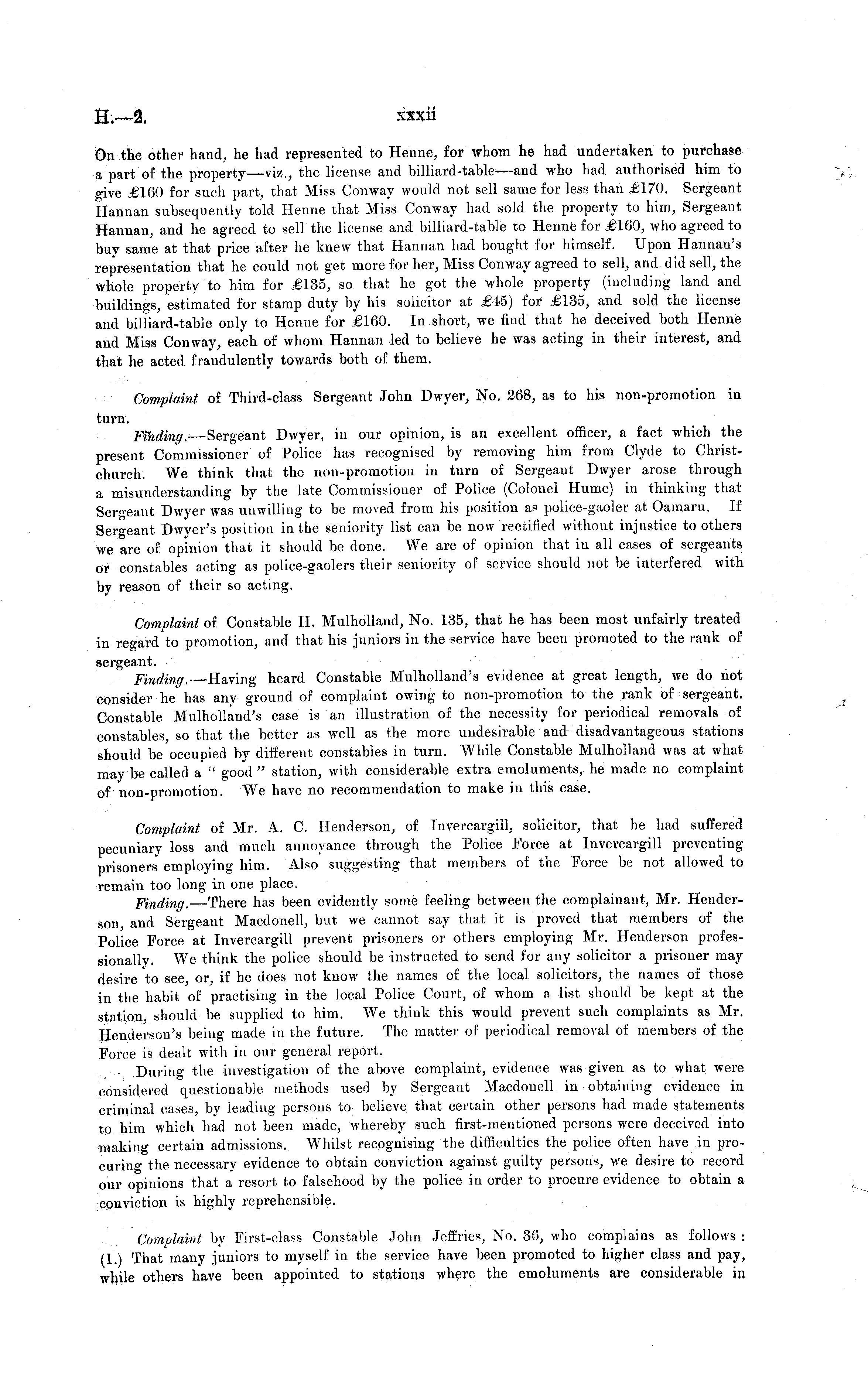 On the other hand, he had represented to Henne, for whom he had undertaken to purchase a part of the property —viz., the license and billiard-table —and who had authorised him to give £160 for such part, that Miss Conway would not sell same for less than £170. Sergeant Hannan subsequently told Henne that Miss Conway had sold the property to him, Sergeant Hannan, and he agreed to sell the license and billiard-table to Henne for £160, who agreed to buy same at that price after he knew that Hannan had bought for himself. Upon Hannan's representation that he could not get more for her, Miss Conway agreed to sell, and did sell, the whole property to him for £135, so that he got the whole property (including land and buildings, estimated for stamp duty by his solicitor at £45) for £135, and sold the license and billiard-table only to Henne for £160. In short, we find that he deceived both Henne and Miss Conway, each of whom Hannan led to believe he was acting in their interest, and that he acted fraudulently towards both of them. Complaint of Third-class Sergeant John Dwyer, No. 268, as to his non-promotion in turn. Fihdinff. —Sergeant Dwyer, in our opinion, is an excellent officer, a fact which the present Commissioner of Police has recognised by removing him from Clyde to Christchurch. We think that the non-promotion in turn of Sergeant Dwyer arose through a misunderstanding by the late Commissioner of Police (Colonel Hume) in thinking that Sergeant Dwyer was unwilling to be moved from his position as police-gaoler at Oamaru. If Sergeant Dwyer's position in the seniority list can be now rectified without injustice to others we are of opinion that it should be done. We are of opinion that in all cases of sergeants or constables acting as police-gaolers their seniority of service should not be interfered with by reason of their so acting. Complaint of Constable H. Mulholland, No. 135, that he has been most unfairly treated in regard to promotion, and that his juniors in the service have been promoted to the rank of sergeant. Finding. Having heard Constable Mulholland's evidence at great length, we do not consider he has any ground of complaint owing to non-promotion to the rank of sergeant. Constable Mulholland's case is an illustration of the necessity for periodical removals of constables, so that the better as well as the more undesirable and disadvantageous stations should be occupied by different constables in turn. While Constable Mulholland was at what may be called a " good " station, with considerable extra emoluments, he made no complaint of non-promotion. We have no recommendation to make in this case. Complaint of Mr. A. C. Henderson, of Invercargill, solicitor, that he had suffered pecuniary loss and much annoyance through the Police Force at Invercargill preventing prisoners employing him. Also suggesting that members of the Force be not allowed to remain too long in one place. Finding. —There has been evidently some feeling between the complainant, Mr. Henderson, and Sergeant Macdonell, but we cannot say that it is proved that members of the Police Force at Invercargill prevent prisoners or others employing Mr. Henderson professionally. We think the police should be instructed to send for any solicitor a prisoner may desire "to see, or, if he does not know the names of the local solicitors, the names of those in the habit of practising in the local Police Court, of whom a list should be kept at the station, should be supplied to him. We think this would prevent such complaints as Mr. Henderson's being made in the future. The matter of periodical removal of members of the Force is dealt with in our general report. During the investigation of the above complaint, evidence was given as to what were considered questionable methods used by Sergeant Macdonell in obtaining evidence in criminal cases, by leading persons to believe that certain other persons had made statements to him which had not been made, whereby such first-mentioned persons were deceived into making certain admissions. Whilst recognising the difficulties the police often have in procuring the necessary evidence to obtain conviction against guilty persons, we desire to record our opinions that a resort to falsehood by the police in order to procure evidence to obtain a conviction is highly reprehensible. Complaint by First-class Constable John Jeffries, No. 36, who complains as follows : (1.) That many juniors to myself in the service have been promoted to higher class and pay, while others have been appointed to stations where the emoluments are considerable in