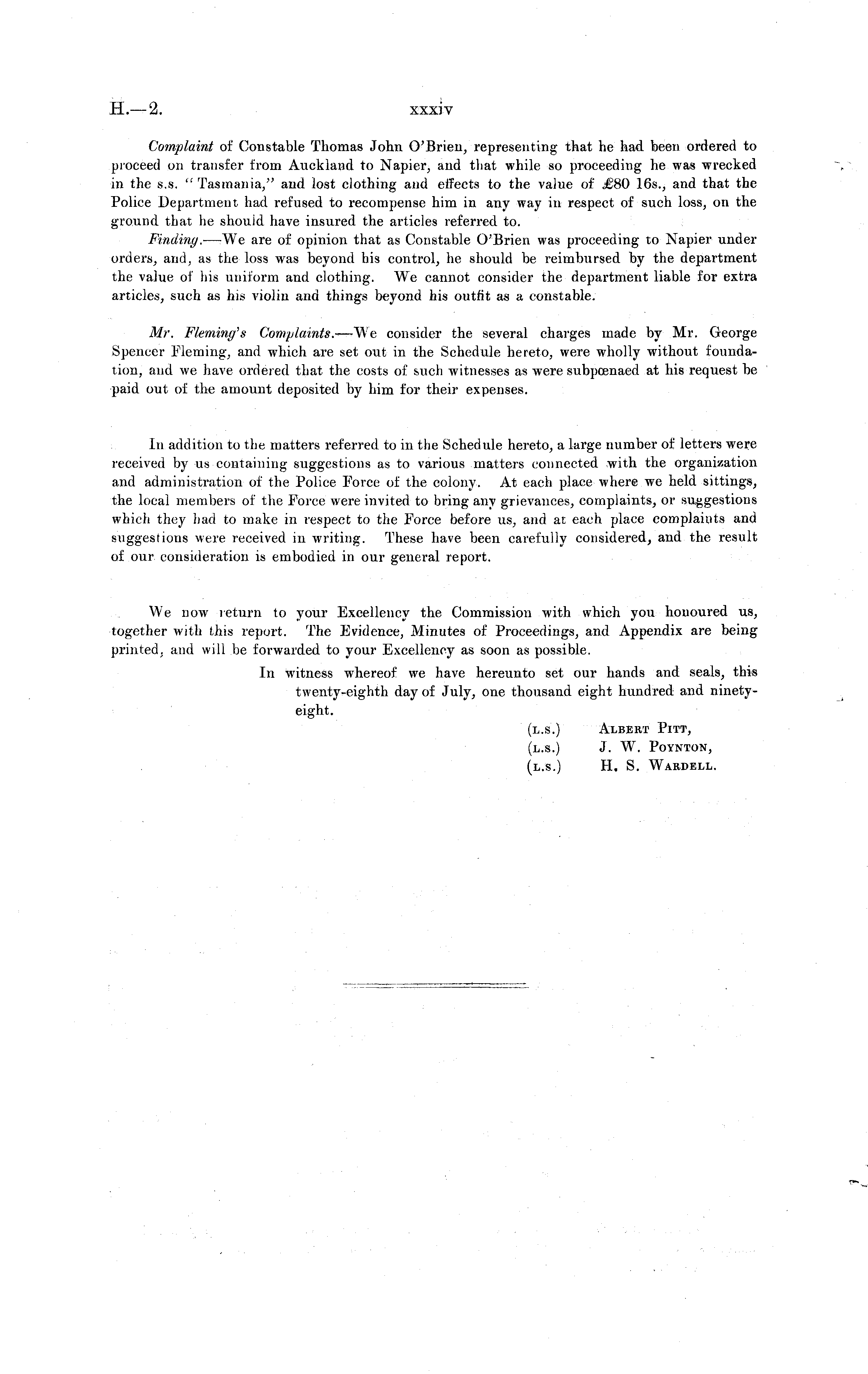 Complaint of Constable Thomas John O'Brien, representing that he had been ordered to proceed on transfer from Auckland to Napier, and that while so proceeding he was wrecked in the s.s. " Tasmania," and lost clothing and effects to the value of .£BO 165., and that the Police Department had refused to recompense him in any way in respect of such loss, on the ground that he shouid have insured the articles referred to. Finding.- —We are of opinion that as Constable O'Brien was proceeding to Napier under orders, and, as the loss was beyond his control, he should be reimbursed by the department the value of his uniform and clothing. We cannot consider the department liable for extra articles, such as his violin and things beyond his outfit as a constable. Mr. Fleming's Complaints. —We consider the several charges made by Mr. George Spencer Fleming, and which are set out in the Schedule hereto, were wholly without foundation, and we have ordered that the costs of such witnesses as were subpoenaed at his request be paid out of the amount deposited by him for their expenses. i. In addition to the matters referred to in the Schedule hereto, a large number of letters were received by us containing suggestions as to various matters connected with the organization and administration of the Police Force of the colony. At each place where we held sittings, the local members of the Force were invited to bring any grievances, complaints, or suggestions which they had to make in respect to the Force before us, and at each place complaints and suggestions were received in writing. These have been carefully considered, and the result of our consideration is embodied in our general report. We now return to your Excellency the Commission with which you honoured us, together with this report. The Evidence, Minutes of Proceedings, and Appendix are being printed, and will be forwarded to your Excellency as soon as possible. In witness whereof we have hereunto set our hands and seals, this twenty-eighth day of July, one thousand eight hundred and ninetyeight. (1.5.) Albert Pitt, (1.5.) J. W. Poynton, (1.5.) H. S. Wardell.