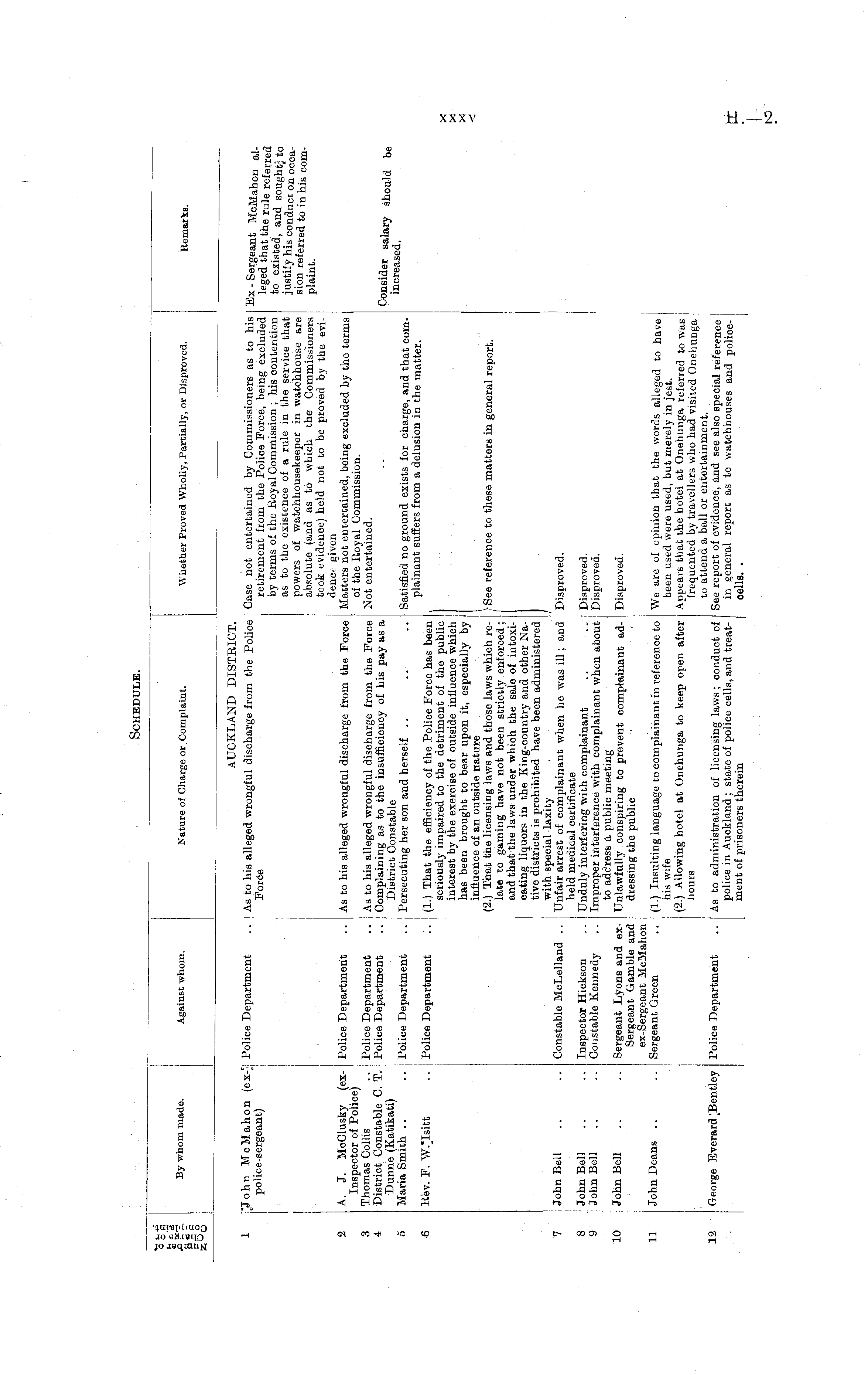 Cos aliT By whom made. Against whom. Nature of Charge or Complaint. Whether Proved Wholly, Partially, or Disproved. Remarks. AUCKLAND DISTEICT. John McMahon (ex-; police-sergeant) Police Department As to his alleged wrongful discharge from the Police Force Case not entertained by Commissioners as to his retirement from the Police Force, being excluded by terms of the Royal Commission ; his contention as to the existence of a rule in the service that powers of watchhousekeeper in watchhouse are absolute (and as to which the Commissioners took evidence) held not to be proved by the evidence given Matters not entertained, being excluded by the terms of the Royal Commission. Not entertained. Ex-Sergeant McMahon alleged that the rule referred to existed, and sought; to justify his conduct on occasion referred to in his complaint. A. J. McClusky (exInspector of Police) Thomas Collis District Constable C. T.Dunne (Katikati) Maria Smith Police Department As to his alleged wrongful discharge from the Force 2 3 4 Police Department Police Department As to his alleged wrongful discharge from the Force Complaining as to the insufficiency of his pay as a District Constable Persecuting her son and herself .. .. Consider salary should be increased. 5 Police Department Satisfied no ground exists for charge, and that complainant suffers from a delusion in the matter. 6 Rev. F. W.'Isitt Police Department (1.) That the efficiency of the Police Force has been seriously impaired to the detriment of the public interest by the exercise of outside influence which has been brought to bear upon it, especially by influence of an outside nature (2.) That the licensing laws and those laws which relate to gaming have not been strictly enforced ; and that the laws under which the sale of intoxicating liquors in the King-country and other Native districts is prohibited have been administered with special laxity Unfair arrest of complainant when be was ill; and held medical certificate Unduly interfering with complainant Improper interference with complainant when about to address a public meeting Unlawfully conspiring to prevent complainant addressing the public John Bell Constable McLelland .. /■See reference to these matters in general report. 7 Disproved. 8 9 John Bell John Bell Inspector Hickson Constable Kennedy Disproved. Disproved. 10 John Bell Sergeant Lyons and exSergeant Gamble and ex-Sergeant McMahon Sergeant Green Disproved. 11 John Deans (1.) Insulting language to complainant in reference to his wife (2.) Allowing hotel at Onehunga to keep open after hours We are of opinion that the words alleged to have been used were used, but merely in jest. Apueais that the hotel at Onehunga referred to was frequented by travellers who had visited Onehunga to attend a ball or entertainment. See report of evidence, and see also special reference in general report as to watchhouses and policecells. . George Everard [Bentley Police Department 12 As to administration of licensing laws; conduct of police in Auckland ; state of police cells, and treatment of prisoners therein