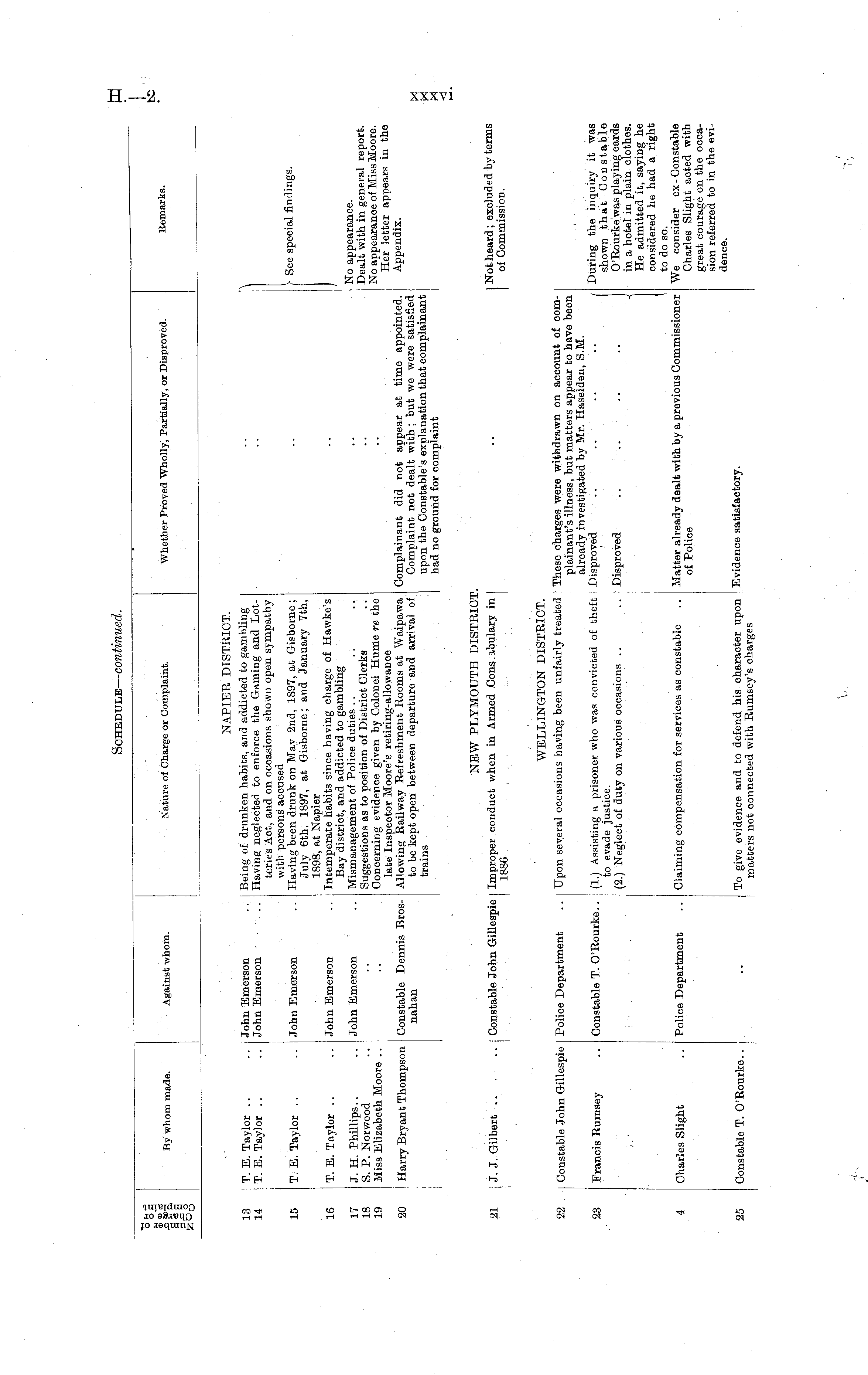 cd cd re a cs a By whom made. Against whom. Nature of Charge or Complaint. Whether Proved Wholly, Partially, or Disproved. Remarks. NAPIER DISTRICT. 13 14 15 16 17 18 19 20 T. E. Taylor .. .. John Emerson .. Being of drunken habits, and addicted to gambling T. E. Taylor .. .. John Emerson .. Having neglected to enforce the Gaming and Lotteries Act, and on occasions shown open sympathy with persons accused T. E. Taylor .. .. John Emerson .. Having been drunk on May 2nd, 1897, at Gisborne ; July 6th, 1897, at Gisborne; and January 7th, 1898, at Napier T. E. Taylor .. .. John Emerson .. Intemperate habits since having charge of Hawke's Bay district, and addicted to gambling J.H.Phillips.. .. John Emerson .. Mismanagement of Police duties .. S. P. Norwood .. -. Suggestions as to position of District Clerks .. I Miss Elizabeth Moore .. .. Concerning evidence given by Colonel Hume re the late Inspector Moore's retiring-allowance Harry Bryant Thompson Constable Dennis Bros- Allowing Railway Refreshment Rooms at Waipawa Complainant did not appear at time appointed, nahan to be kept open between departure and arrival of Complaint not dealt with; but we were satisfied trains upon the Constable's explanation that complainant I had no ground for complaint > See special findings. No appearance. Dealt with in general report. No appearance of Miss Moore. Her letter appears in the Appendix. NEW PLYMOUTH DISTRICT. 21 J. J. Gilbert 1 Constable John Gillespie j Improper conduct when in Armed Cons. ibulary in I I 1886 i | Not heard; excluded by terms of Commission. WELLINGTON DISTRICT. 22 23 4 Constable John Gillespie Police Department .. Upon several occasions having been unfairly treated j These charges were withdrawn on account of complainant's illness, but matters appear to have been already investigated by Mr. Haselden, S.M. Francis Rumsey .. Constable T. O'Rourke.. (1.) Assisting a prisoner who was convicted of theft ; Disproved .. .. .. .. / to evade justice. (2.) Neglect of duty on various occasions .. .. Disproved Charles Slieht Police Department .. Claiming compensation for services as constable .. Matter already dealt with by a previous Commissioner & " of Police ' During the inquiry it was shown that Constable O'Rourke was playing cards in a hotel in plain clothes. He admitted it, saying he considered he had a right I to do so. We consider ex-Constable Charles Slight acted with great courage on the occasion referred to in the evidence. 25 Constable T. O'Rourke.. .. I To give evidence and to defend his character upon Evidence satisfactory. matters not connected with Rumsey's charges