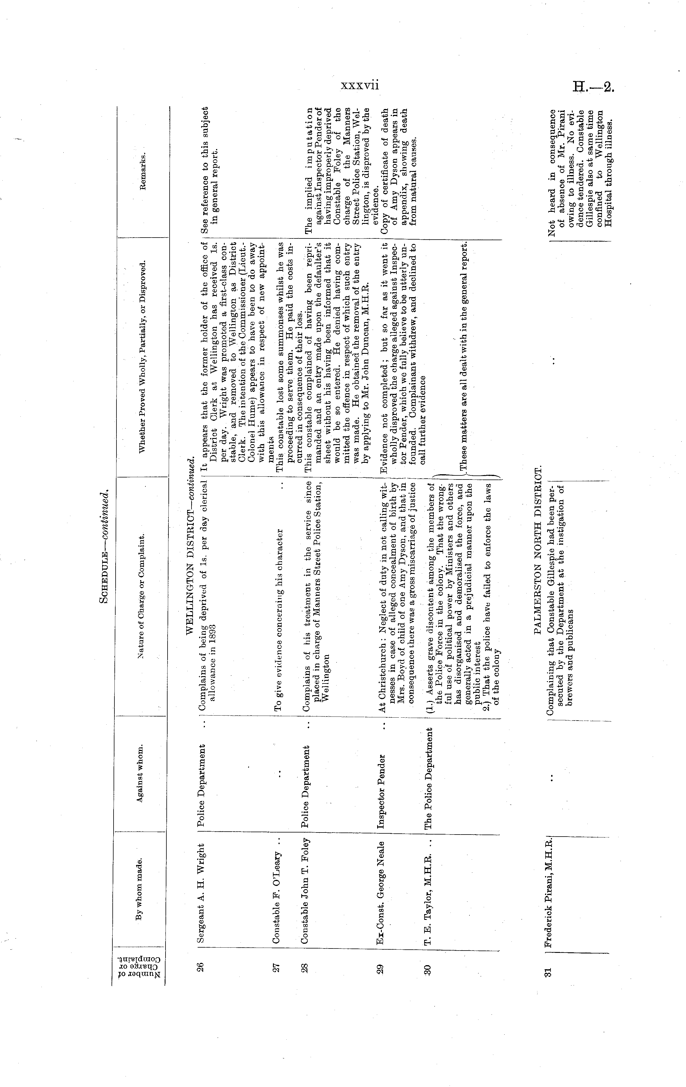bA n By whom made. Against whom. Nature of Charge or Complaint. Whether Proved Wholly, Partially, or Disproved. Remarks. WELLINGTON DISTRICT— contv. lued. 26 Sergeant A. H. Wright Police Department .. ] Complains of being deprived of Is. per day clerical allowance in 1893 It appears that the former holder of the office of District Clerk at Wellington has received Is. per day. Wright was promoted a first-class constable, and removed to Wellington as District Clerk. The intention of the Commissioner (Lieut.Colonel Hume) appears to have been to do away with this allowance in respect of new appointments This constable lost some summonses whilst he was proceeding to serve them. He paid the costs incurred in consequence of their loss. This constable complained of having been reprimanded and an entry made upon the defaulter's sheet without his having been informed that it would be so entered. He denied having committed the offence in respect of which such entry was made. He obtained the removal of the entry by applying to Mr. John Duncan, M.H.R. See reference to this subject in general report. Constable F. O'Leary .. To give evidence concerning his character The implied imputation against Inspector Pender of having improperly deprived Constable Foley of the charge of the Manners Street Police Station, Wellington, is disproved by the evidence. Copy of certificate of death of Amy Dyson appears in appendix, showing death from natural causes. 27 28 Constable John T. Foley Police Department .. Complains of his treatment in the service since placed in charge of Manners Street Police Station, Wellington Ex-Const. George Neale 29 Inspector Pender .. J At Christchurch : Neglect of duty in not calling wit- ! nesses in case of alleged concealment of birth by i Mrs. Boyd of child of one Amy Dyson, and that in 1 consequence there was a gross miscarriage of justice [ Evidence not completed ; but so far as it went it wholly disproved the charge alleged against Inspector Pender, which we fully believe to be utterly unfounded. Complainant withdrew, and declined to call further evidence 30 T. E. Taylor, M.H.R. .. The Police Department i (1.) Asserts grave discontent among the members of the Police Force in the colony. That the wrongful use of political power by Ministers and others has disorganised and demoralised the force, and generally acted in a prejudicial manner upon the public interest | 2.) That the police have failed to enforce the laws [ of the colony LThese matters are all dealt with in the general report. Frederick Pirani, M.H.R. PALMERSTON NORTH DISTRK !T. 31 I Complaining that Constable Gillespie had been persecuted by the Department at the instigation of ; brewers and publicans 1 Not heard in consequence of absence of Mr. Pirani owing to illness. No evidence tendered. Constable Gillespie also at same time confined to Wellington Hospital through illness.