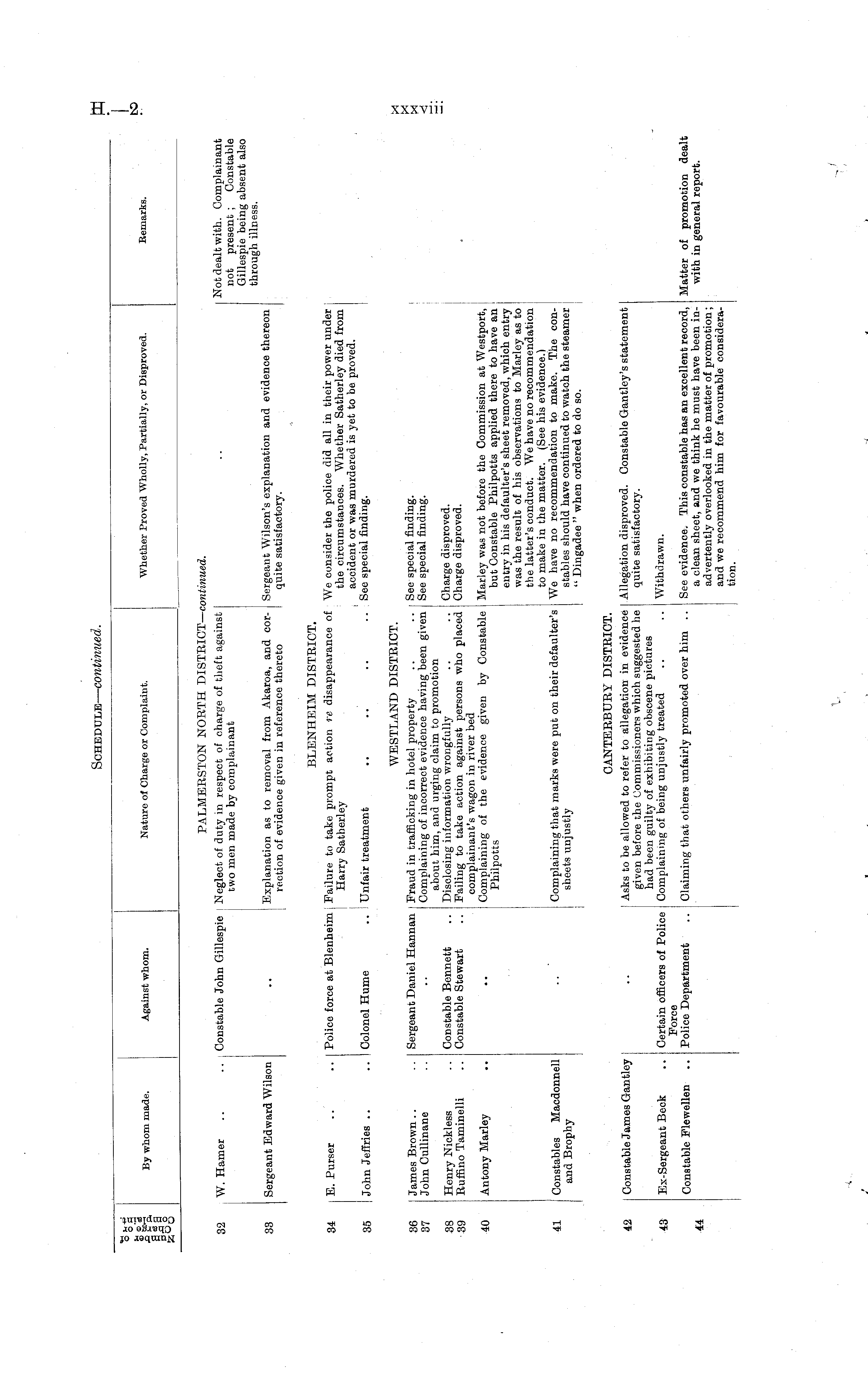 ■2 ft By whom made. Against whom. Nature of Charge or Complaint. Whether Proved Wholly, Partially, or Disproved. Remarks. PALMERSTON NORTH DISTRICT— continued. 32 33 W. Hamer .. .. I Constable John Gillespie \ Neglect of duty in respect of charge of theft against .. Not dealt with. Complainant two men made by complainant not present ; Constable Gillespie being absent also through illness. Sergeant Edward Wilson .. Explanation as to removal from Akaroa, and cor- Sergeant Wilson's explanation and evidence thereon rection of evidence given in reference thereto quite satisfactory. BLENHEIM DISTRICT. 34 35 E. Purser .. .. Police force at Blenheim I Failure to take prompt action re disappearance of We consider the police did all in their power under Harry Satherley the circumstances. Whether Satherley died from i accident or was murdered is yet to be proved. John Jeffries .. .. Colonel Hume .. i Unfair treatment .. .. .. ... See special finding. WESTLAND DISTRICT. 36 37 38 39 40 41 James Brown .. .. Sergeant Daniel Hannan Fraud in trafficking in hotel property .. .. See special finding. John Cullinane .. .. Complaining of incorrect evidence having been given See special finding. about him, and urging claim to promotion Henry Nickless .. Constable Bennett .. Disclosing information wrongfully .. .. Charge disproved. Ruffino Taminelli .. Constable Stewart .. Failing to take action against persons who placed Charge disproved. complainant's wagon in river bed Antony Marley .. .. Complaining of the evidence given by Constable Marl ey was not before the Commission at Westport, Philpotts but Constable Philpotts applied there to have an entry in his defaulter's sheet removed, which entry was the result of his observations to Marley as to the latter's conduct. We have no recommendation to make in the matter. (See his evidence.) Constables Macdonnell .. ' Complaining that marks were put on their defaulter's We have no recommendation to make. The conand Brophy sheets unjustly stables should have continued to watch the steamer " Dingadee " when ordered to do so. CANTERBURY DISTRICT. 42 43 44 Constable James Gantley .. Asks to be allowed to refer to allegation in evidence Allegation disproved. Constable Gantley's statement given before the Commissioners which suggested he quite satisfactory, had been guilty of exhibiting obscene pictures Ex-Sergeant Beck .. Certain officers of Police Complaining of being unjustly treated .. .. Withdrawn. Force Constable Flewellen .. Police Department .. Claiming that others unfairly promoted over him .. See evidence. This constable has an excellent record, Matter of promotion dealt a clean sheet, and we think he must have been in- with in general report, advertently overlooked in the matter of promotion; and we recommend him for favourable consideration.