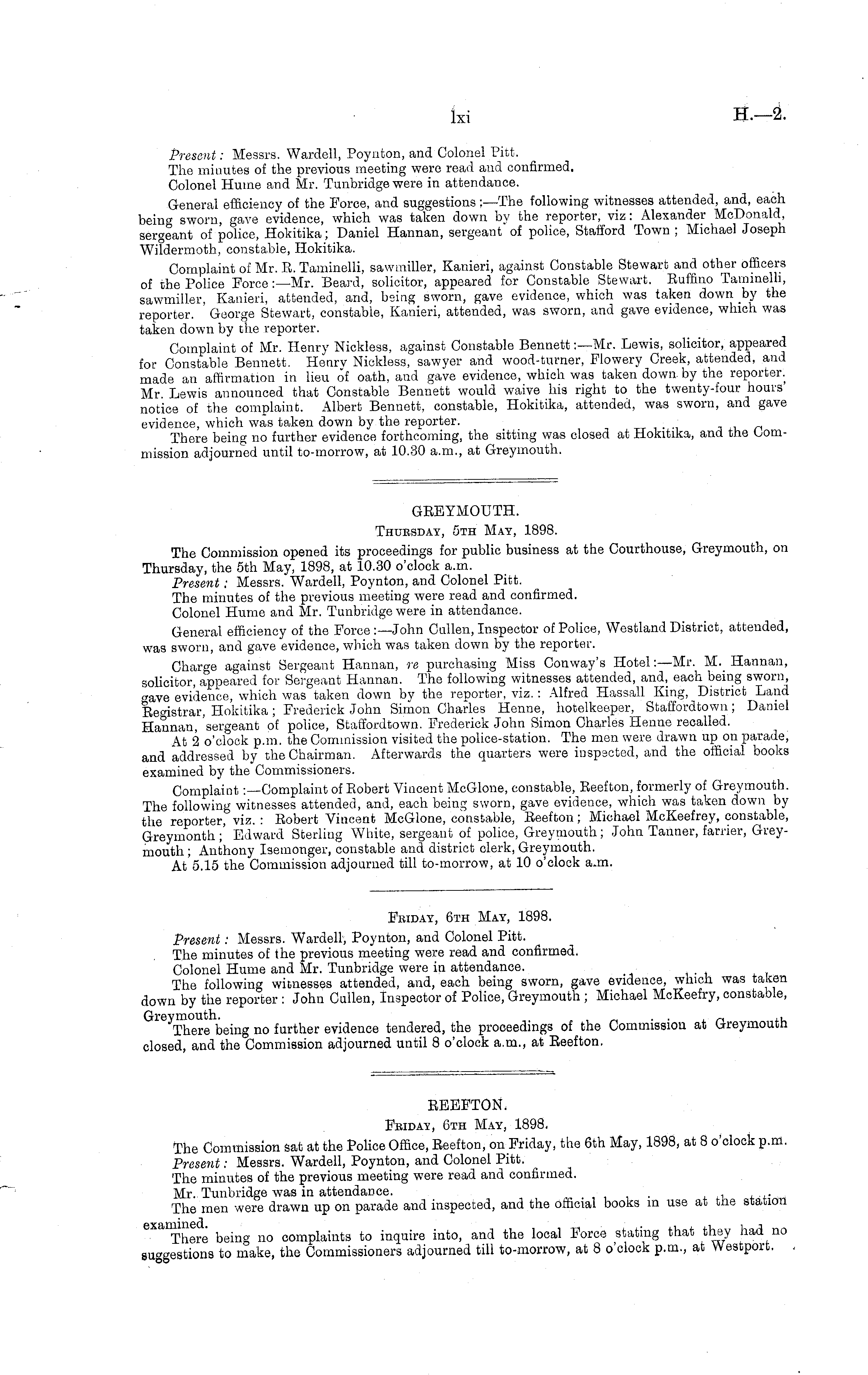 Fbiday, 6th May, 1898. Present: Messrs. Wardell, Poynton, and Colonel Pitt. The minutes of the previous meeting were read and confirmed. Colonel Hume and Mr. Tunbridge were in attendance. The following witnesses attended, and, each being sworn, gave evidence, which was taken down by the reporter : John Cullen, Inspector of Police, Greymouth ; Michael McKeefry, constable, es There being no further evidence tendered, the proceedings of the Commission at Greymouth closed, and the Commission adjourned until 8 o'clock a.m., at Eeefton.
