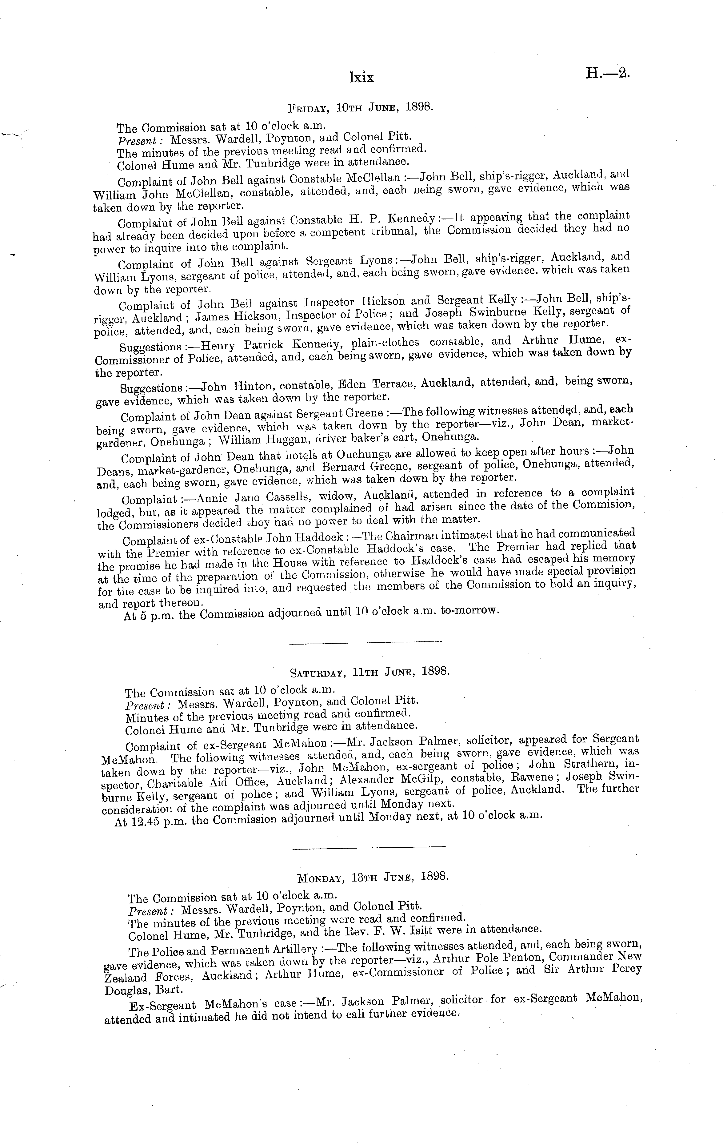 Monday, 13th June, 1898. The Commission sat at 10 o'clock a.m. Present: Messrs. Wardell, Poynton, and Colonel Pitt. The minutes of the previous meeting were read and confirmed. Colonel Hume, Mr. Tunbridge, and the Eev. F. W. Isitt were m attendance. The Police and Permanent Artillery :-The following witnesses attended, and, each being sworn, gave evince which was taken down oy the reporter-viz., Arthur Pole Oornmander New Zealand Forces, Auckland; Arthur Hume, ex-Commissioner of Police, and Sn Arthur Peicy US Bx S Sergeant McMahon's case :-Mr. Jackson Palmer, solicitor for ex-Sergeant McMahon, attended and intimated he did not intend to call further evidence.
