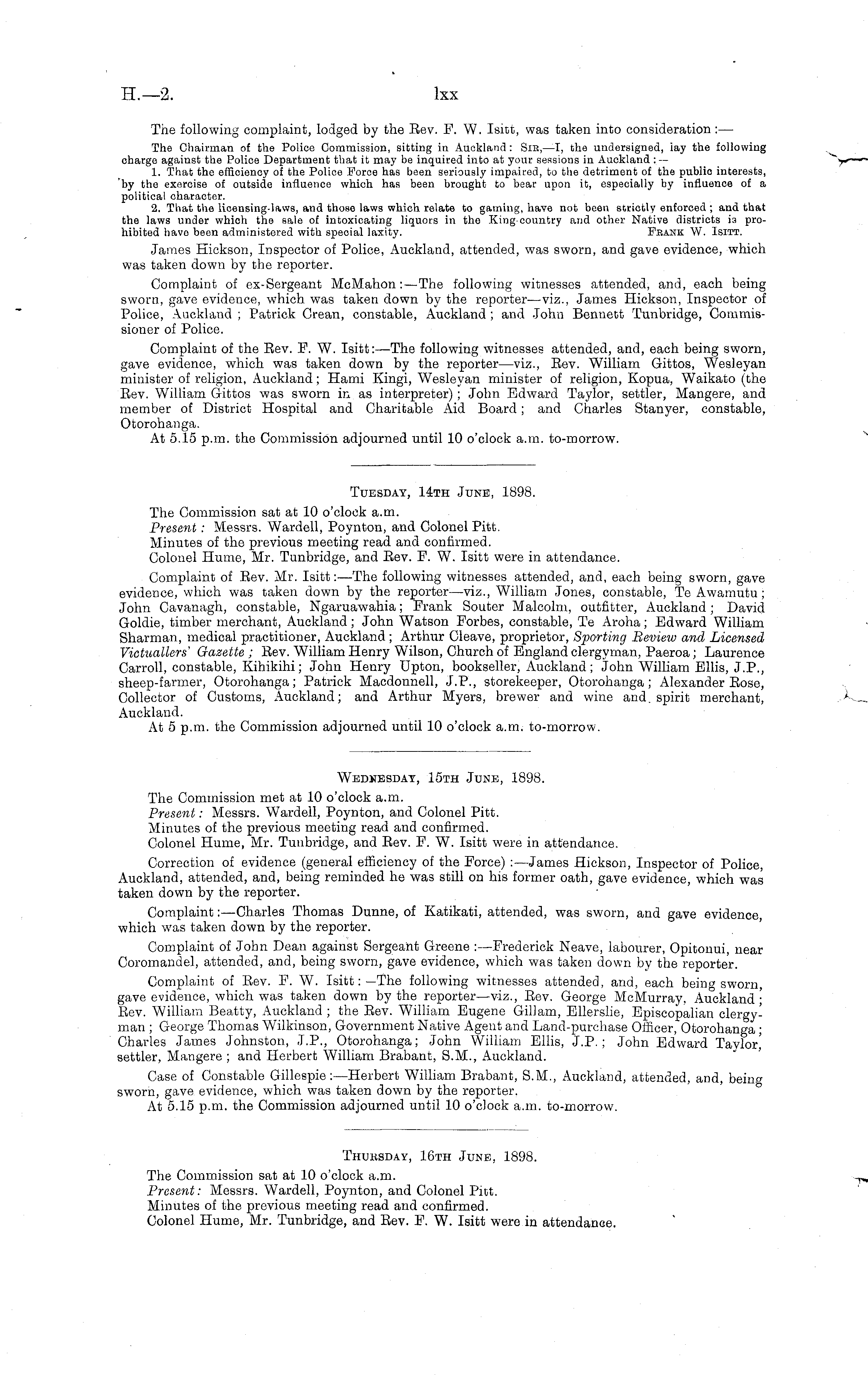 Tuesday, 14th June, 1898. The Commission sat at 10 o'clock a.m. Present: Messrs. Wardell, Poynton, and Colonel Pitt. Minutes of the previous meeting read and confirmed. Colonel Hume, Mr. Tunbridge, and Eev. F. W. Isitt were in attendance. Complaint of Eev. Mr. Isitt: —The following witnesses attended, and, each being sworn, gave evidence, which was taken down by the reporter—viz., William Jones, constable, Te Awamutu ; John Cavanagh, constable, Ngaruawahia; Frank Souter Malcolm, outfitter, Auckland; David Goldie, timber merchant, Auckland; John Watson Forbes, constable, Te Aroha; Edward William Sharman, medical practitioner, Auckland; Arthur Cleave, proprietor, Sporting Review and Licensed Victuallers' Gazette ; Eev. William Henry Wilson, Church of England clergyman, Paeroa; Laurence Carroll, constable, Kihikihi; John Henry Upton, bookseller, Auckland; John William Ellis, J. P., sheep-farmer, Otorohanga; Patrick Macdonnell, J. P., storekeeper, Otorohanga; Alexander Eose, Collector of Customs, Auckland; and Arthur Myers, brewer and wine and spirit merchant, Auckland. At 5 p.m. the Commission adjourned until 10 o'clock a.m. to-morrow.