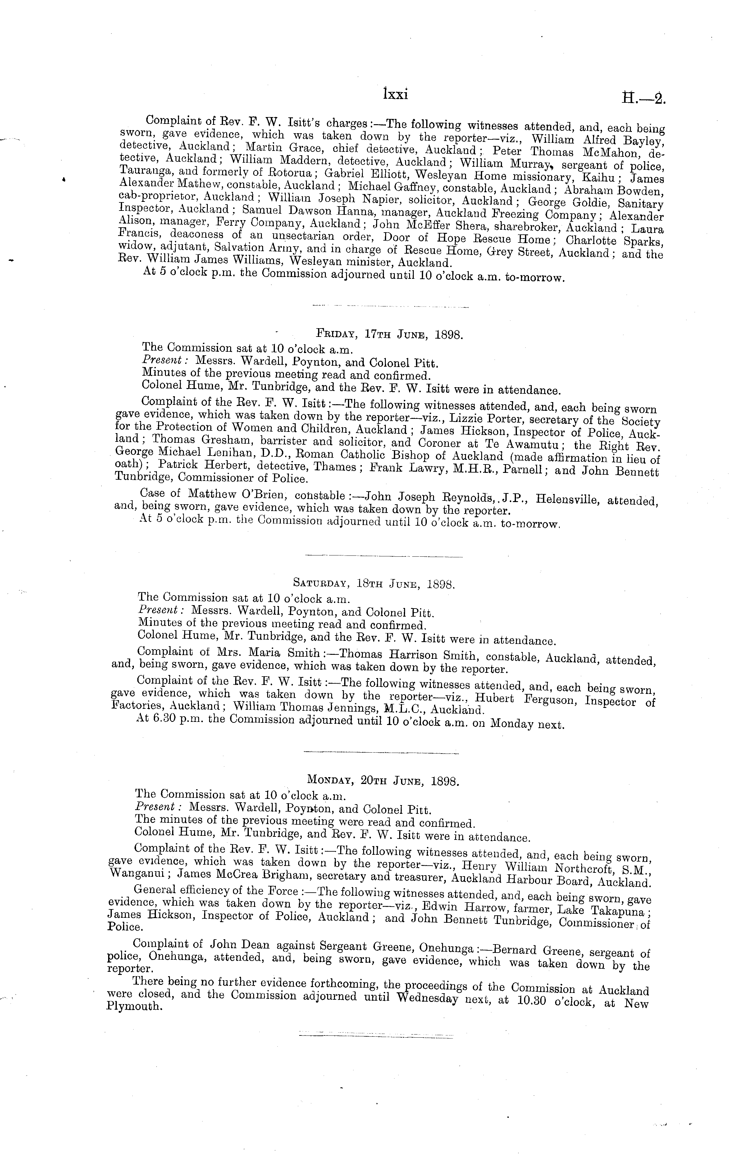 Friday, 17th June, 1898. The Commission sat at 10 o'clock a.m. Present: Messrs. Wardell, Poynton, and Colonel Pitt. Minutes of the previous meeting read and confirmed. Colonel Hume, Mr. Tunbridge, and the Eev. F. W. Isitt were in attendance. Complaint of the Eev. P. W. Isitt :-The following witnesses attended, and, each being sworn gave evidence, which was taken down by the reporter-viz., Lizzie Porter, secretary of the Society or the Protection of Women and Children, Auckland ; James Hickson, Inspector of Police 4uck land; lhomas Gresham, barrister and solicitor, and Coroner at Te Awamutu; the Eev George Michael Lenihan D.D., Soman Catholic Bishop of Auckland (made affirmation Fn lieu of itlk^t^^±l: Prank and John Bennett and, amended, At 5 o clock p.m. the Commission adjourned until 10 o'clock a.m. to-morrow.