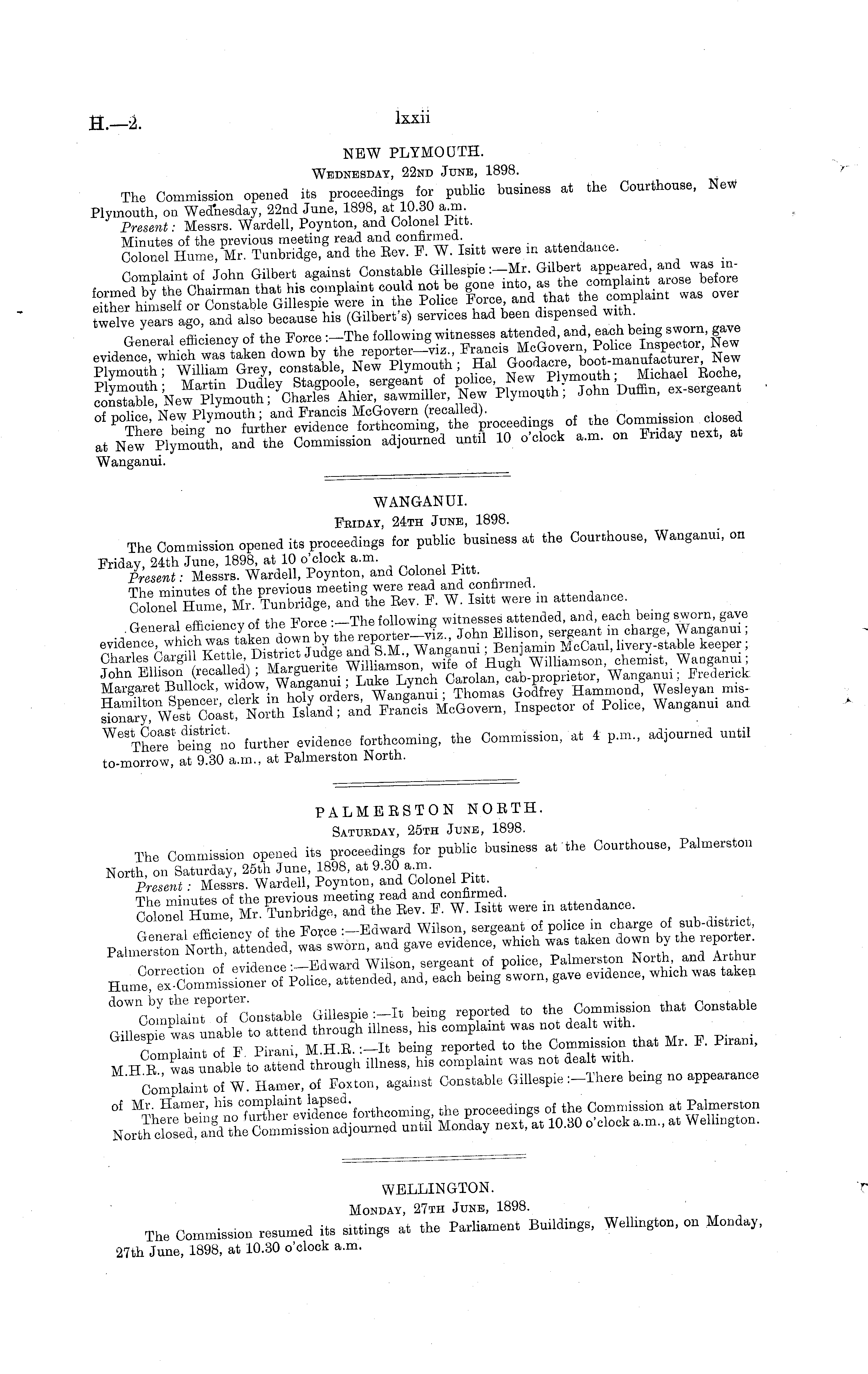 NEW PLYMOUTH. Wednesday, 22nd June, 1898. The Commission opened its proceedings for public business at the Courthouse, New Plymouth, on Wednesday, 22nd June, 1898, at 10.30 a.m. Present: Messrs. Wardell, Poynton, and Colonel Pitt. Minutes of the previous meeting read and confirmed. Colonel Hume.V Tunbridge, and the Eev. F. W. Isitt were in attendance. twelve years ago, and also because his (Gilbert's) services had been dispensed with ,t s™ Plymouth, mi the Commiwion rfjoumea until 10 o'clock a.m. on M.y oert, at Wanganui.