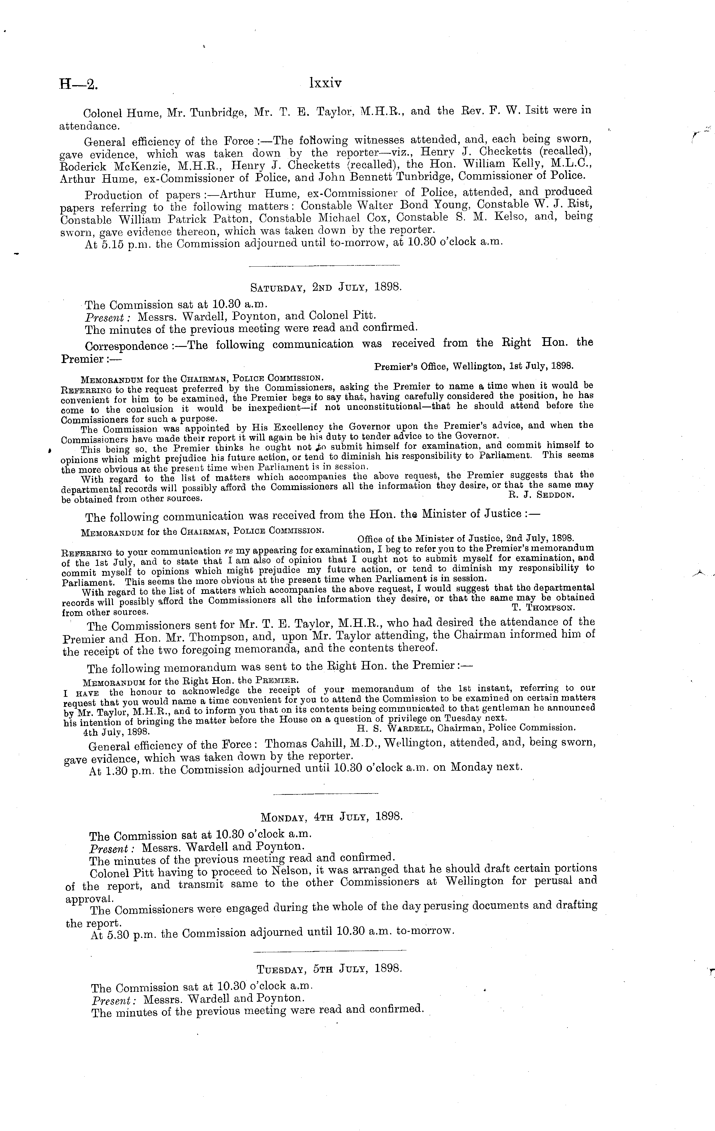 Monday, 4th July, 1898. The Commission sat at 10.30 o'clock a.m. Present: Messrs. Wardell and Poynton. The minutes of the previous meeting read and confirmed. Colonel Pitt having to proceed to Nelson, it was arranged that he should draft certain portions of the report, and transmit same to the other Commissioners at Wellington for perusal and aPPr T V he Commissioners were engaged during the whole of the day perusing documents and drafting At 5.30 p.m. the Commission adjourned until 10.30 a.m. to-morrow.